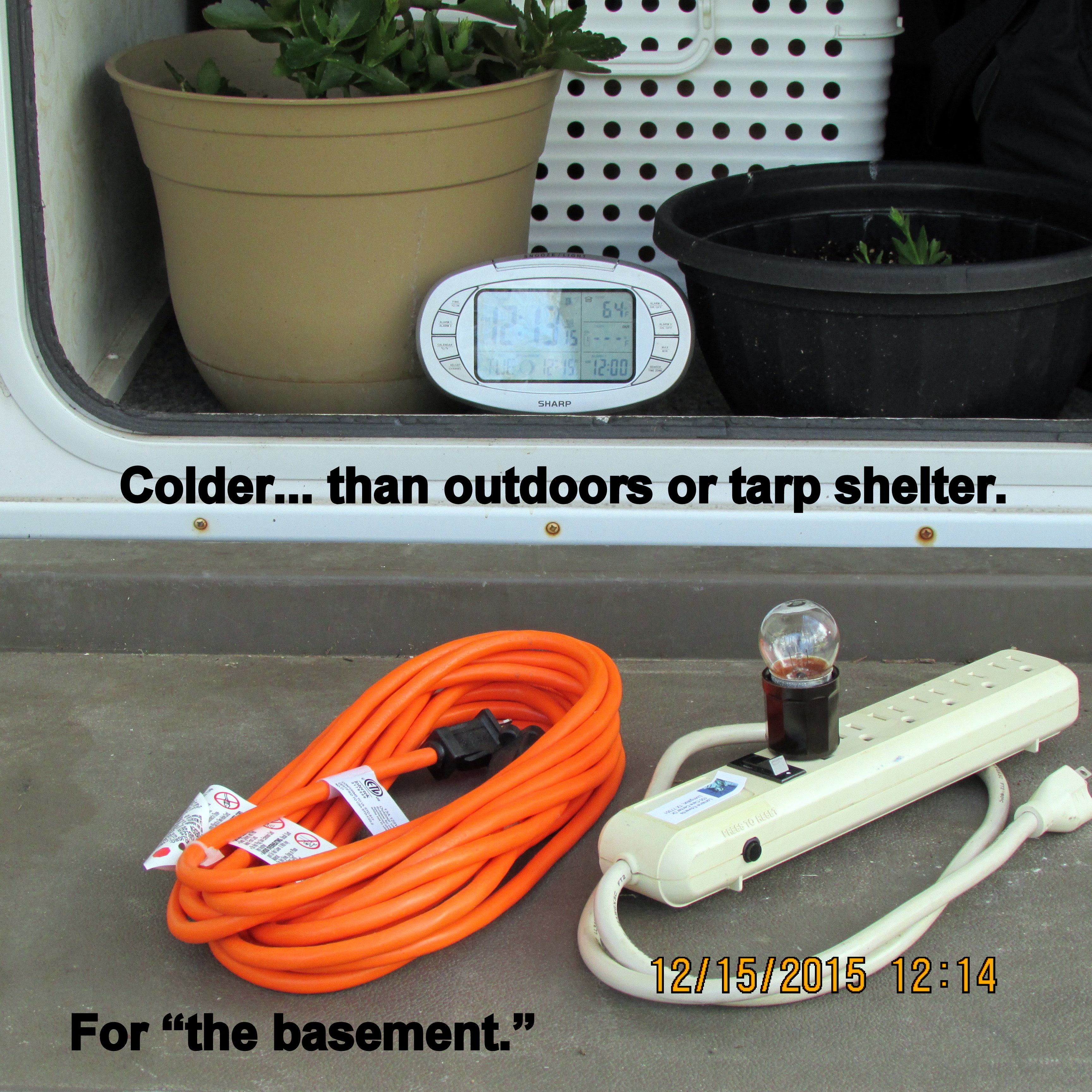 Colder in the basementPostscript, Tuesday, December 15, 2015, 12:30 PM: Maybe “the basement” wasn’t such a good idea? Look: Colder than outdoors or tarp shelter. At the suggestion of a dear friend, I’ll add a light bulb for warmth. (That bulb too small?)