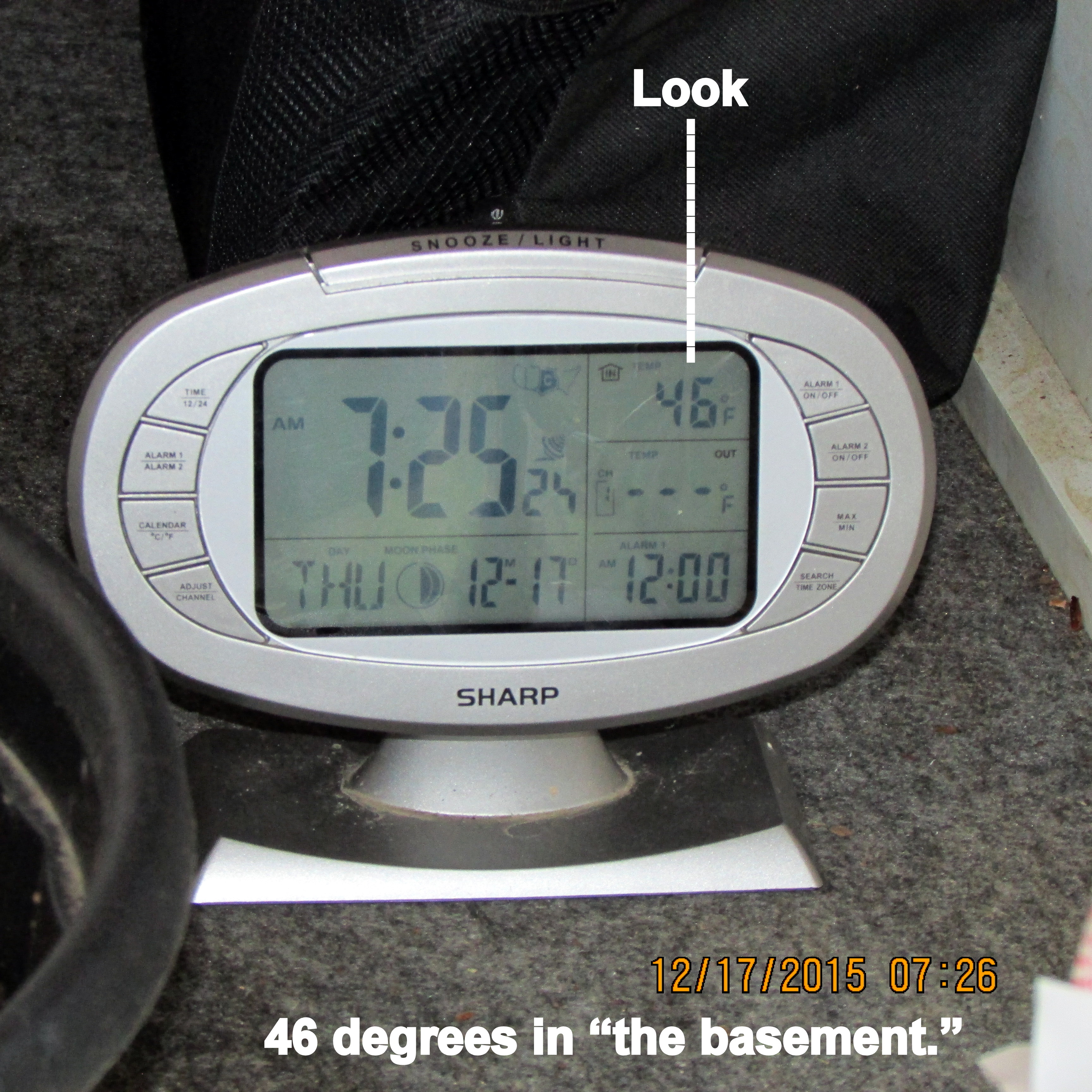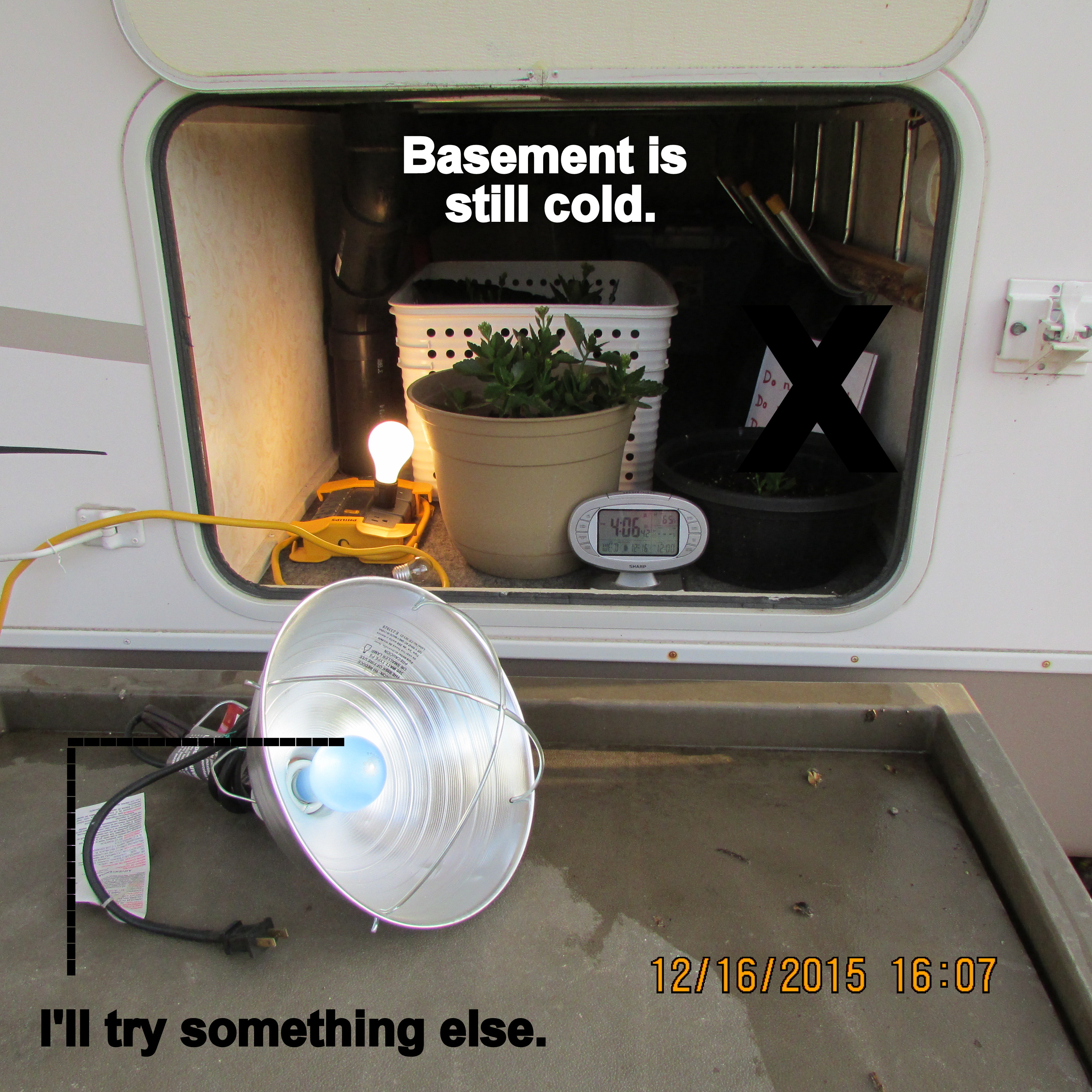 Postscript, Thursday, December 17, 2015, 8:00 AM: The light bulb seems to make a seven or eight degree improvement in the temperature of the basement.