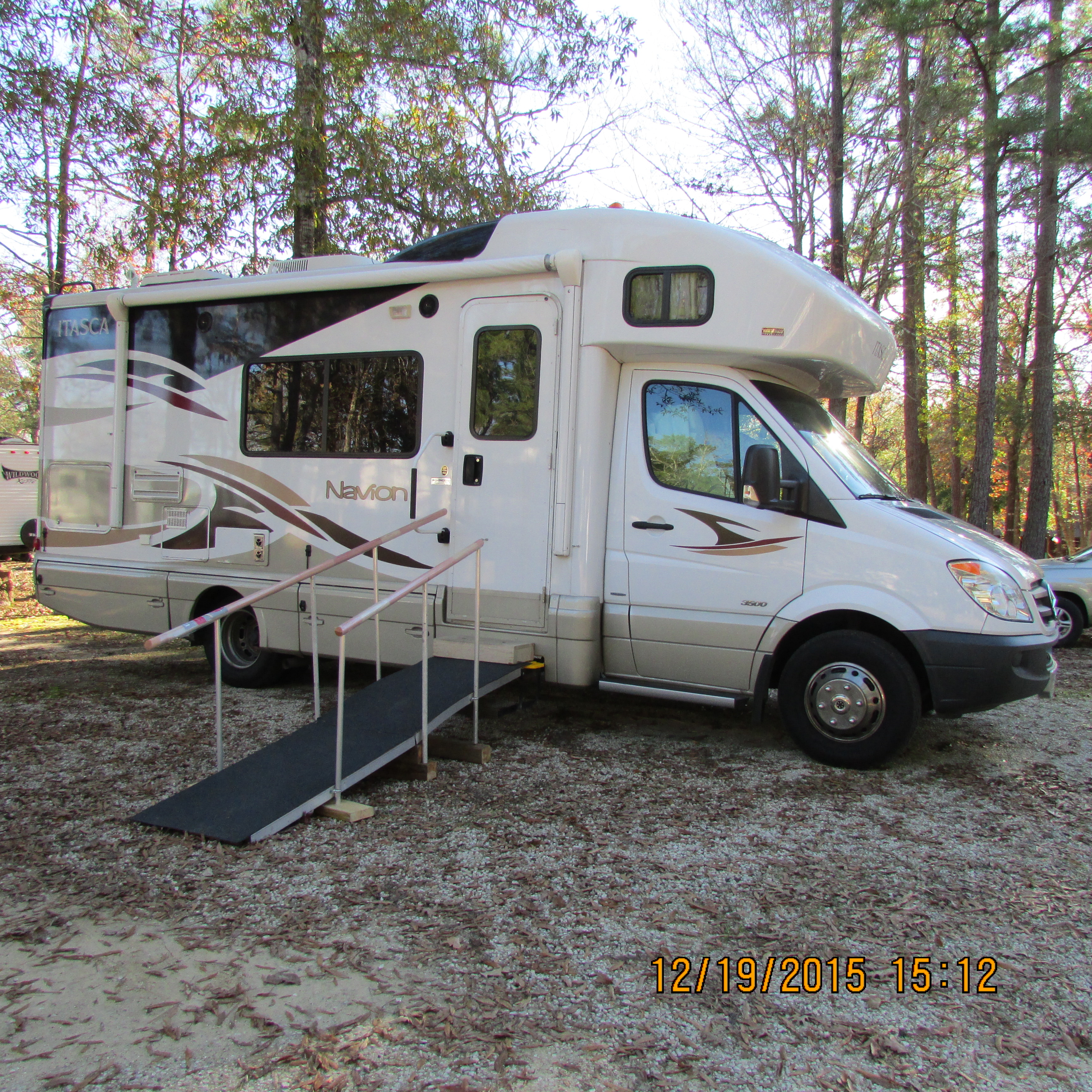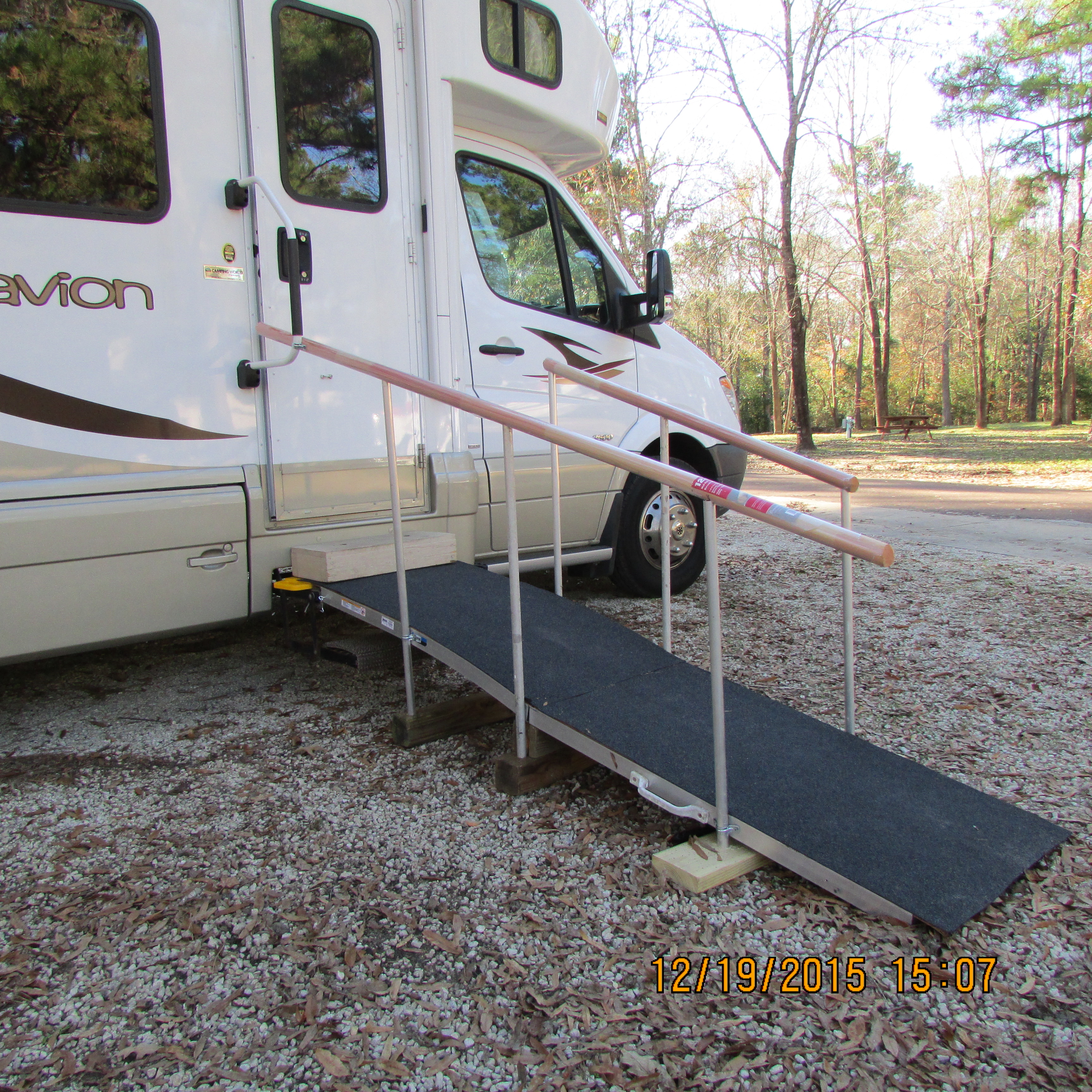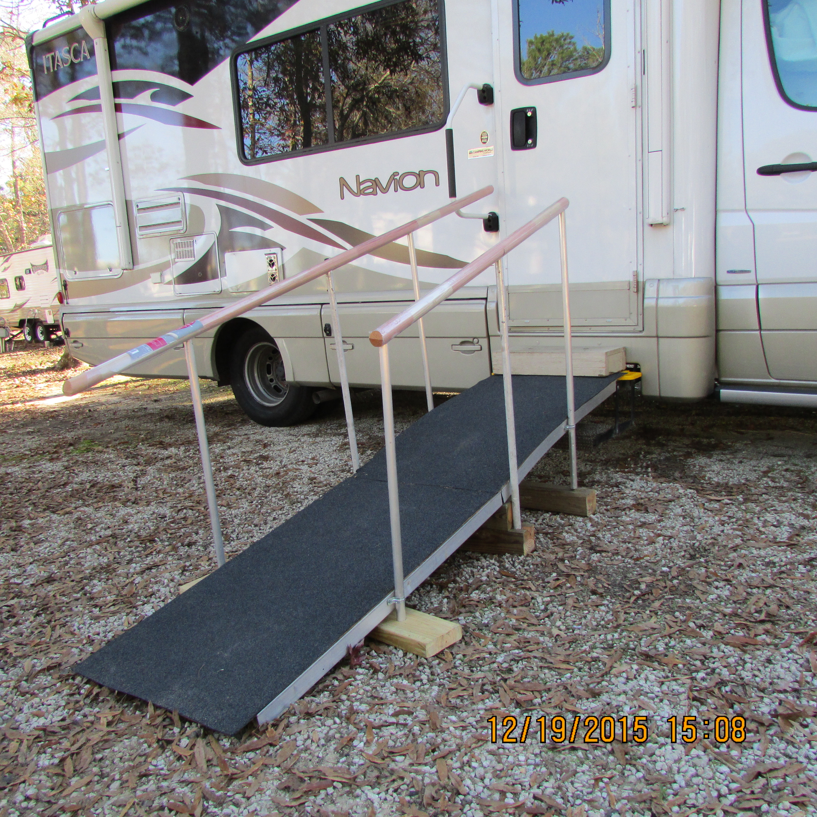 My friend, David Wolfe, used ingenuity to build a ramp for an RVer. It folds… and can be moved inside the Class C motorhome.