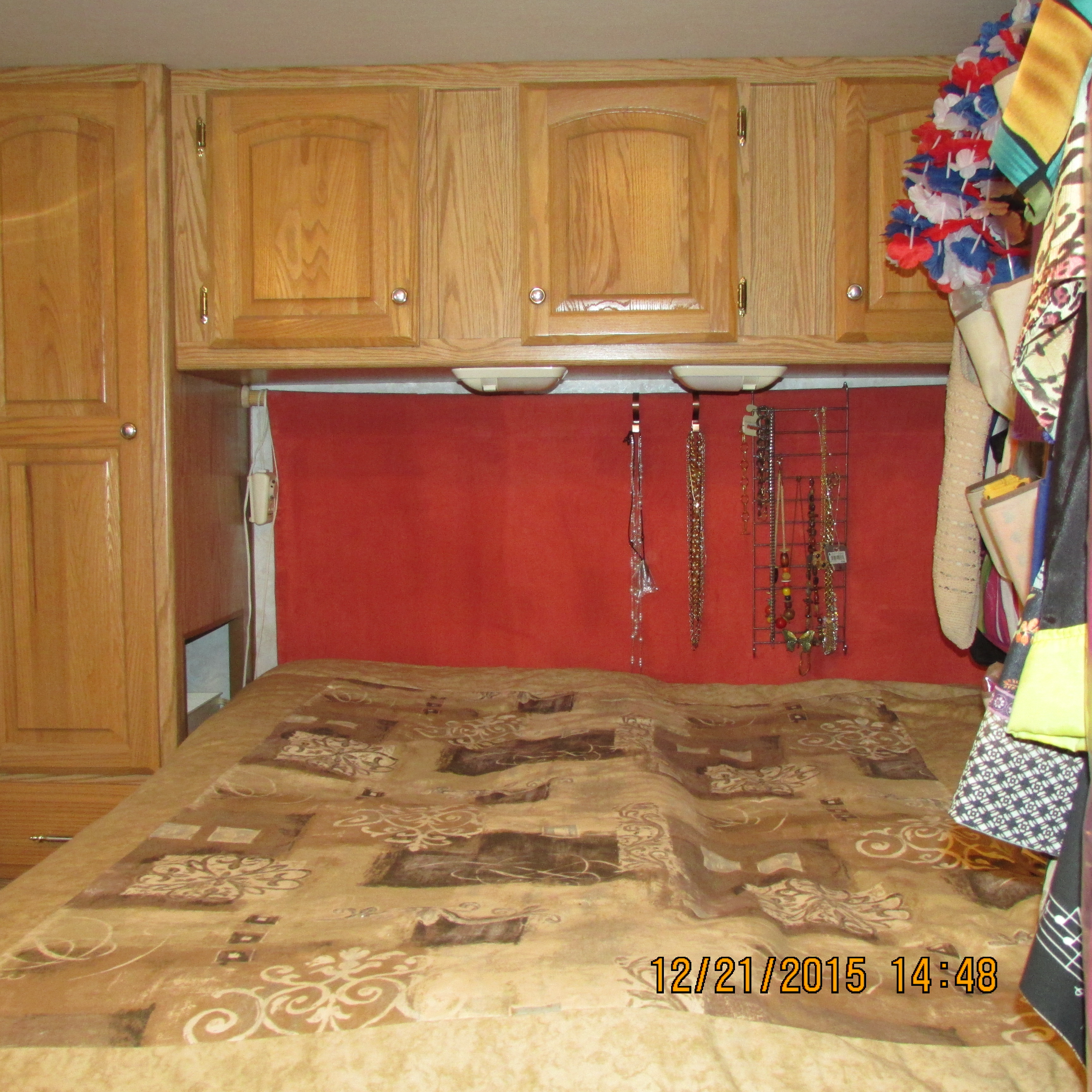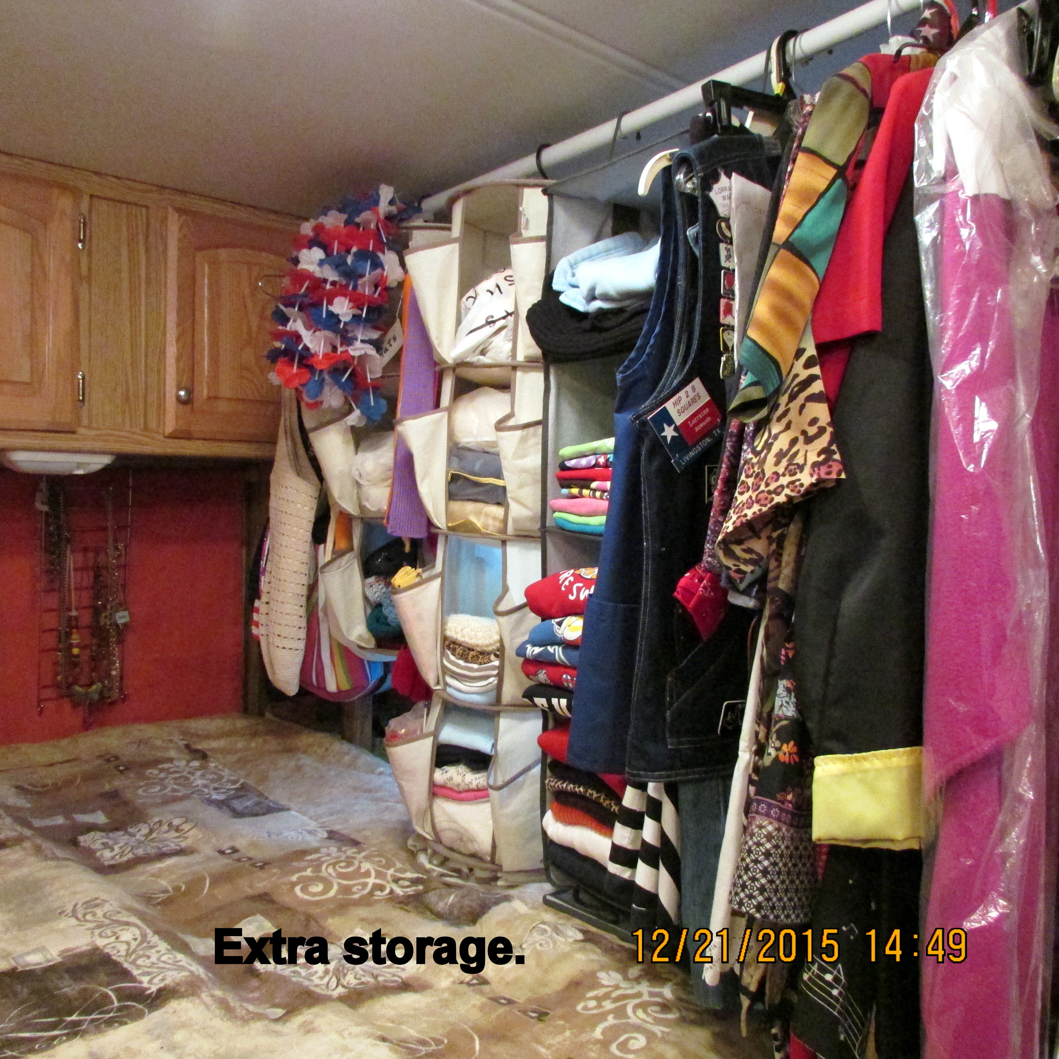 The bed is such a convenient place to “pile” things!! Sorting items with an eye to donations, I was forced to clear the bed. 😉 I have so-o little closet space, 😦 I was inspired to install the extra clothes pole over the side of the bed. 🙂