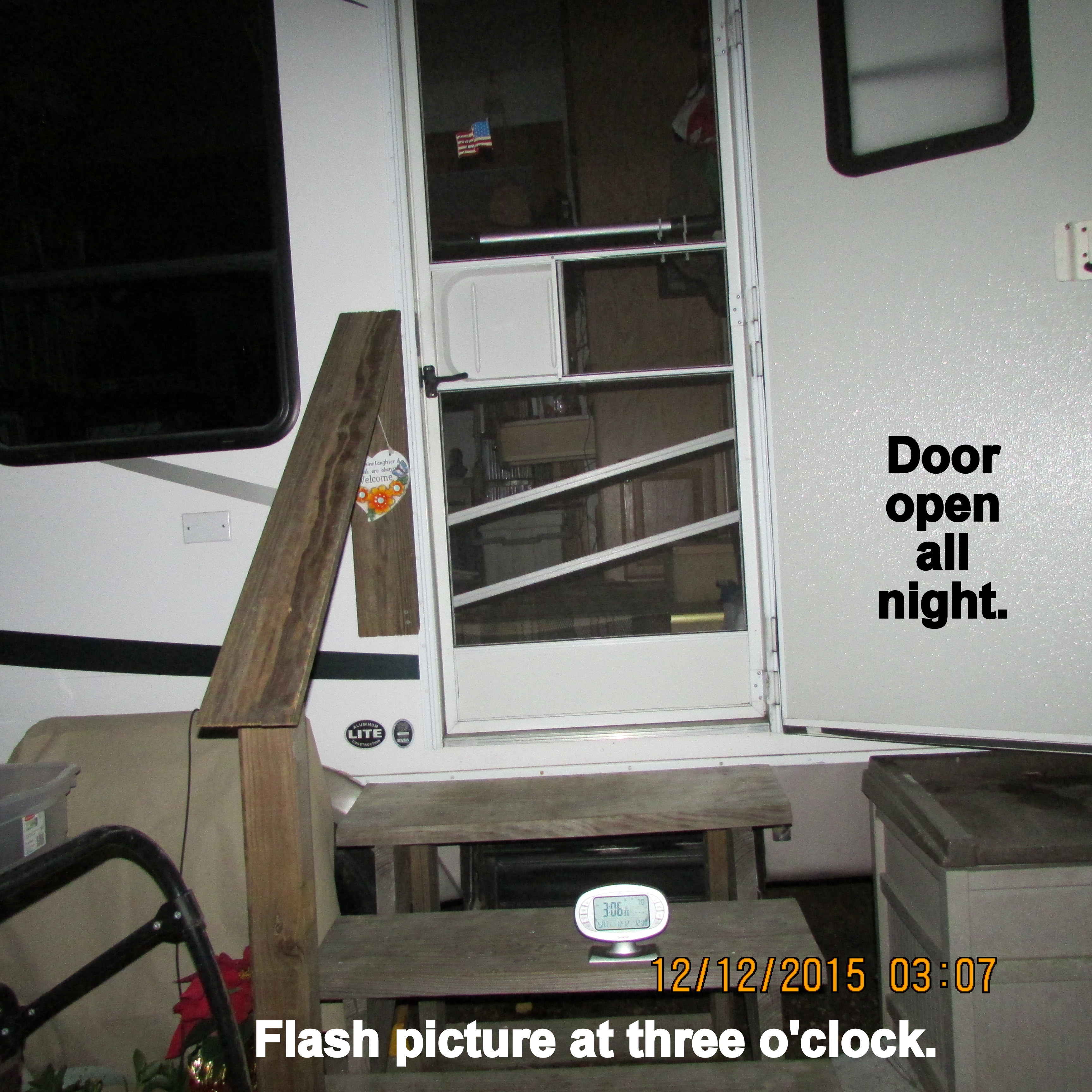 8:30 Update: I stood on the steps outside my door and took telephoto pictures (because raining hard now). The ladder was actually in a protected area behind my trailer so the wind (or wind gust) was strong enough to push it over. Likewise, the base of the garden flag pole had two heavy weights.