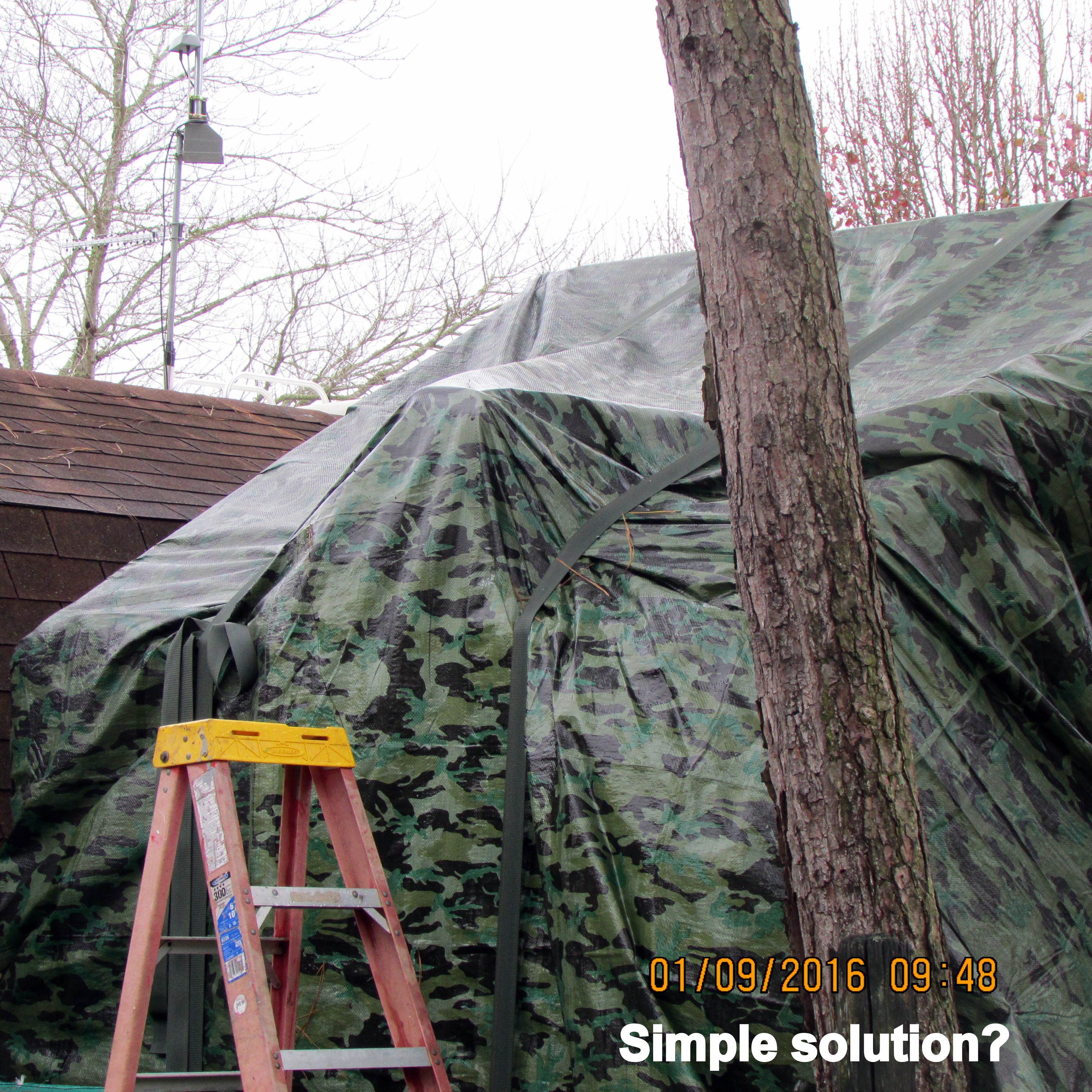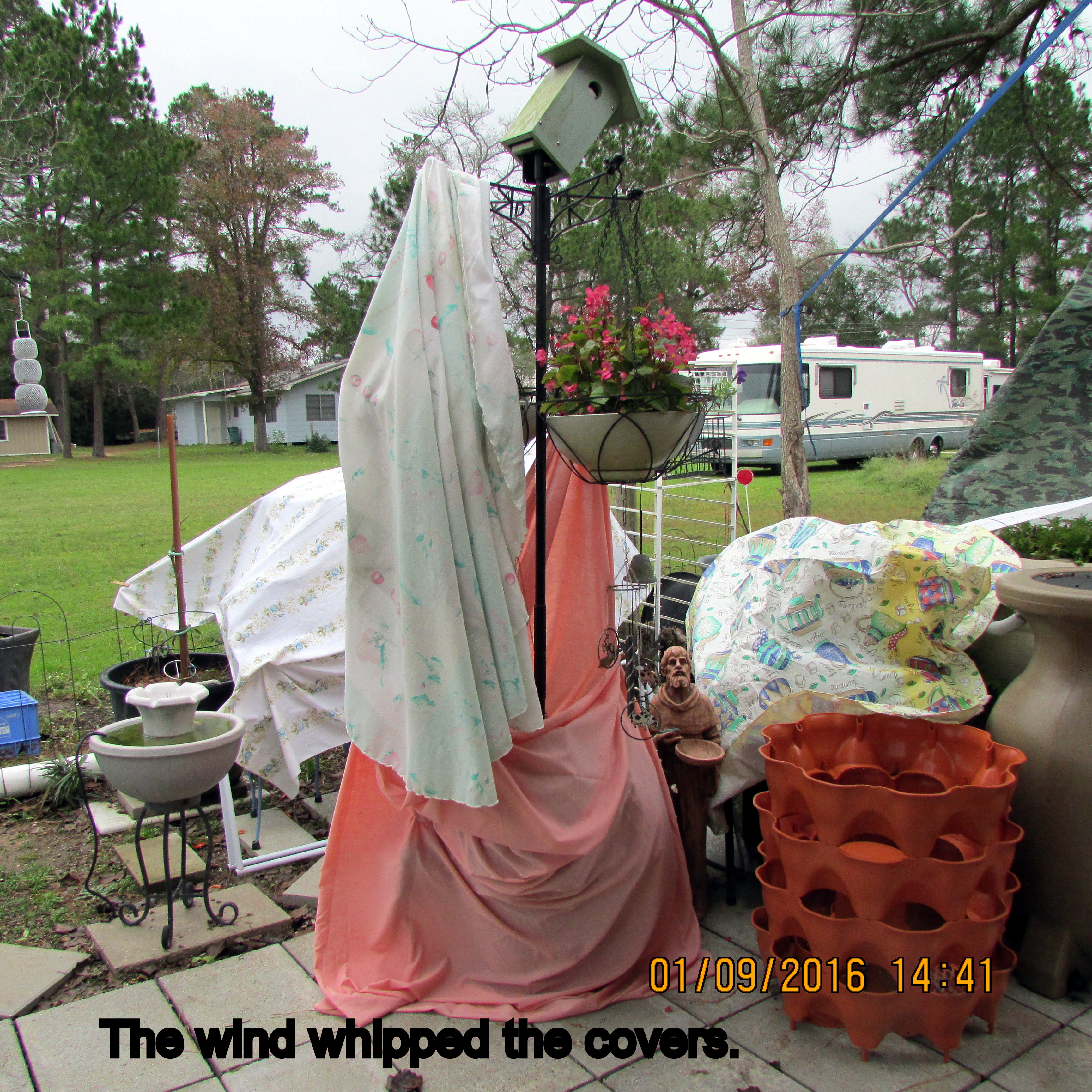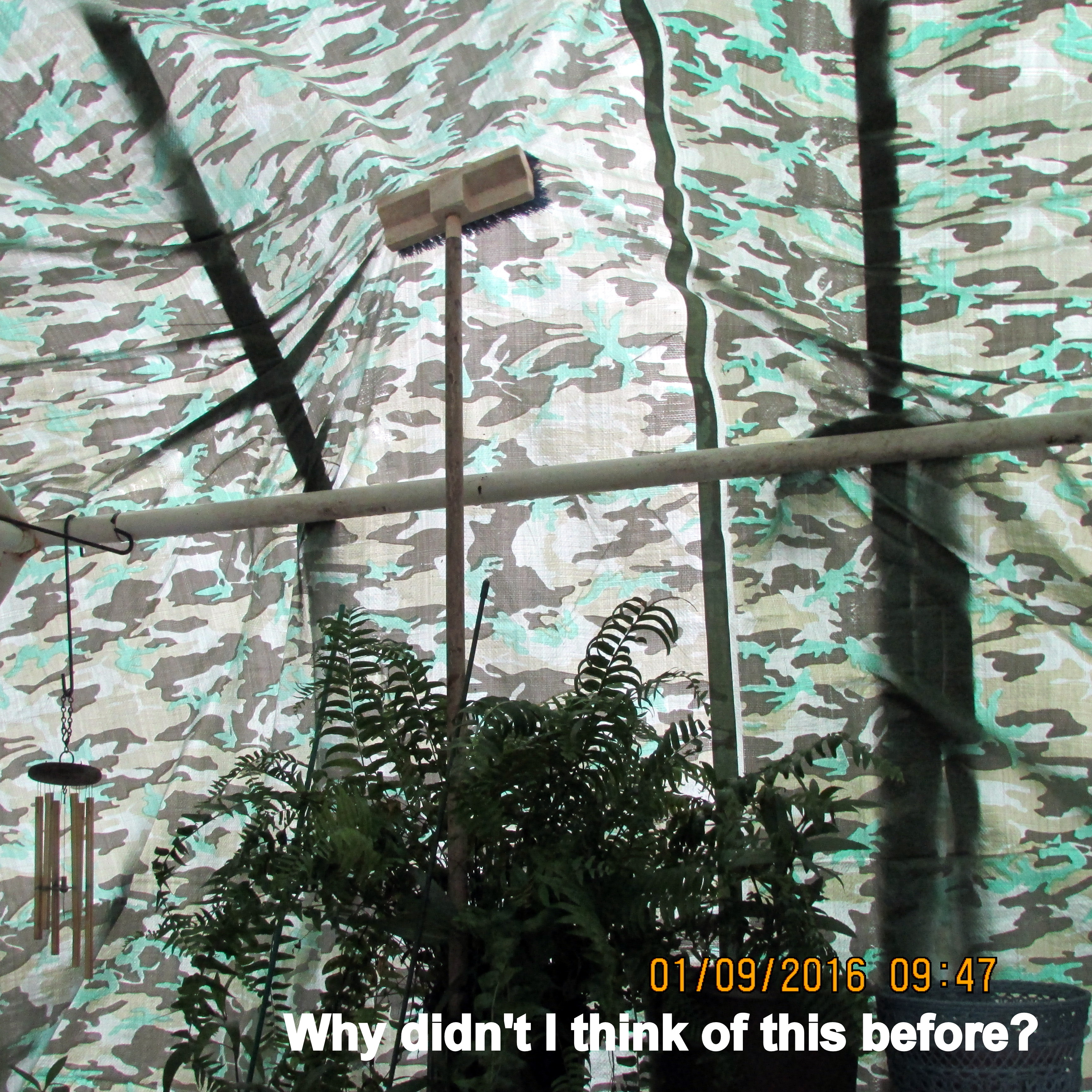 Well, in some cases, you can teach an old dog a new trick. I set up the ladder and dipped out the water!! I then forced the broom handle into one of the planters and hope it will stay in place and prevent water from accumulating on the tarp roof. I started covering plants again because freezing temperatures predicted for tonight and Sunday night. Burr-r-r-r it’s cold outdoors!!