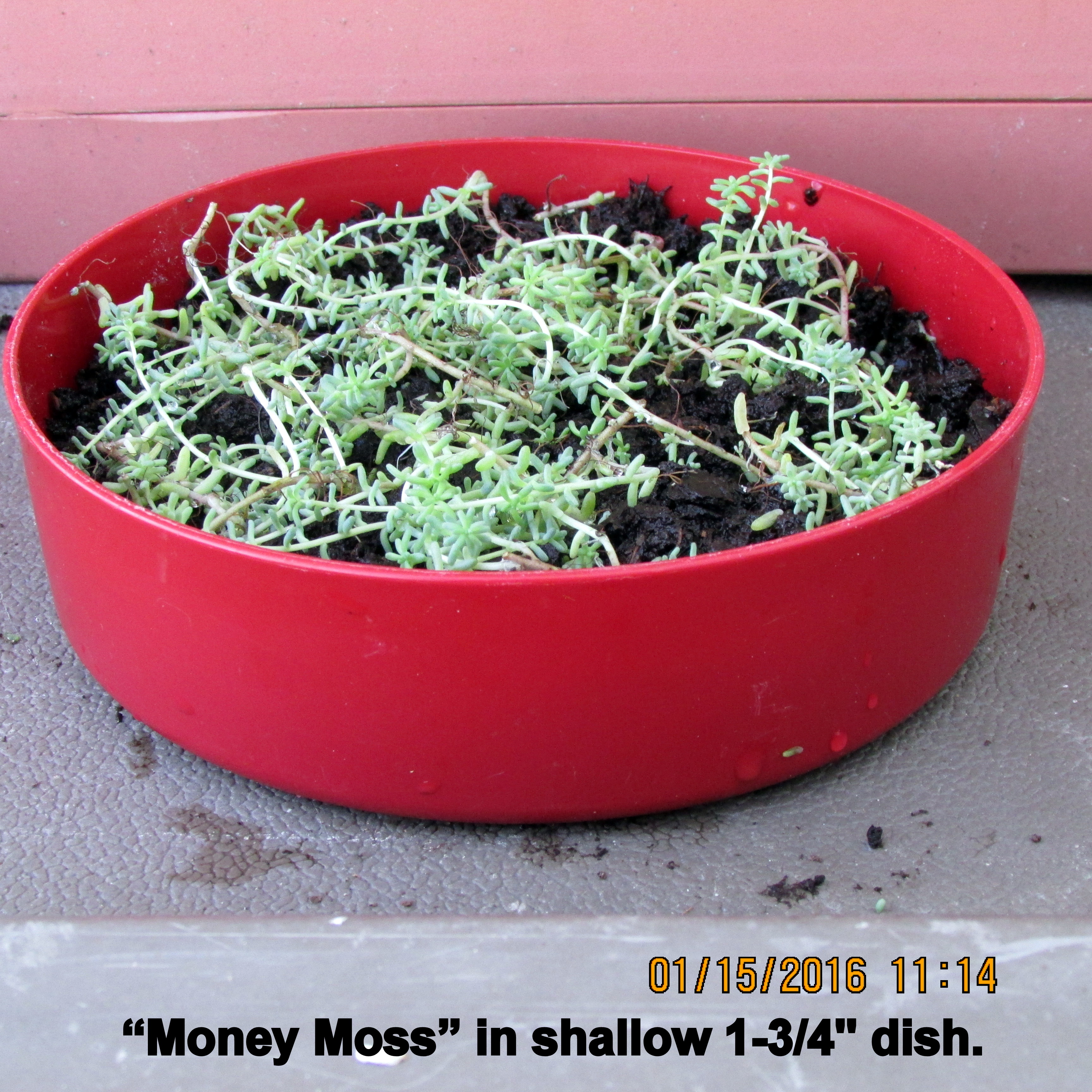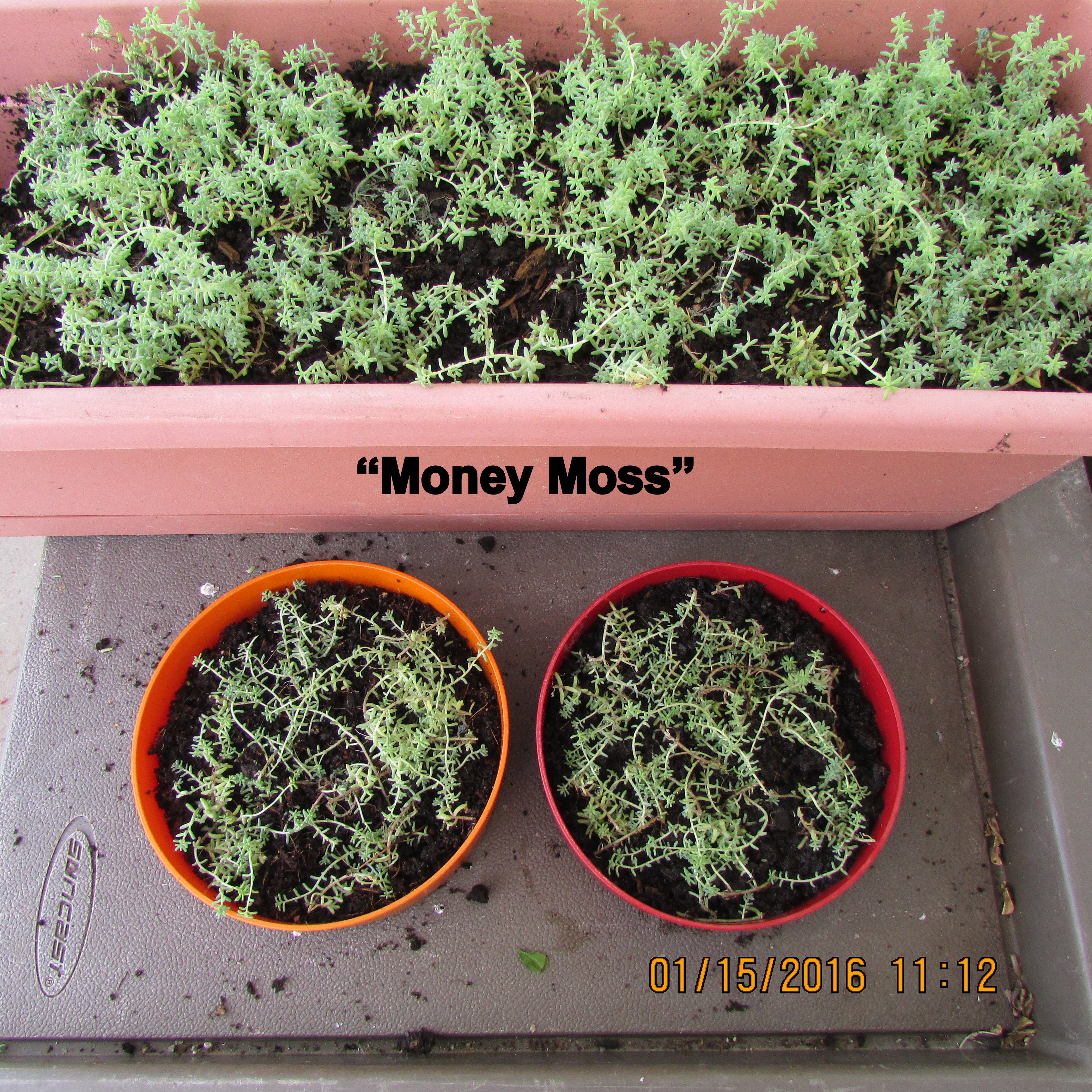 My plan: On nice days, I’ll put the plants out for sunshine. Hopefully, beautiful blooms on the Kalanchoe when I take them, for sale, at Thrift ‘n Gift Shop. ~~ “Money Moss” en route, also, to T ‘n G.