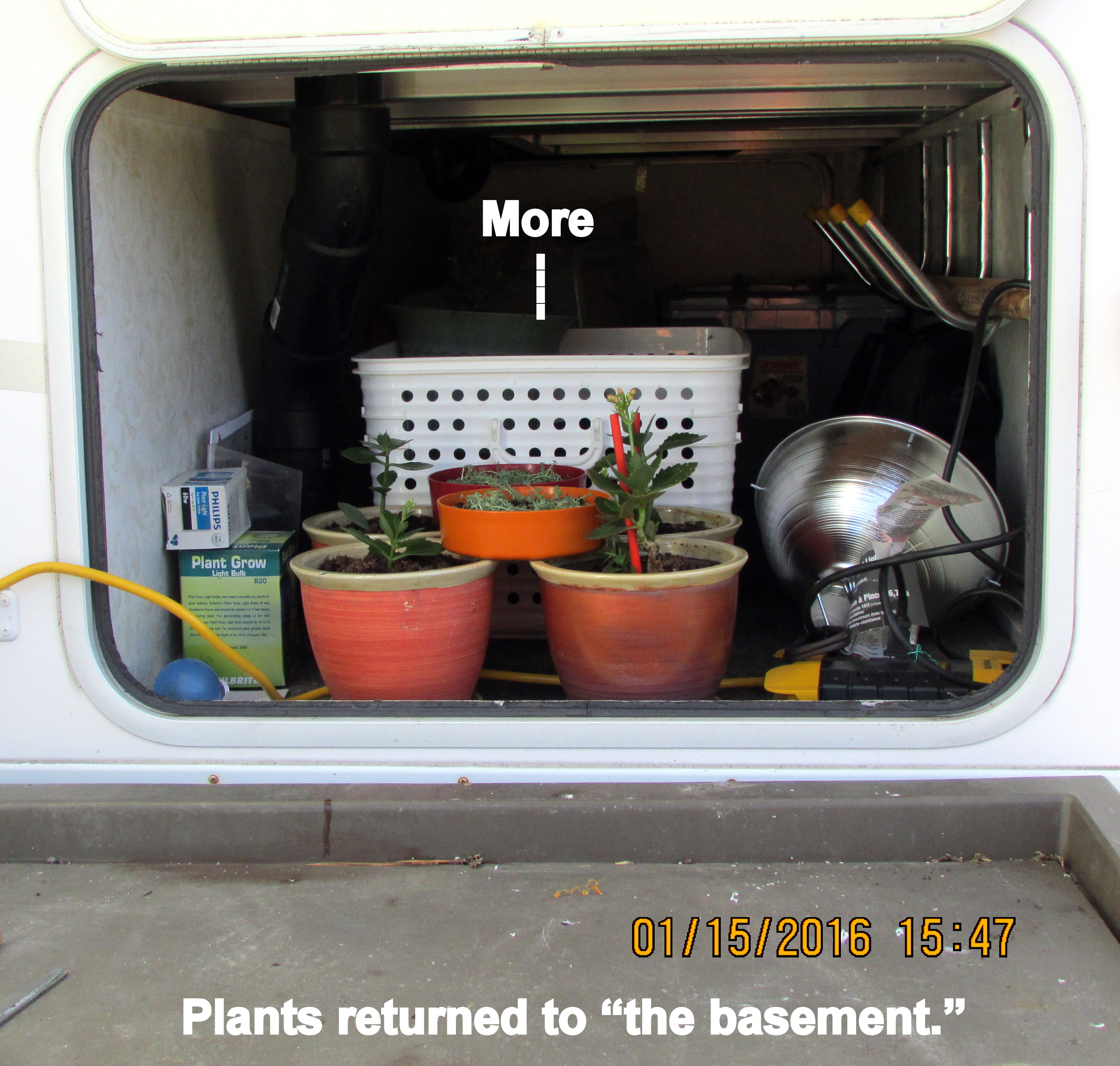 I thought my day was over when I entered the trailer and started this blog. The five o’clock Houston TV news meteorologist detailed the weather for the next few days so I rushed outdoors to move all the plants under cover. Tonight we’ll have rain–and my plants are too delicate for a soaking rain. Tomorrow (Thursday) or Friday, all the plants need to be under cover and/or covered with sheets. Friday night/Saturday morning we may have the coldest night of Fall 2015/Winter 2016–28 degrees or colder.