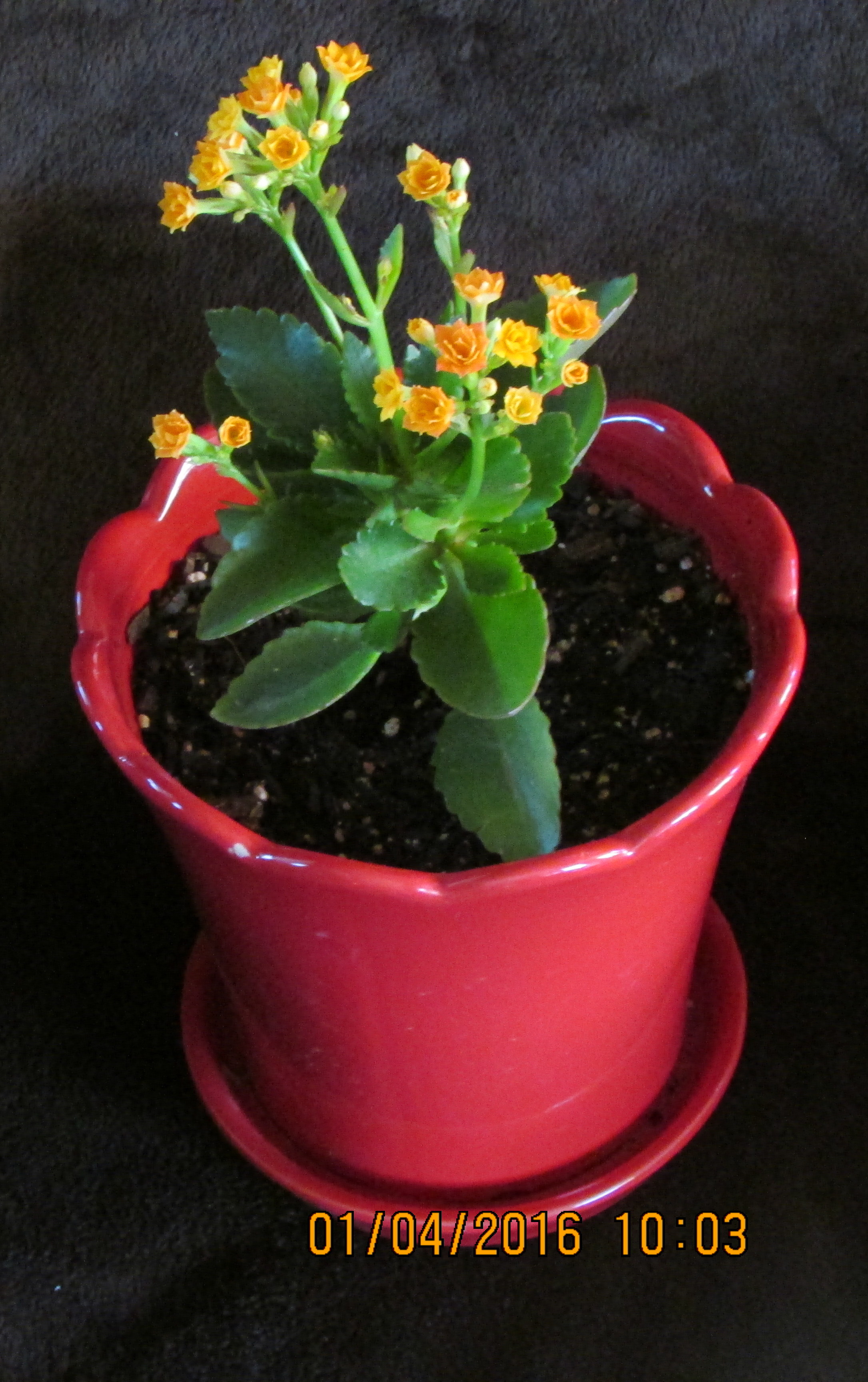 The weather is delightful!! Yesterday afternoon, I swept leaves, raked leaves, pulled weeds, filled bird feeders, etc. Fifty-three degrees outdoors as I write this at 10:30. Beautiful sunshine; blue sky!! ~~ Indoors, my Kalanchoe is getting prettier every day!! It amazes me that a “cutting” would stay green, and bloom.