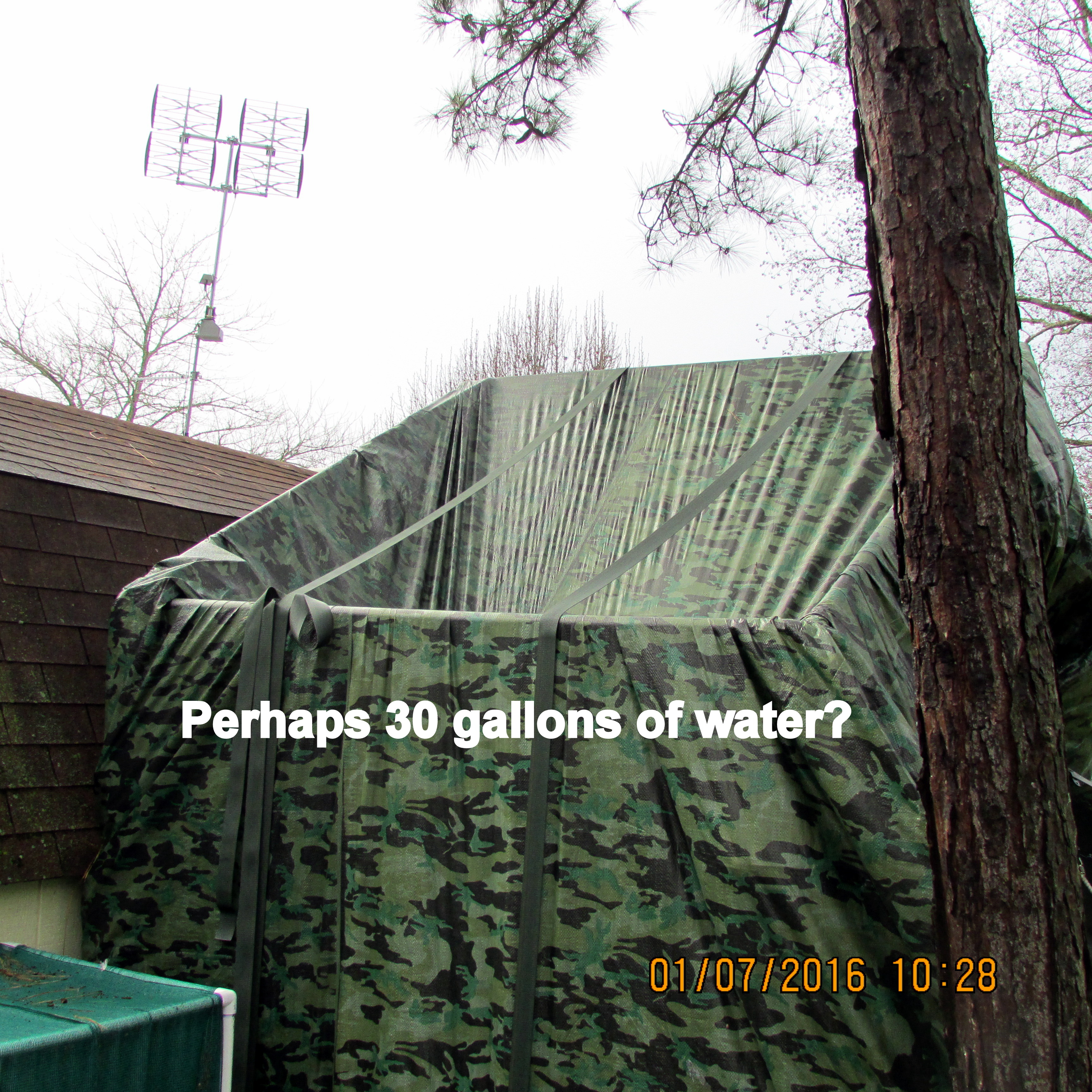 One of the CARE volunteers came to my rescue. It was too heavy, I couldn’t push the water off the tarp roof. ~~ Next time (if there is a next time) I’ll set up a ladder and dip out most of the water. Eventually, I’ll have another long “tie down” across the pipe frame on the inside. It would be a major task now because the plants, shelves, and table would have to be removed so we had access. ~~ During the morning, I swept leaves, cleaned and filled bird feeders, and removed covers from the plants (soaking wet covers).