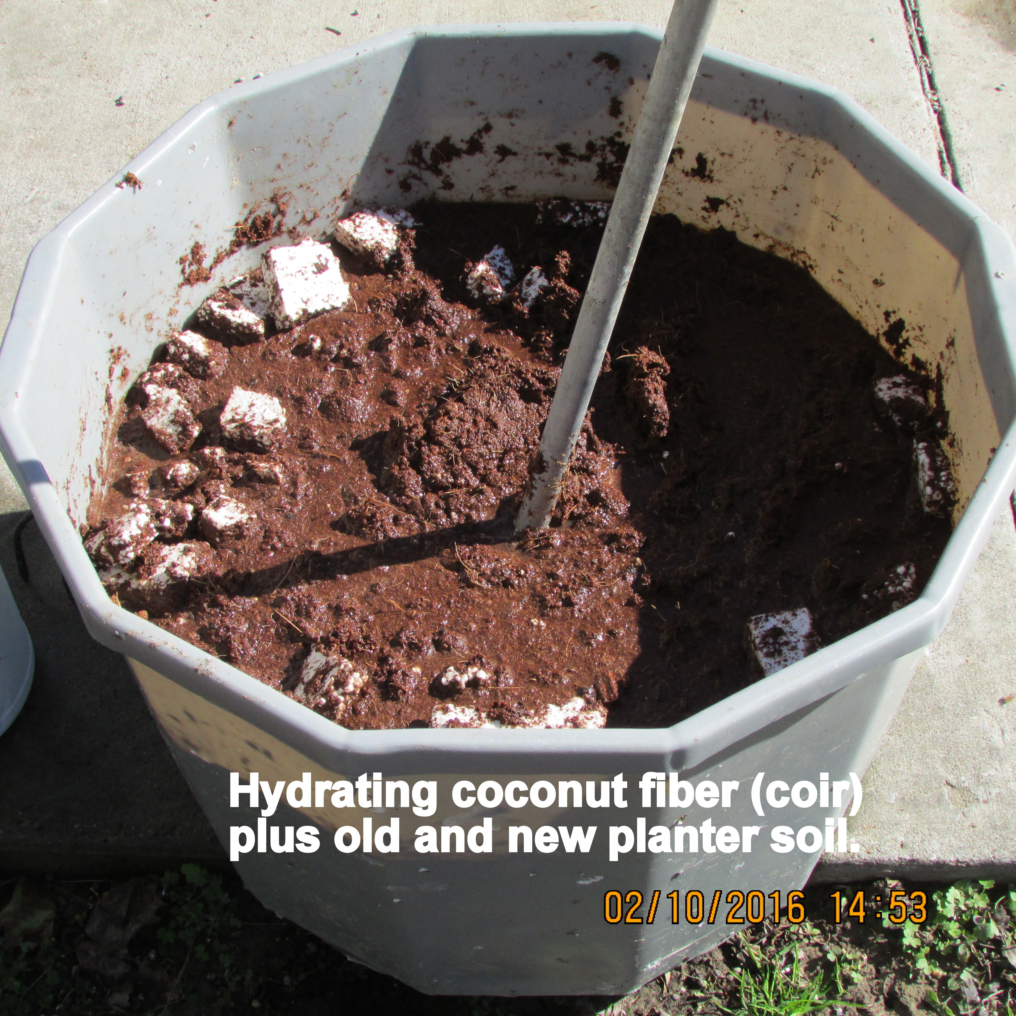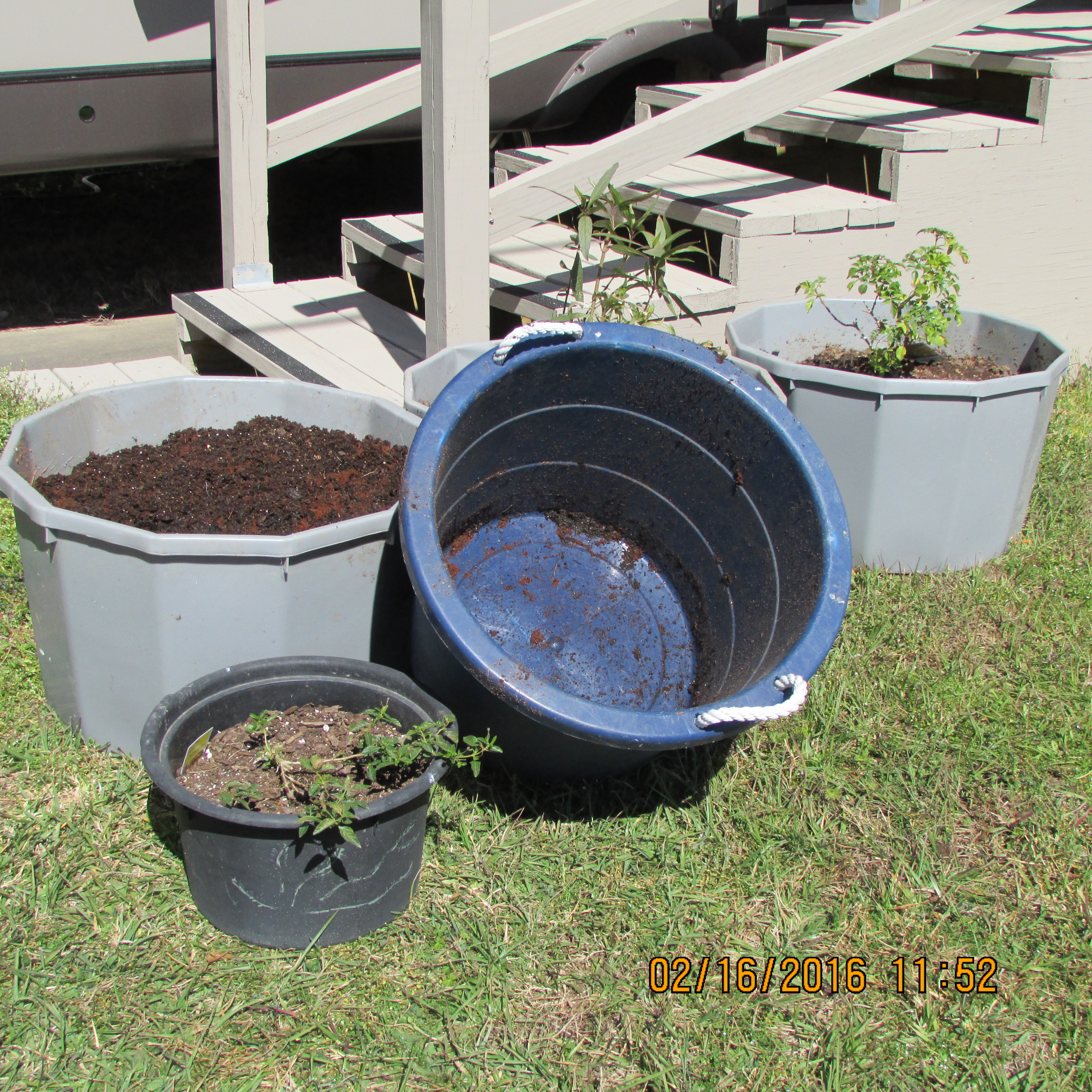 Many months ago, a lady-friend expressed the desire for planters in front of her porch. On a very nice Wednesday afternoon, February 10, I started the project. First, I began to hydrate a block of coconut fiber (coir). Second, I added some old, and new, planter soil. Mark down plants–purchased at Lowe’s last Fall–are ready for transplant. ~~ I checked the Old Farmer’s Almanac for information because I’m eager to give the plants the best possible start. Fortunately, gratefully, it is an ideal time to transplant/plant by the moon. (“More bang for the buck.”) Currently, midget-size plants in relation to the super-size planters but Cape Honeysuckle, Mexican Petunia, and Lantana will thrive in that sunny location.