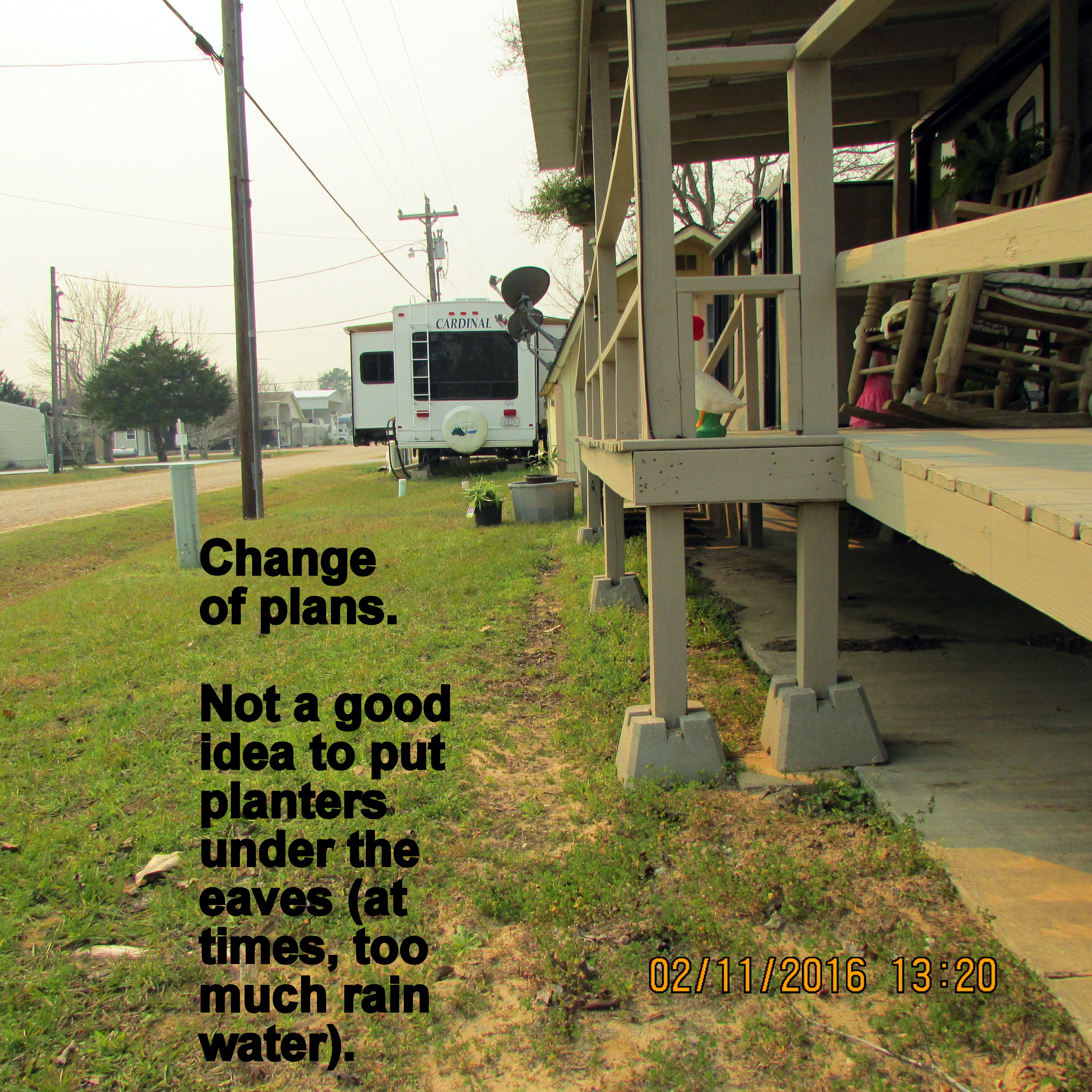 Continuing, Thursday, February 11, 4:00 PM: I’m weary; strenuous exercise!! ~~ I lost sleep last night thinking about problem of planters under the eaves. One hard rain and the planters would be flooded (and “drought resistant” plants would suffer–and die?). ~~ I questioned my friend and relocation was fine with her (or no planters at all). To move the planters further from porch is prohibited because they would interfere with riding lawn mower. ~~ Two containers, adding soil, and transplanting six plants, were enough lifting for this old lady. The third planter will be added soon.