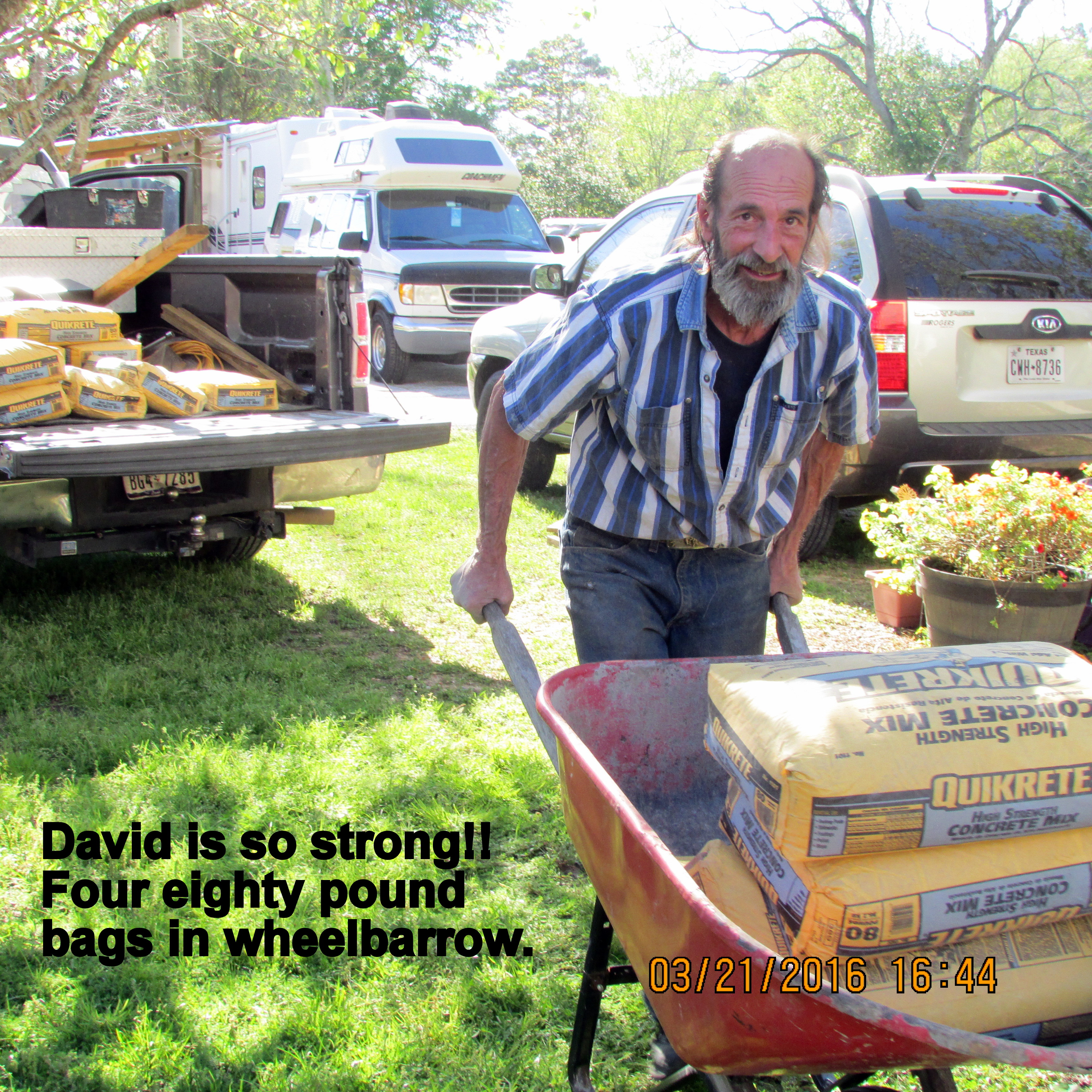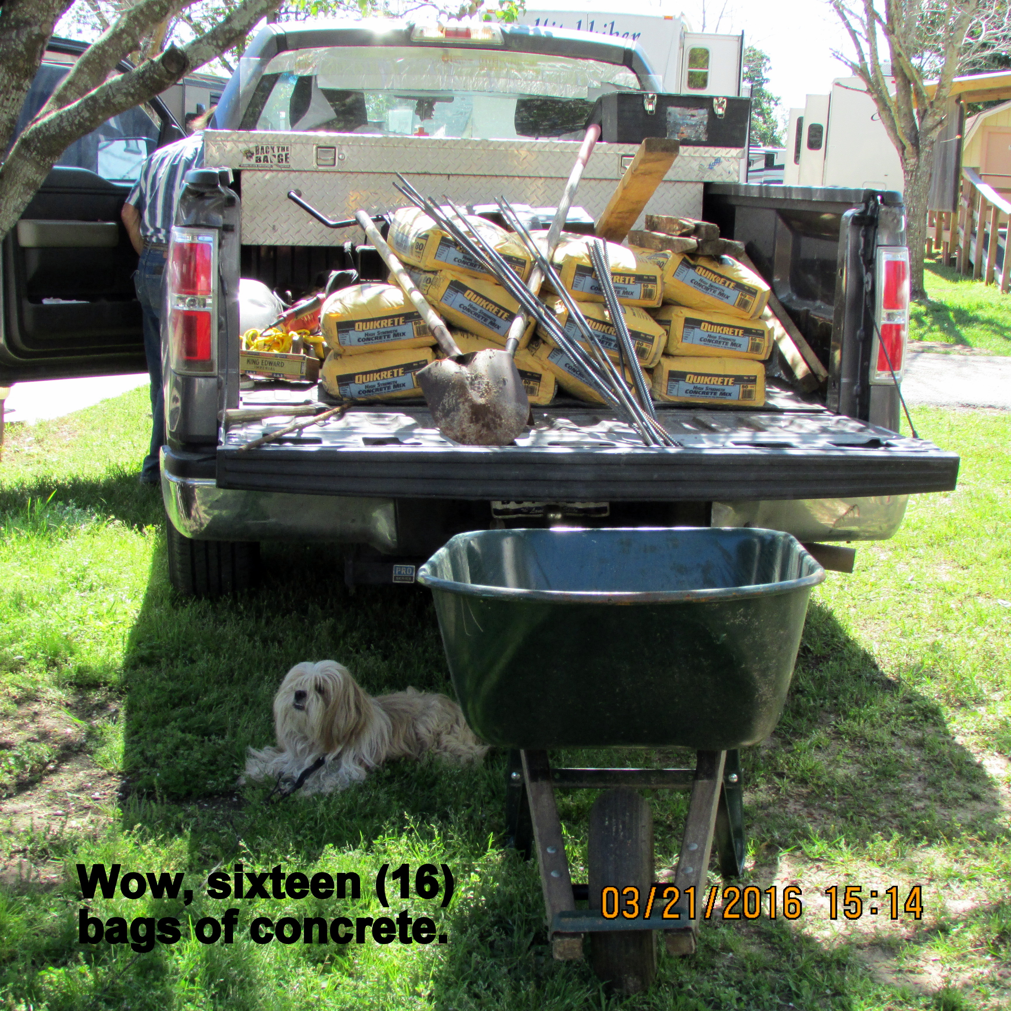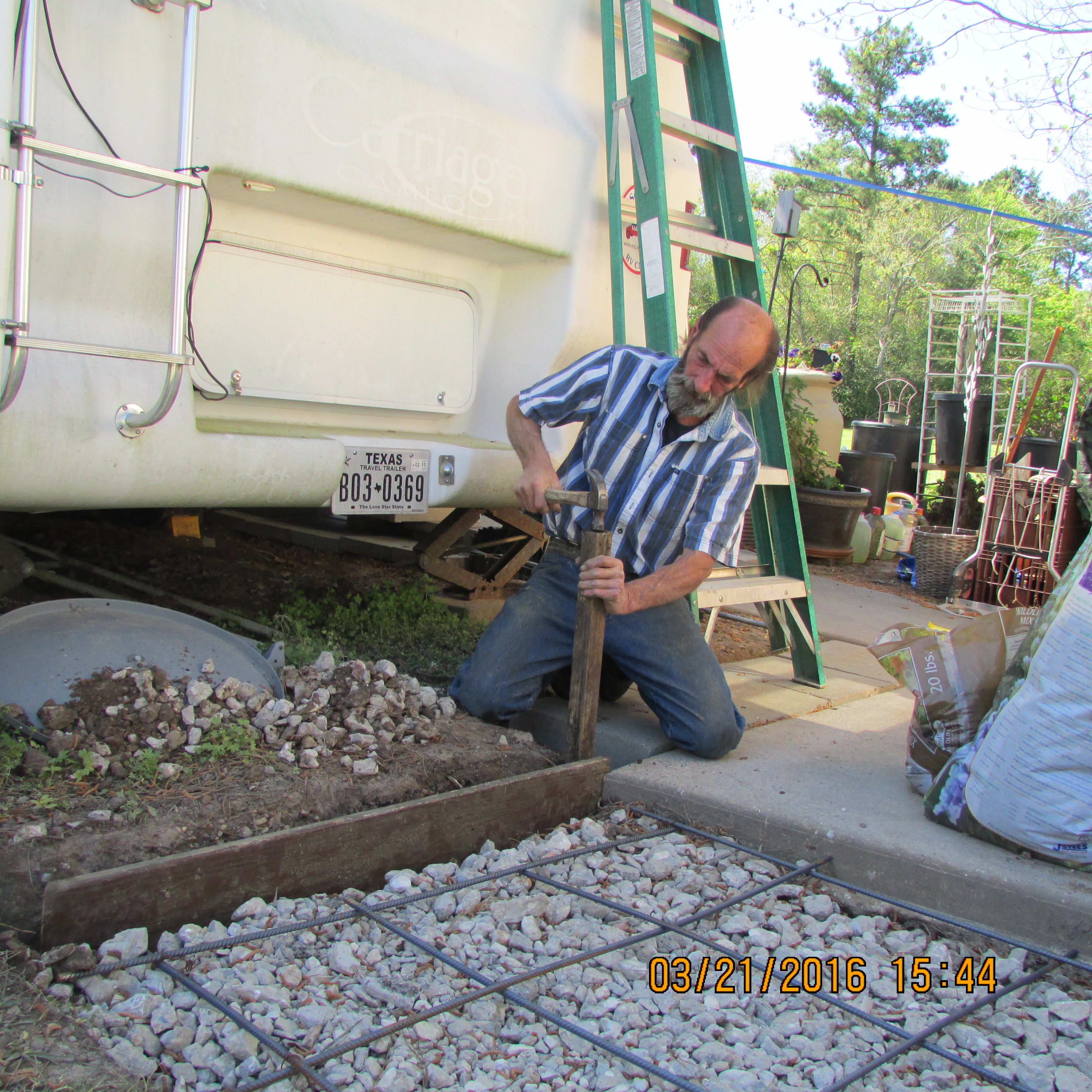 My extra busy, extremely talented, handyman arrived about three-ten. I’m so grateful for his help!! I want the concrete pad at the southeast corner of my RV site for my Garden Tower. ~~ “We” worked until dark!! ~~ Then I covered my tender plants again.