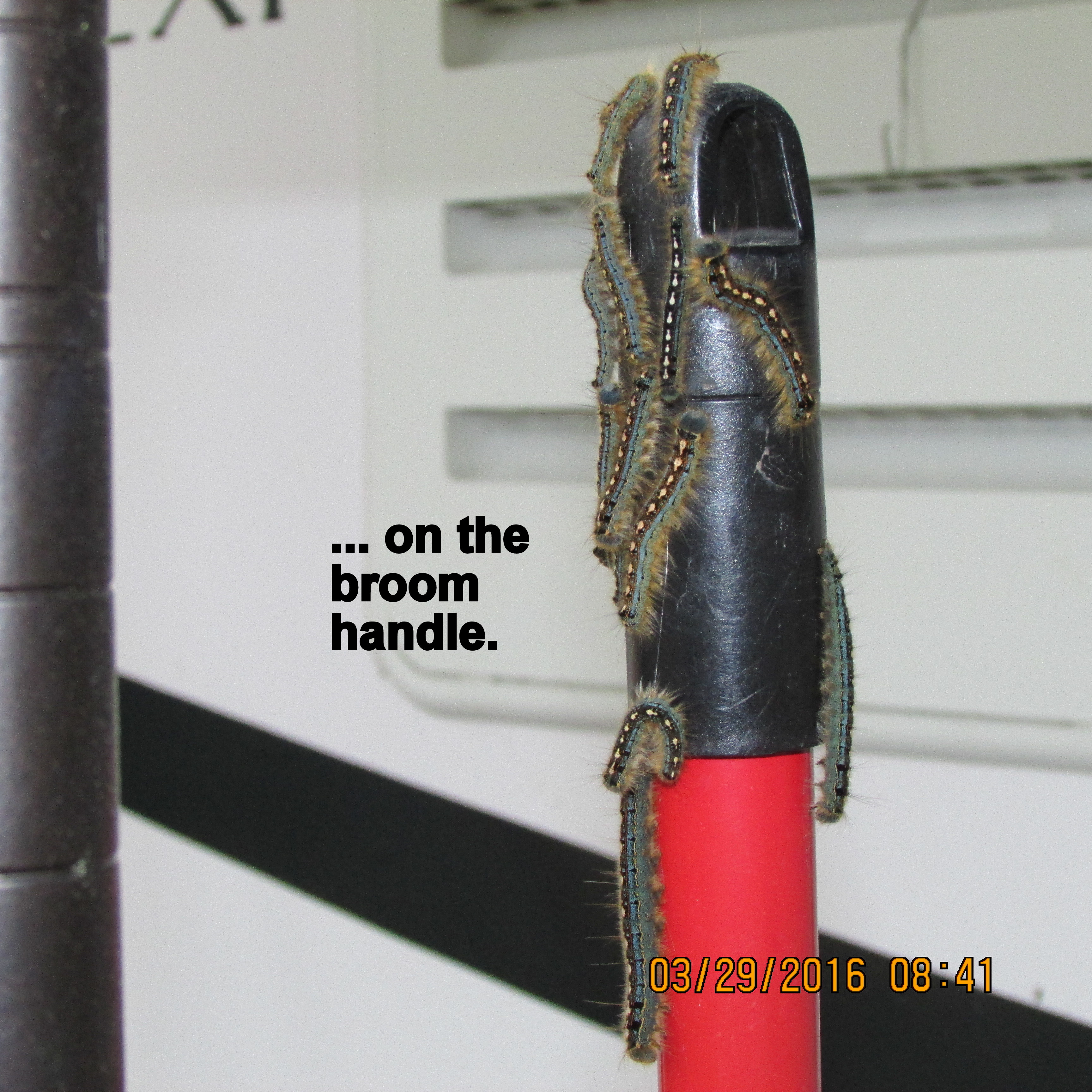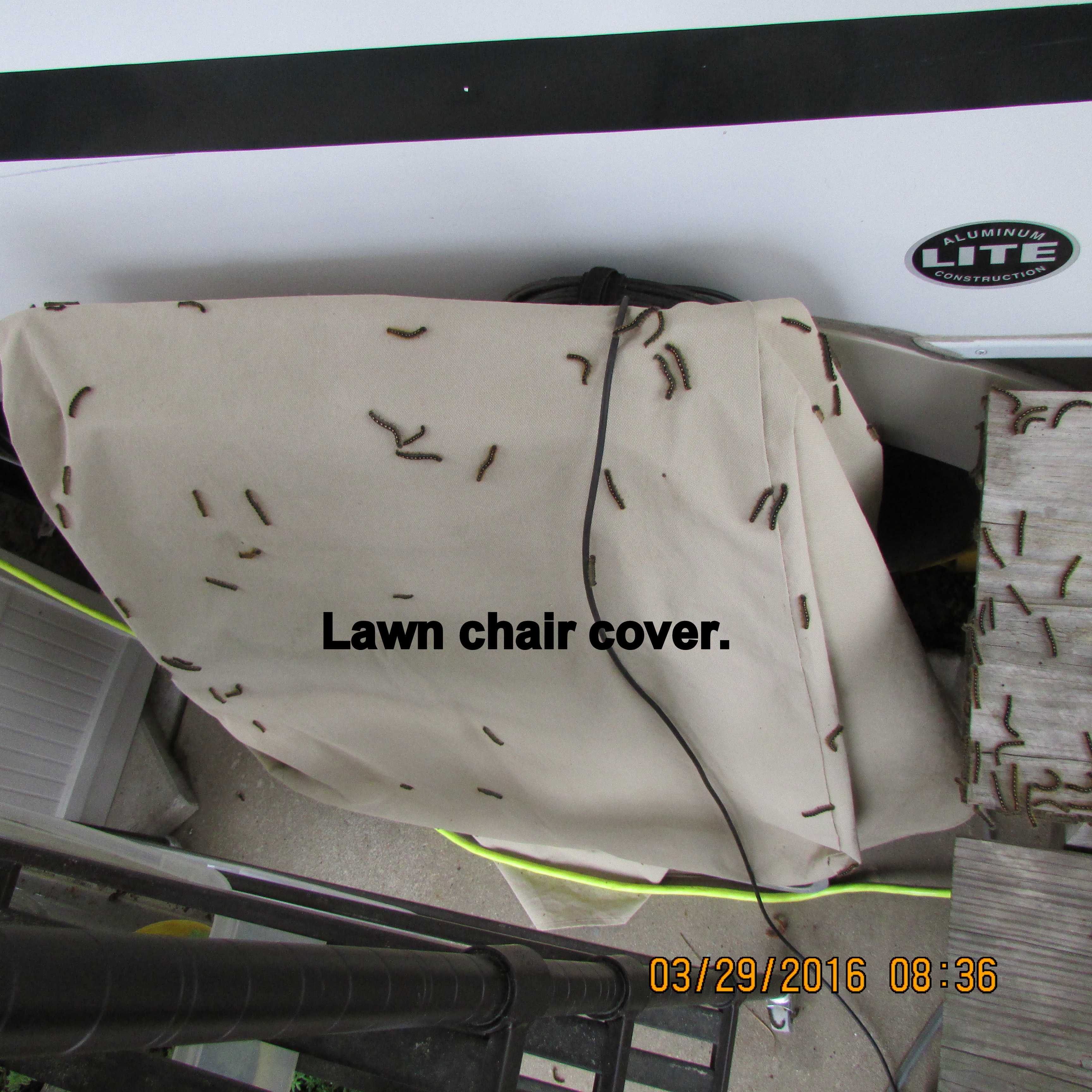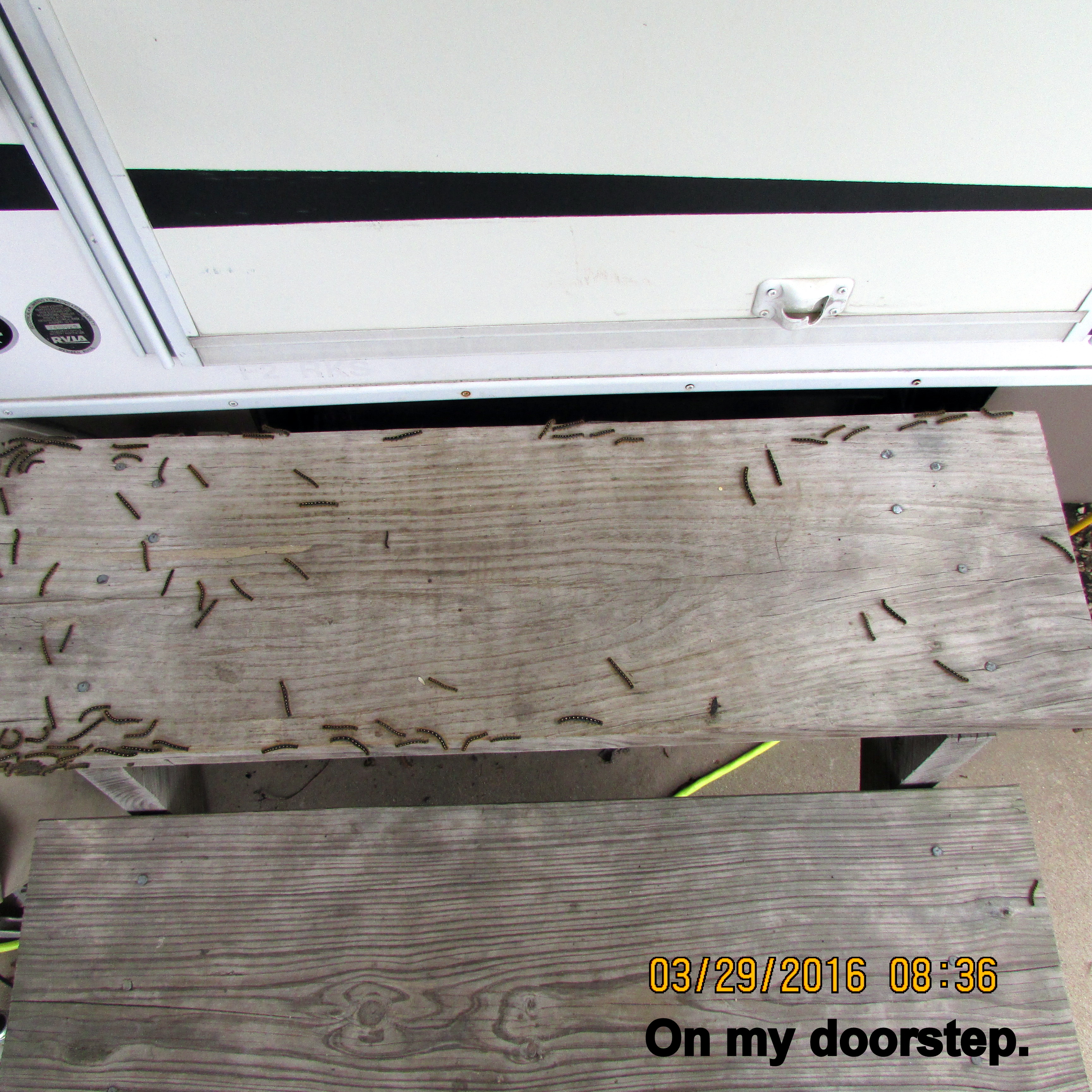 Postscript, Thursday, March 31, 2016, 4:40 PM: I just returned from the laundry room in the adjacent RV Park. OMG!! The exterior of the building is covered with caterpillars!! Just walking from my car to laundry room, the disagreeable little worms were all over me!! The floor was covered with smashed worms because we were tracking them in from outside!! ~~ Thankfully, I have far fewer caterpillars at my RV site.
