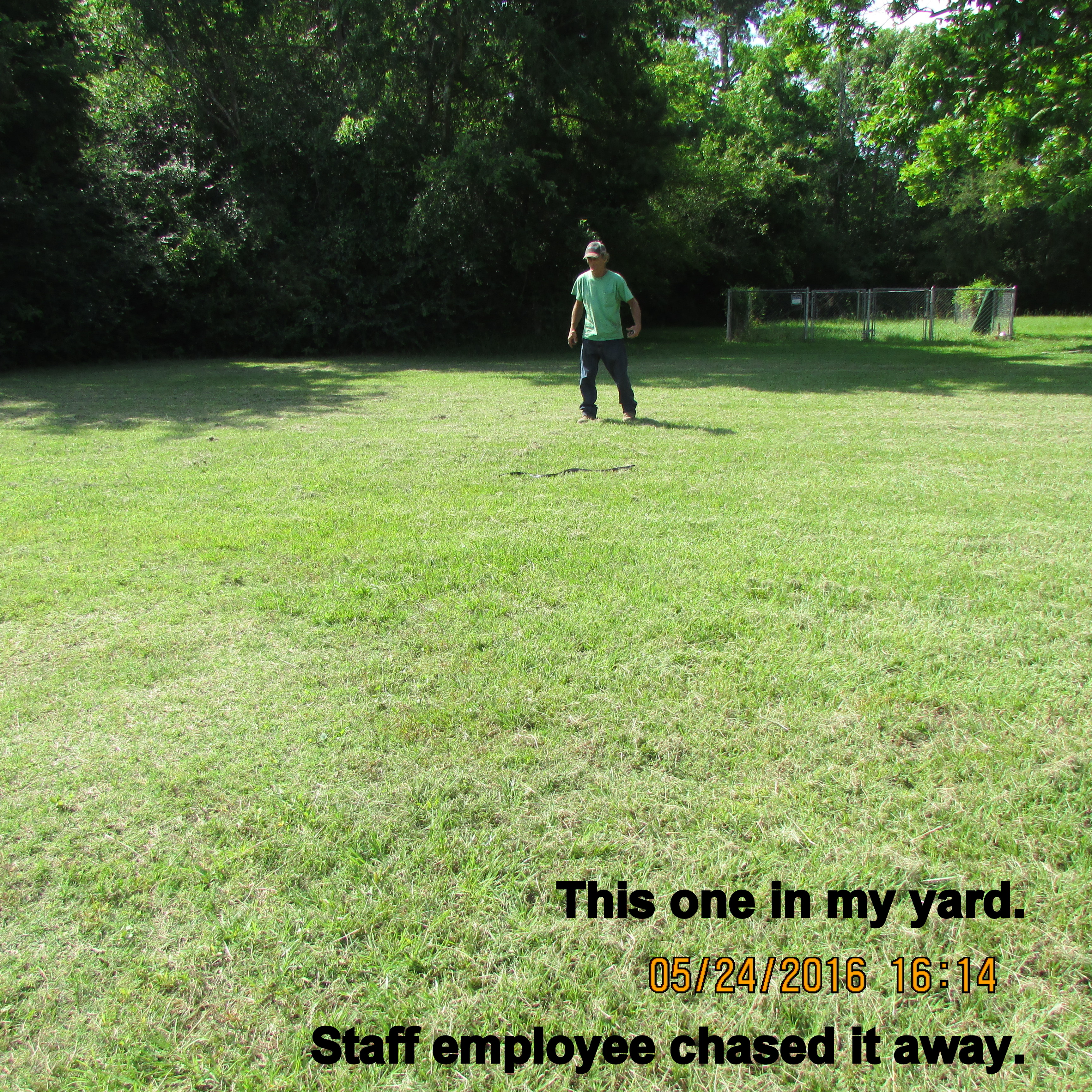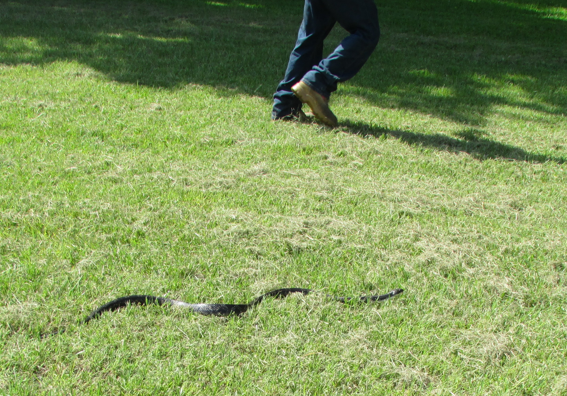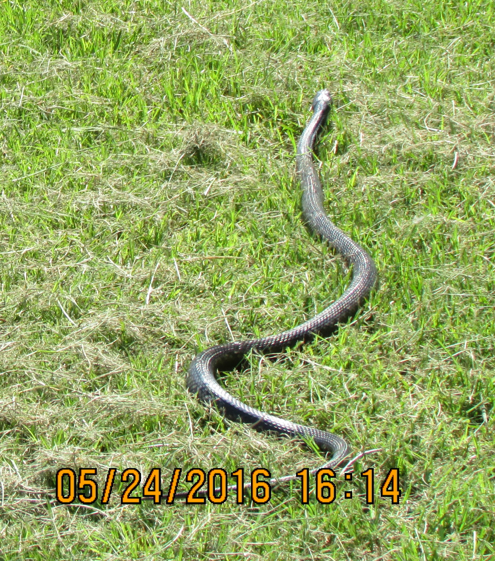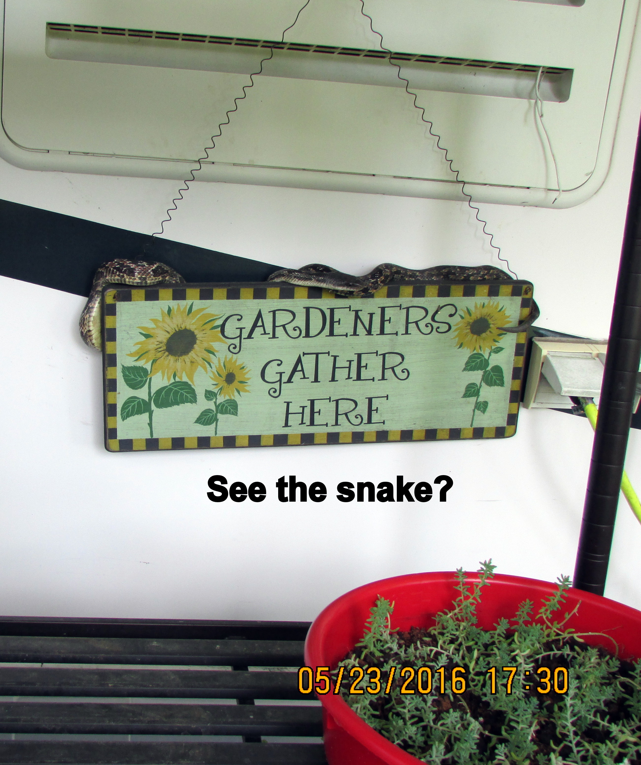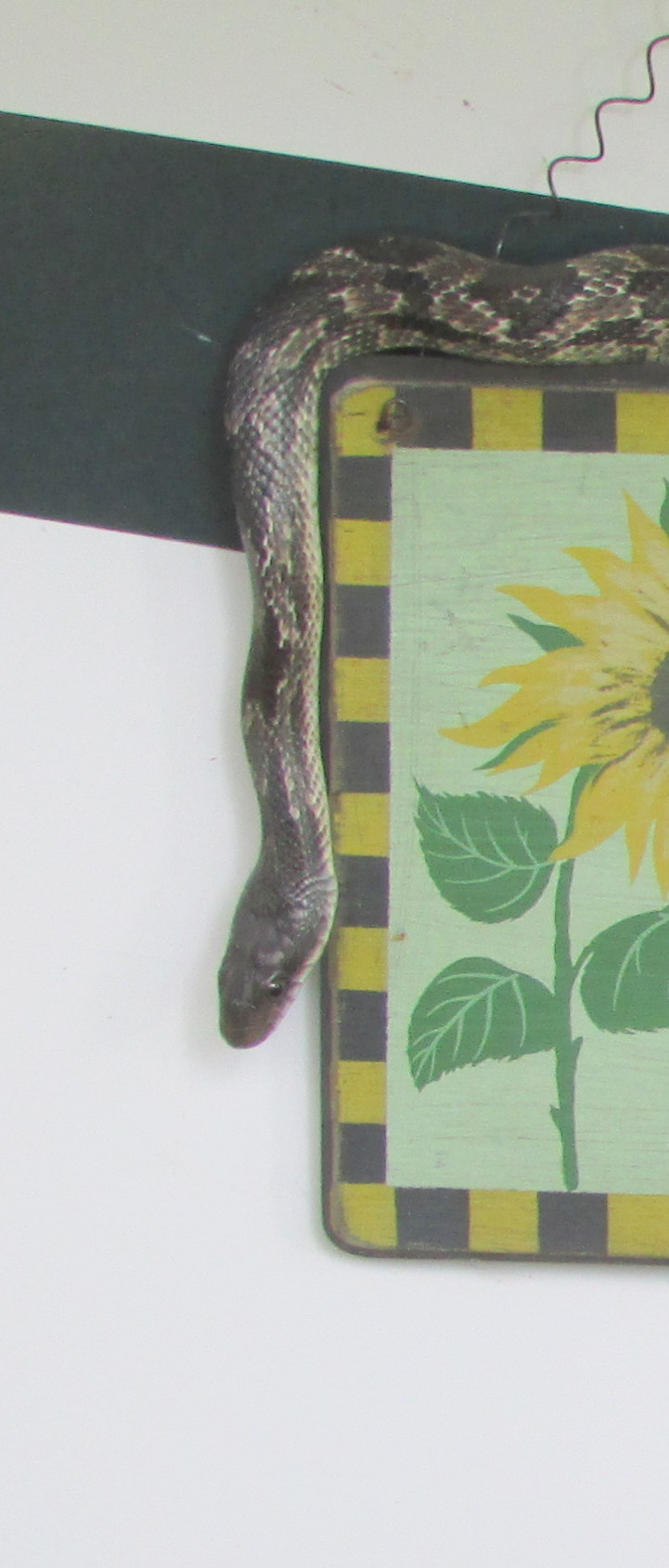 Postscript, Tuesday, May 24th, 2016: Knowledgeable folks tell me the visitor is/was a harmless Texas Rat Snake. ~~ A Texas native quoted this old saying: “Red next to yellow kills a fellow. Red next to black is a friend to Jack.” An Internet search produced this valuable information. (My visitor doesn’t appear to have red, yellow or black but the article is [imho] very interesting.)