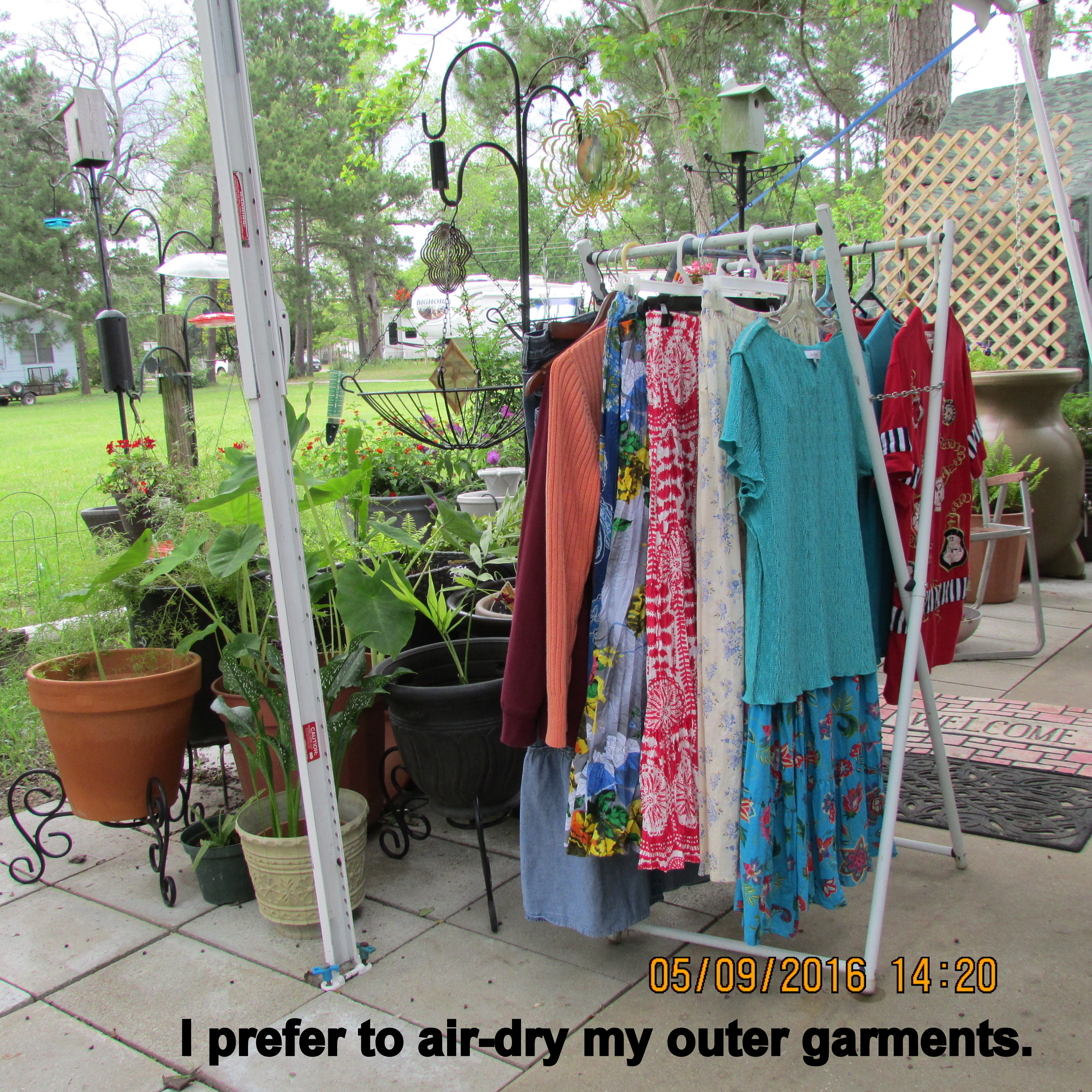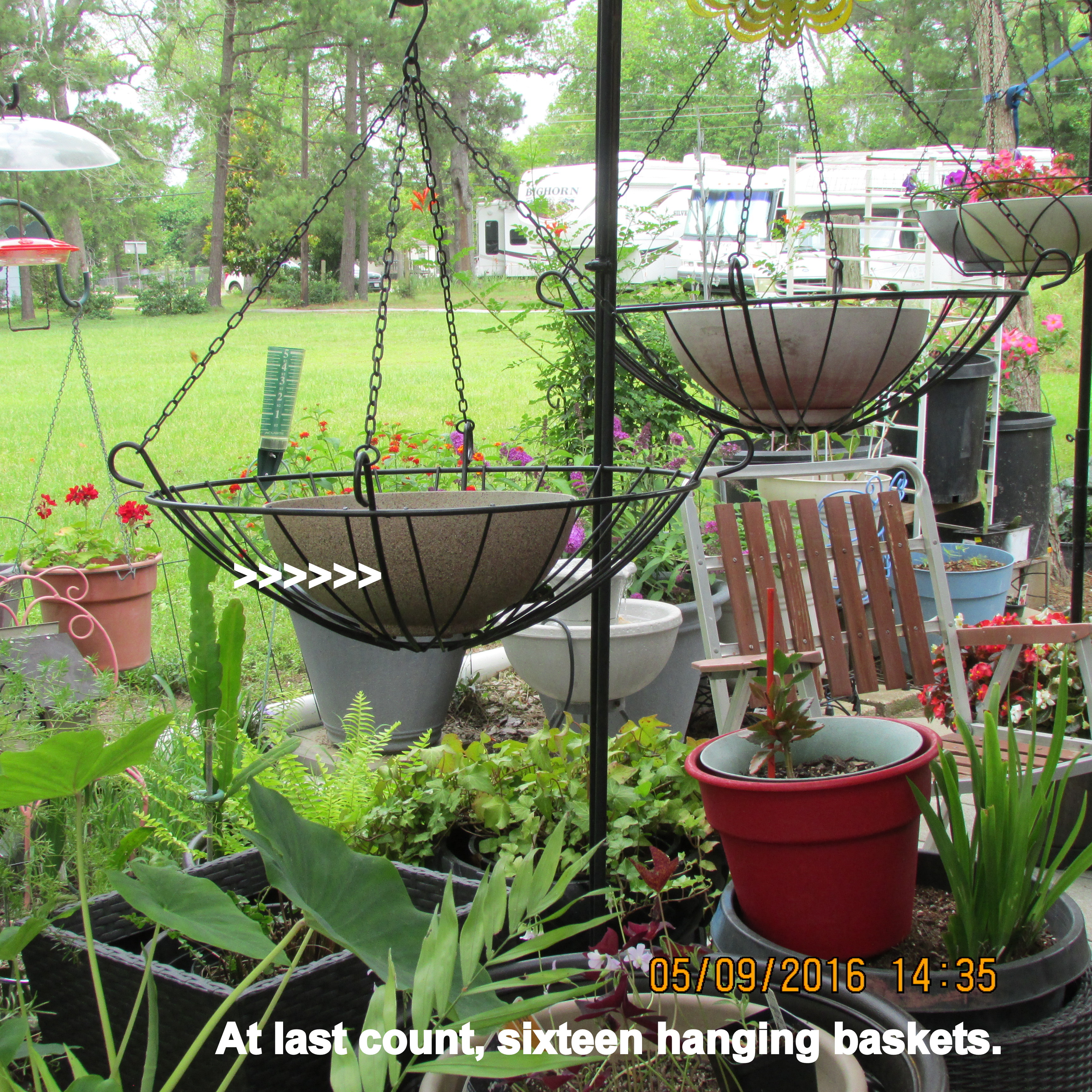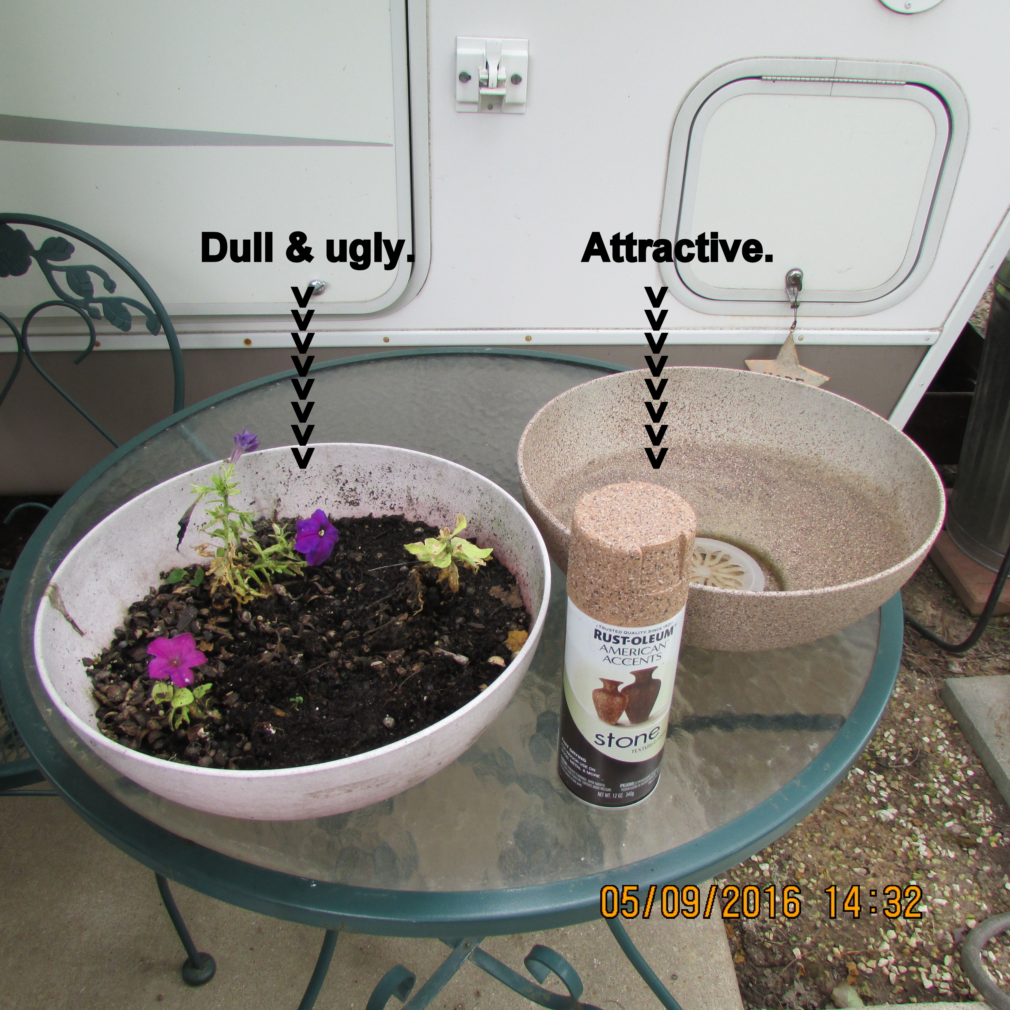 First thing this morning, I drove to the nearby laundry room in the adjacent RV Park. Three loads later (home again), I was ready to tackle projects in my garden. Yesterday I suddenly decided to spray paint two hanging baskets and a planter. I went shopping… and now have a variety of colors. Honestly, I only had two spray cans in my shopping cart but discovered the “clearance” aisle. The “textured” paint was discounted fifty per cent so I went from practical to preferred!! The bamboo planters are “just the right size” for the hanging baskets but are faded. There are five more begging my attention. ~~ Oh woe is me: So much garden and so little space!! Quite unexpectedly, the table and chairs were delivered. I’m running out of places to put things!! Decisions, decisions!! (But I’ll leave that for another day.) It is 3:33 PM as I type this and need to put laundry away. ~~ Square dancing tonight.