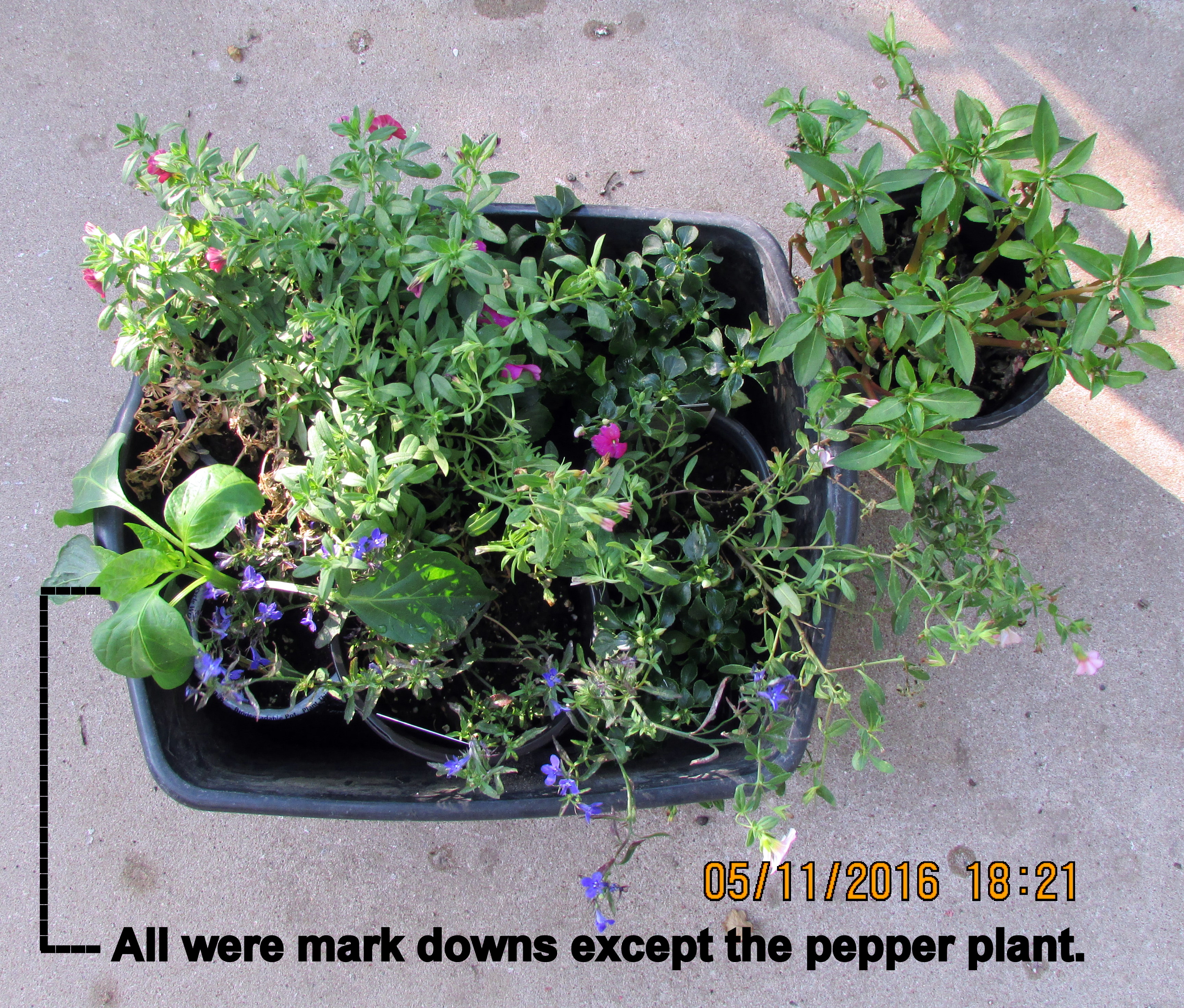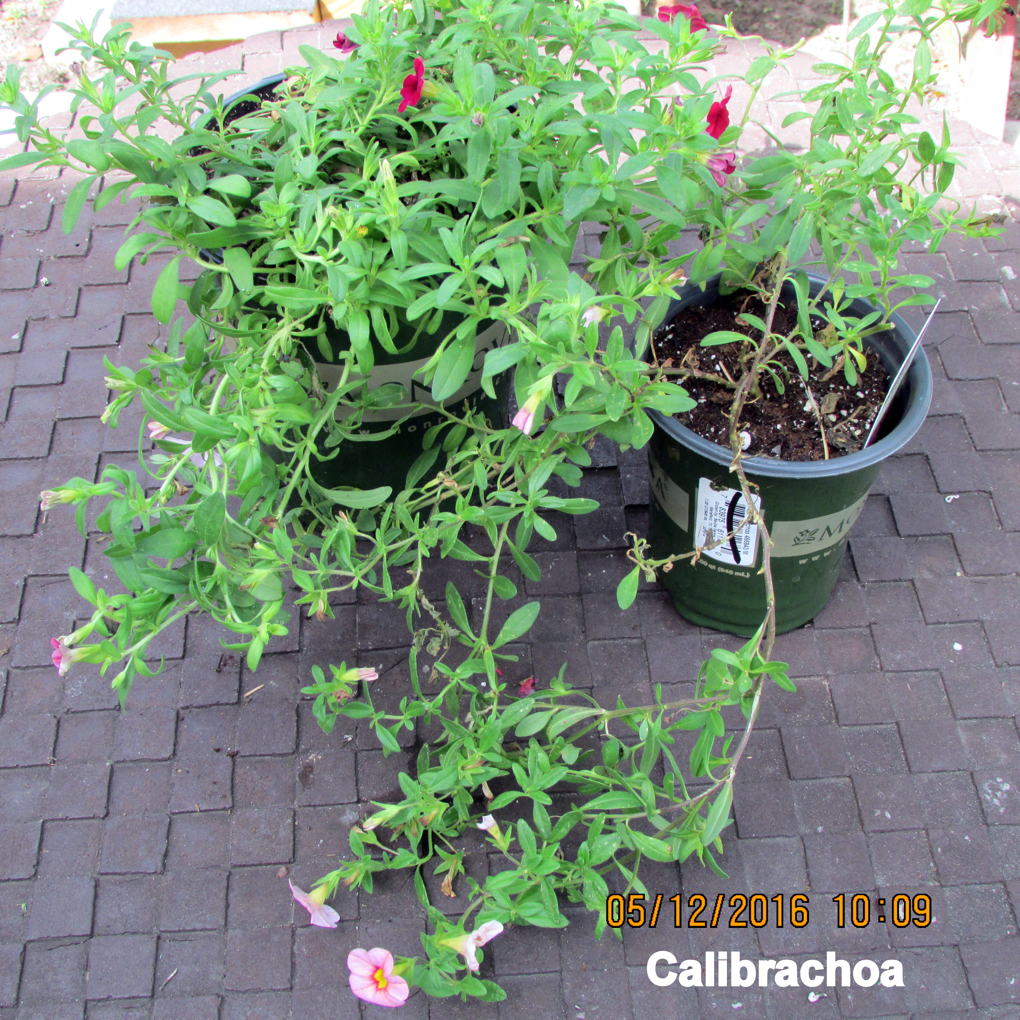 The two new “mark down” Calibrachoa (Million Bells) will be added to the large planter. Adding red, and pink, to the display.