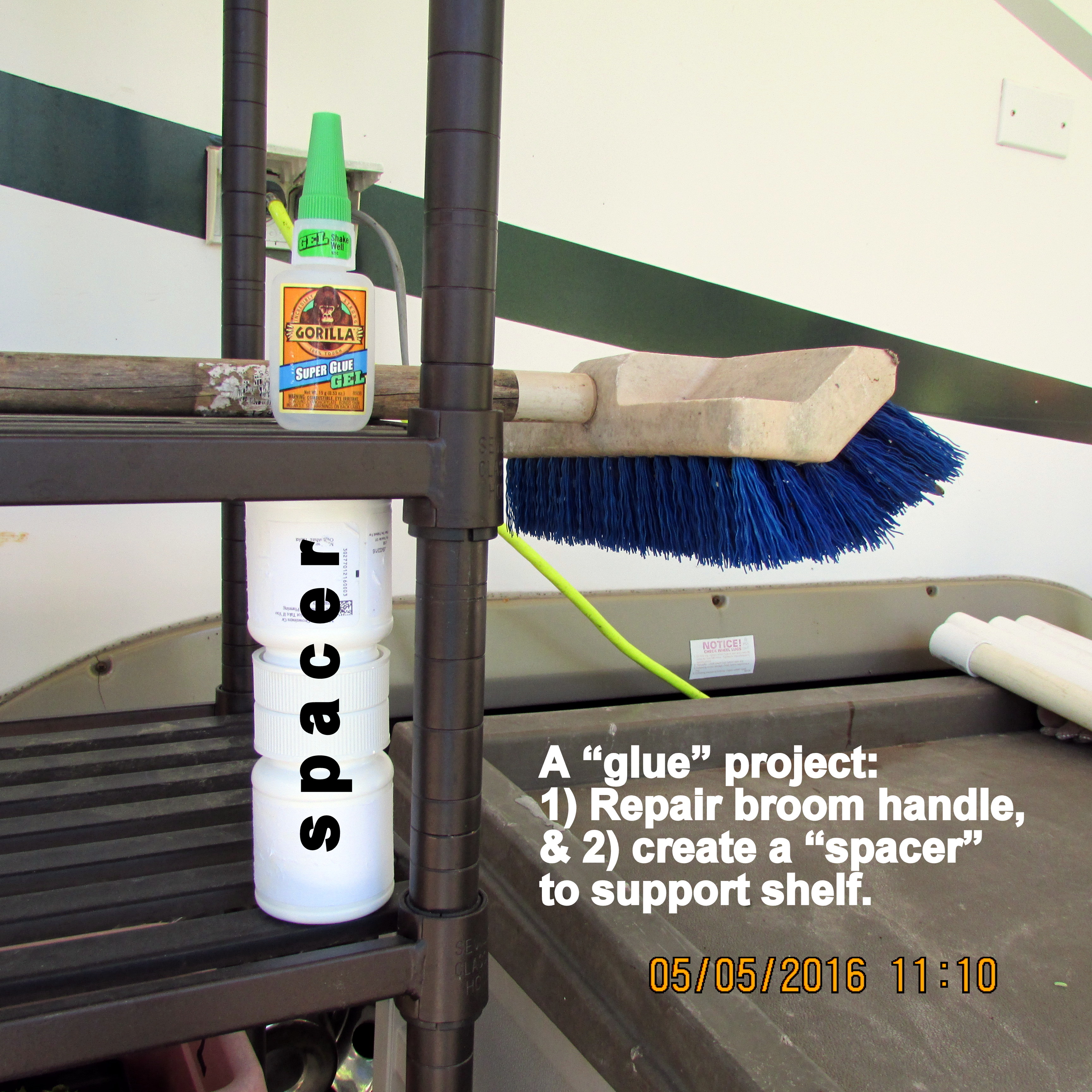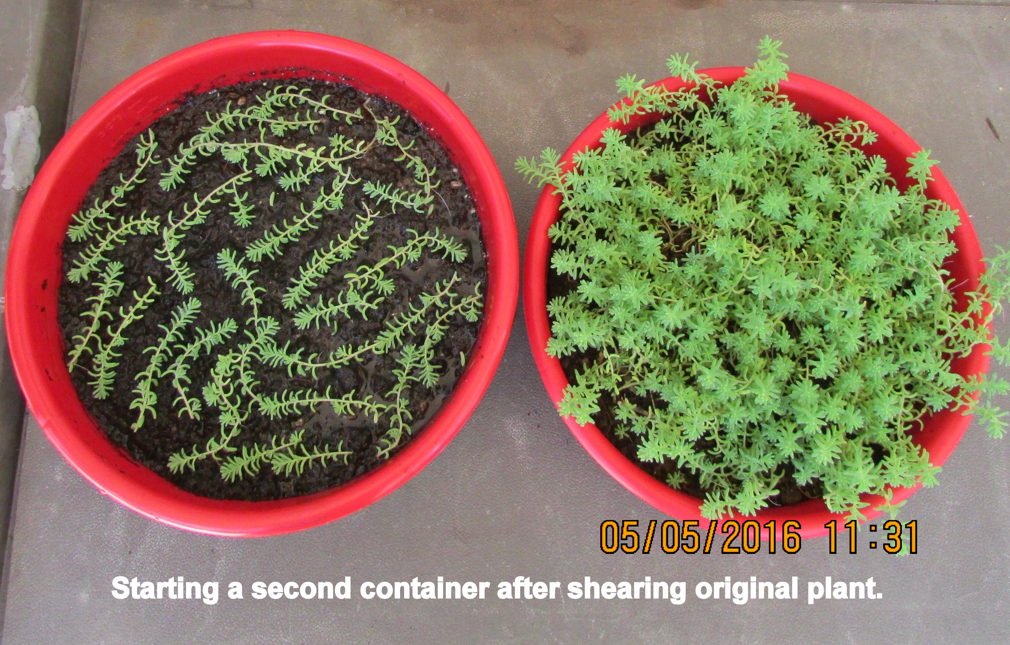 The weight of the Christmas Cactus planter caused the shelf to press downward onto the plastic container with small planters of “Money Moss.” I didn’t have a piece of wood the right size so I used some of my “pebbles for planters” plastic medicine/supplement containers. Yes, I glued my fingers together; how awkward!!