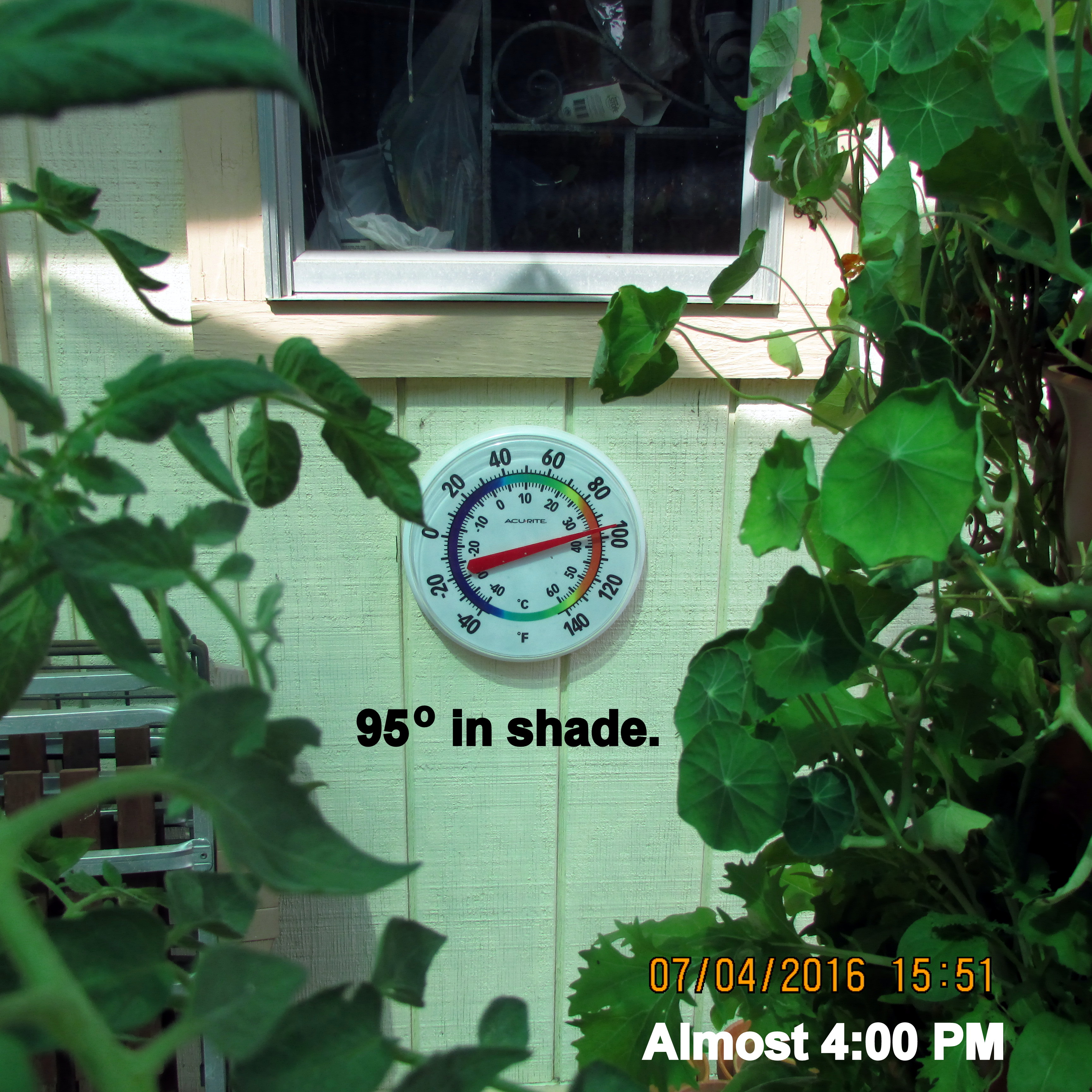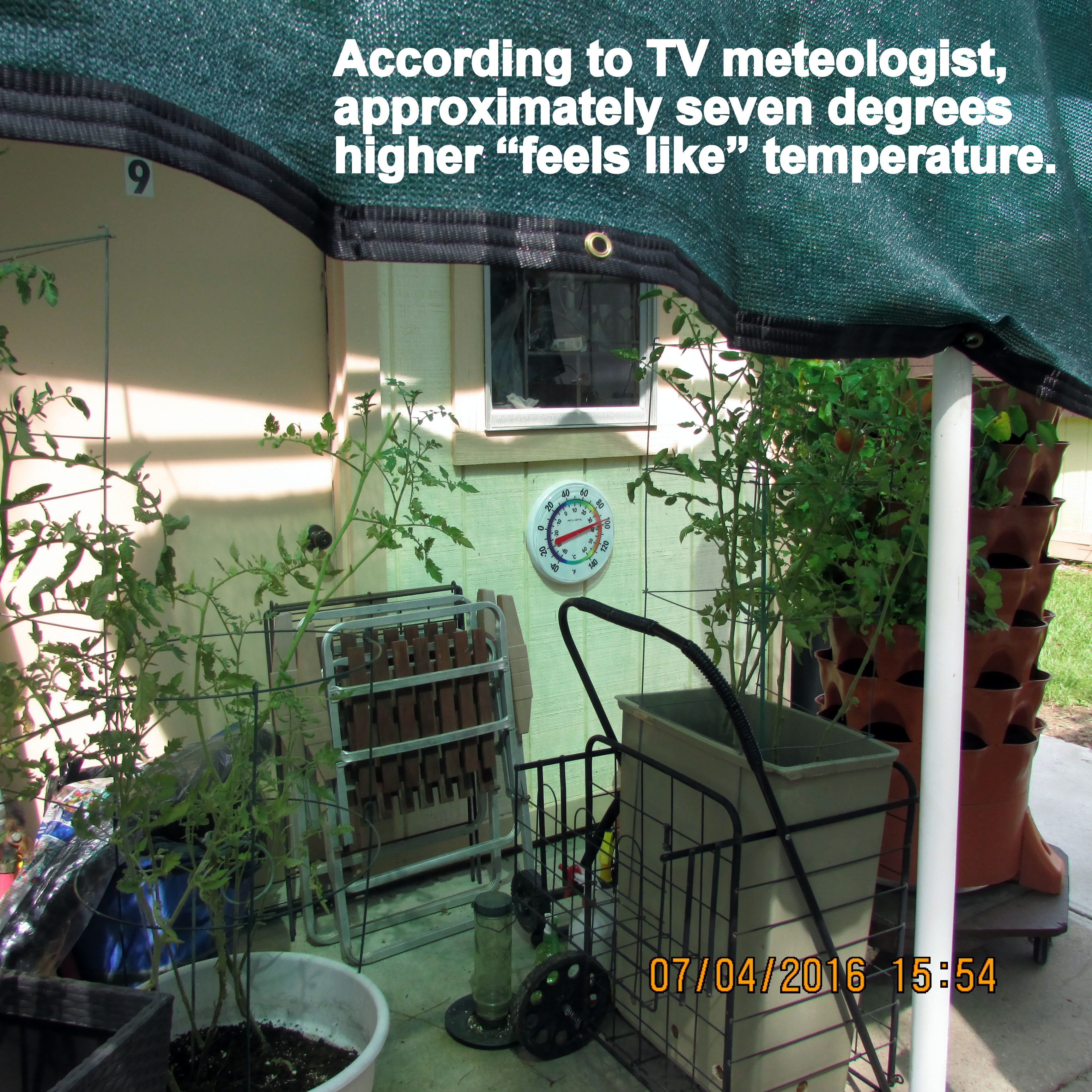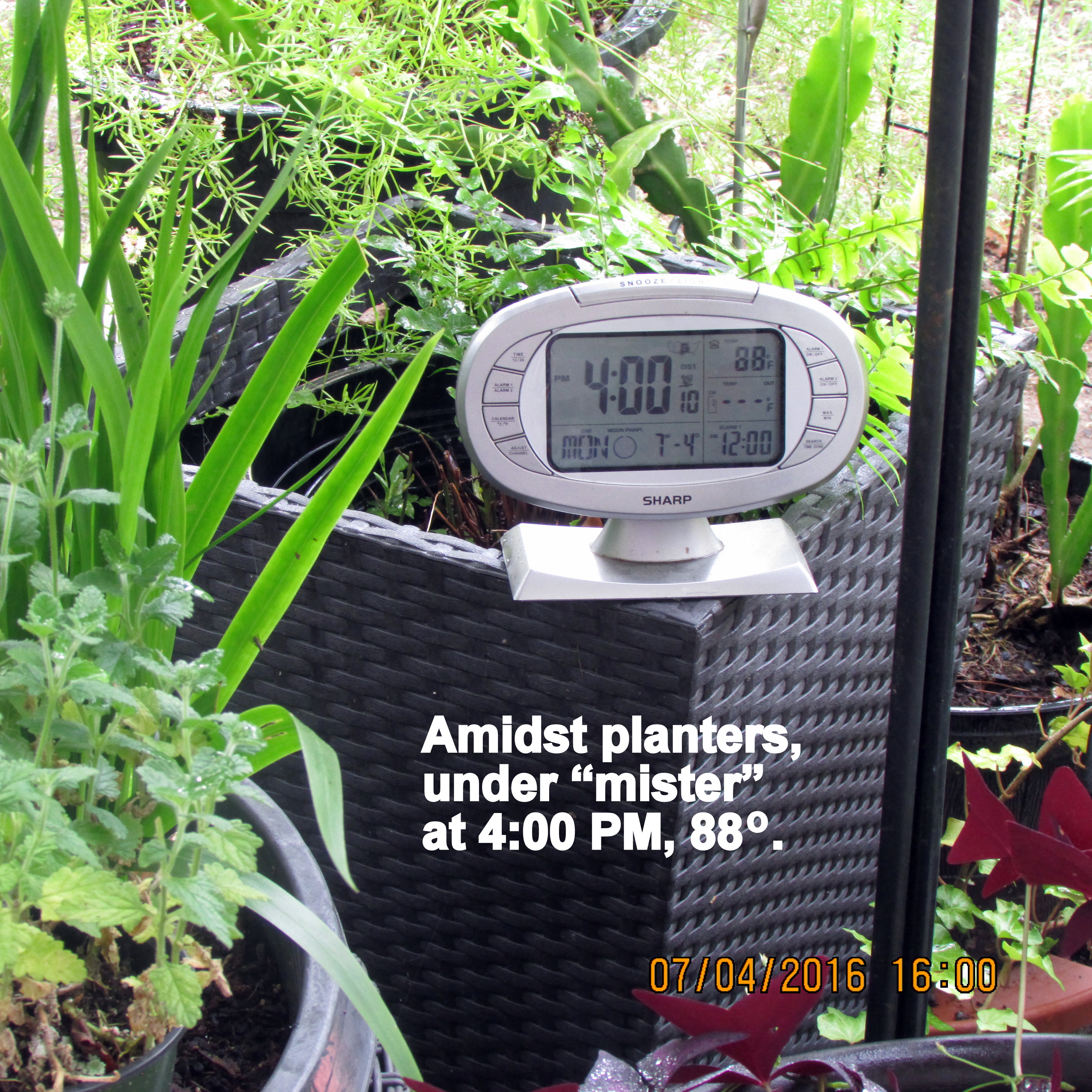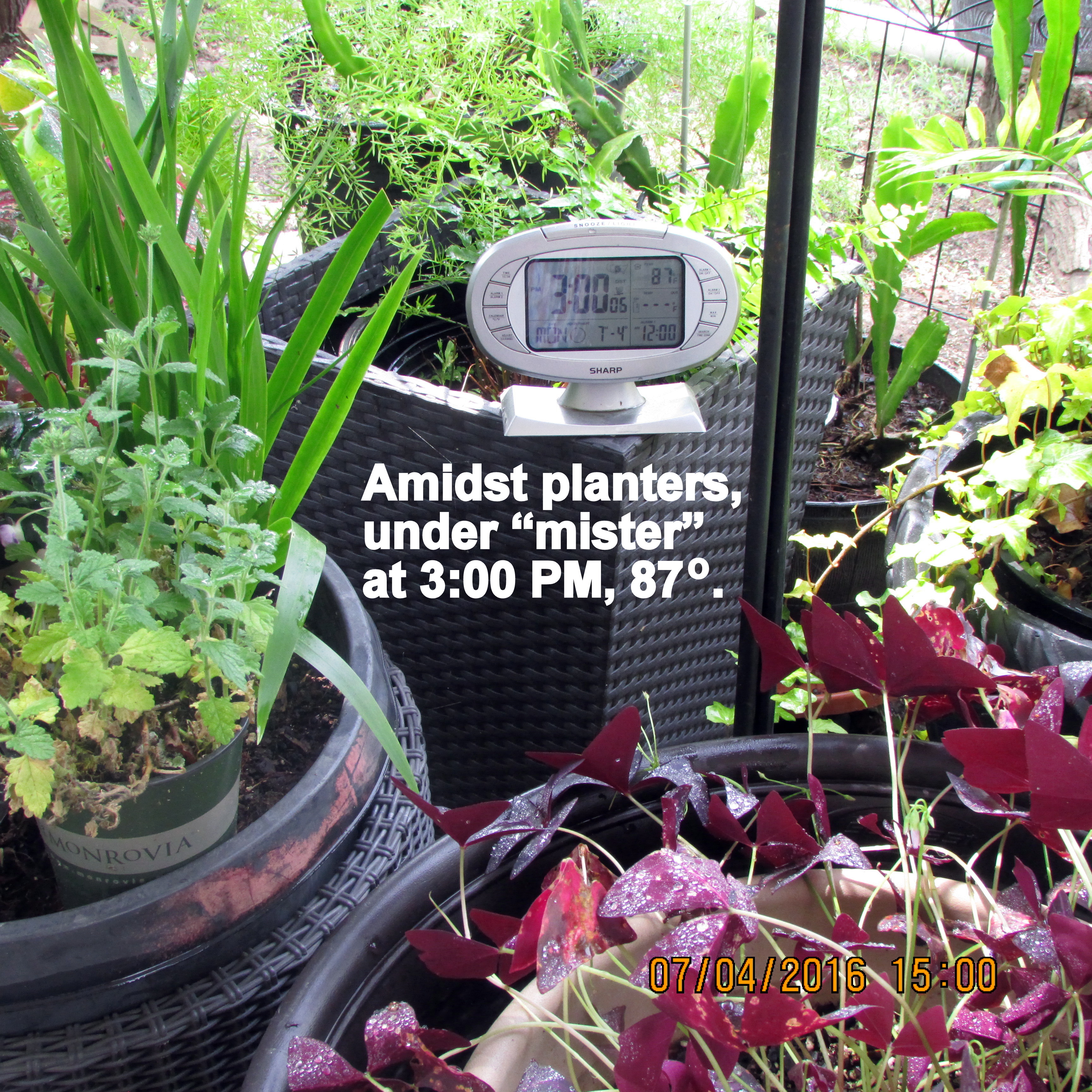 With the exception of thermometer in sunshine, I believe my experiment documents the temperature on the patio, under the “mister,” is six to seven degrees cooler.![]()