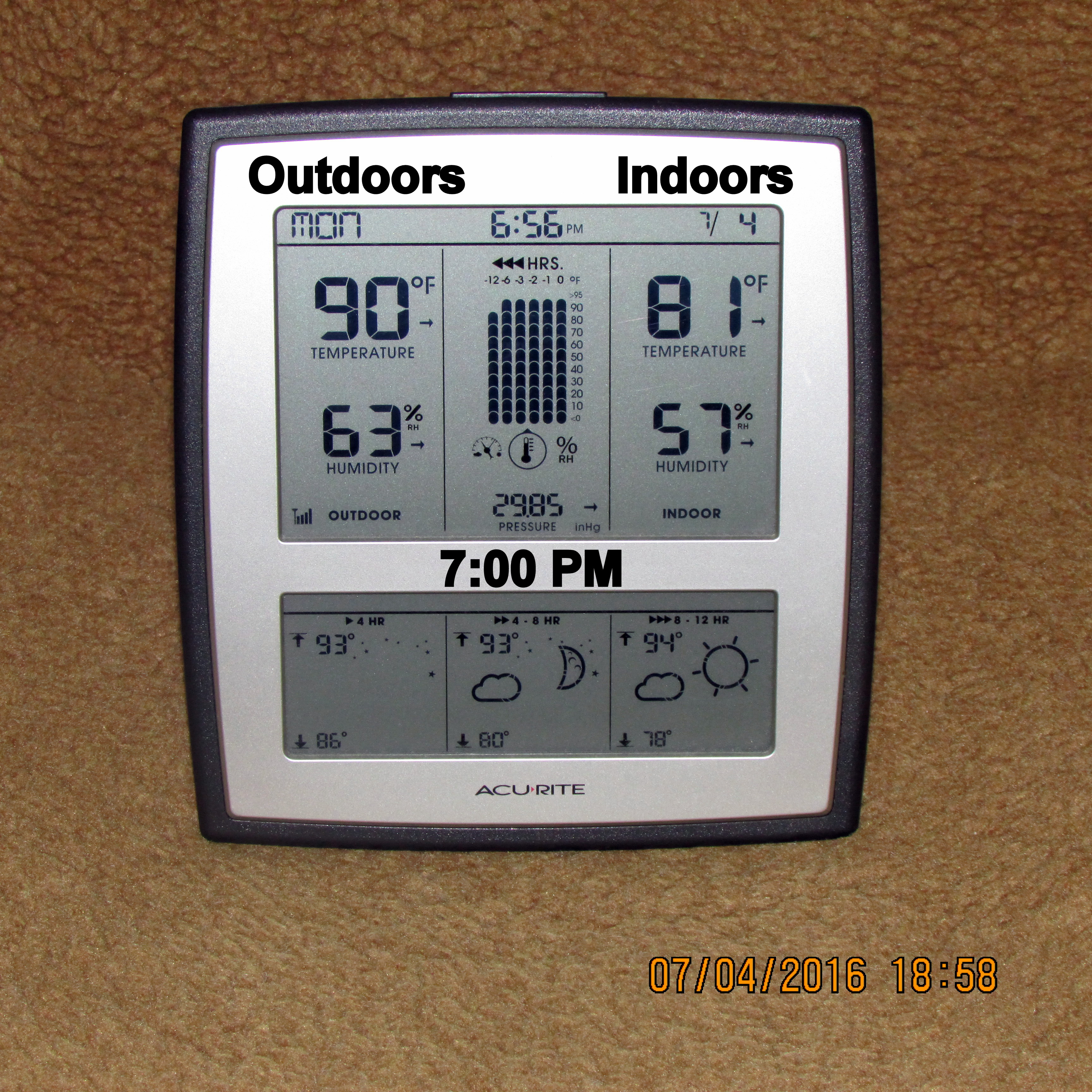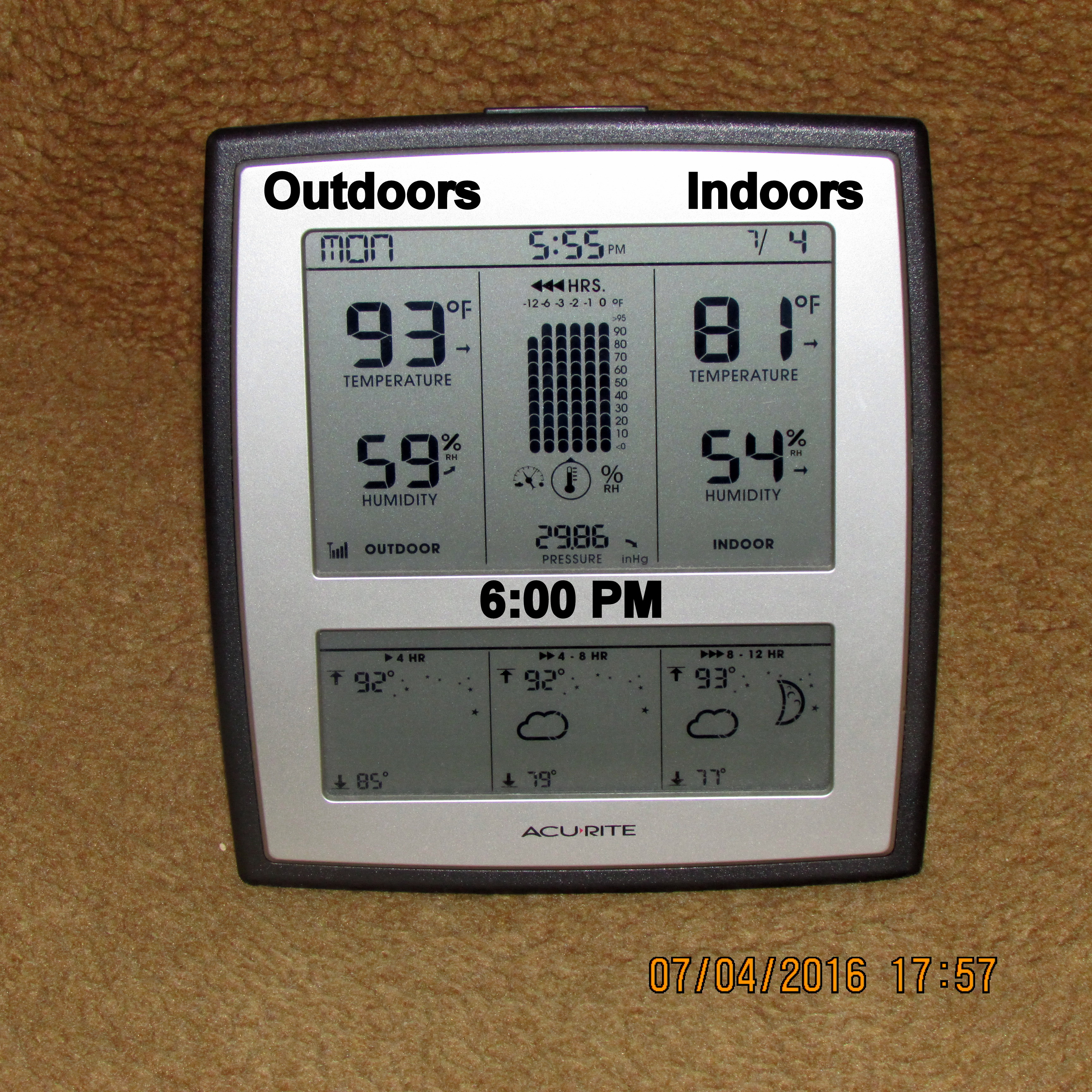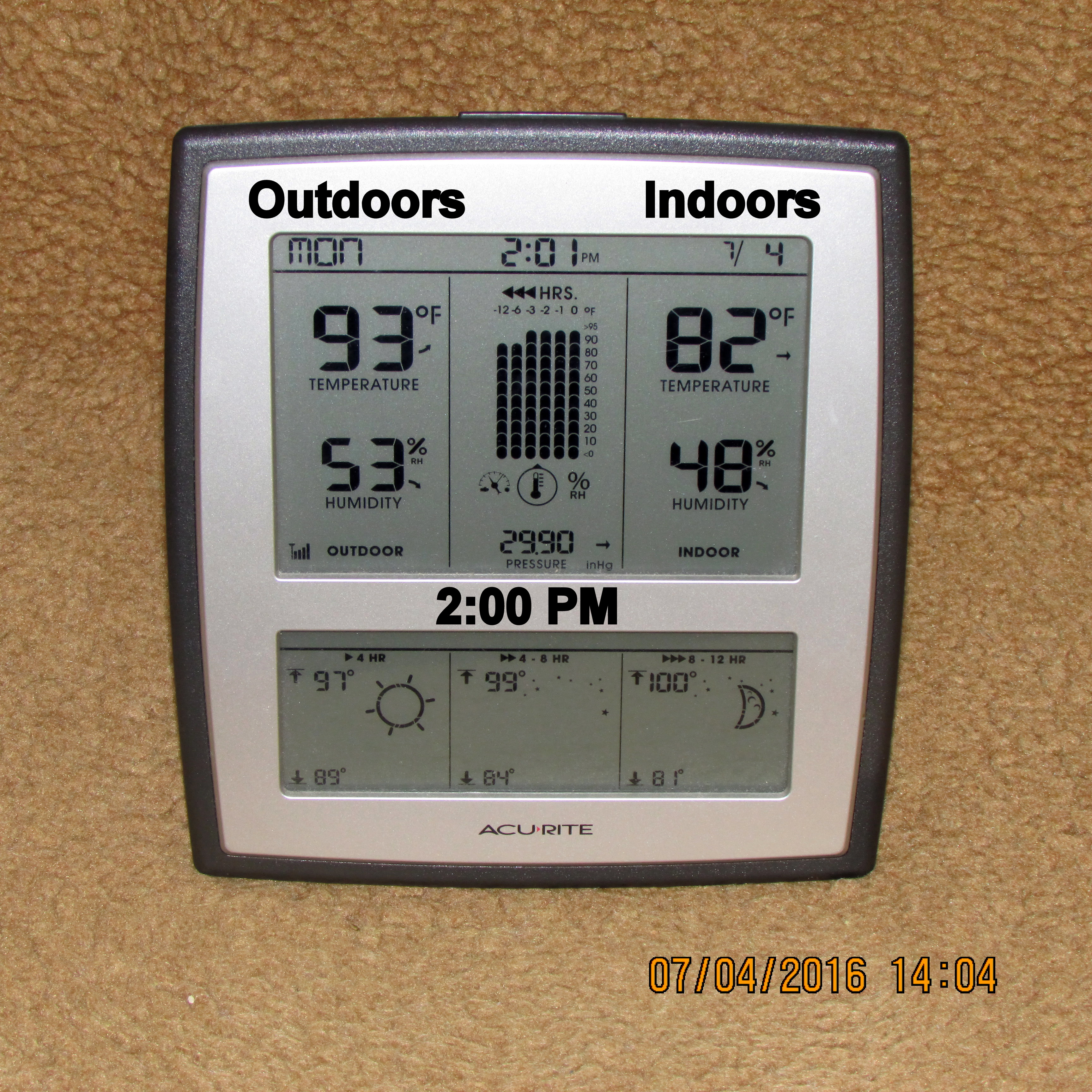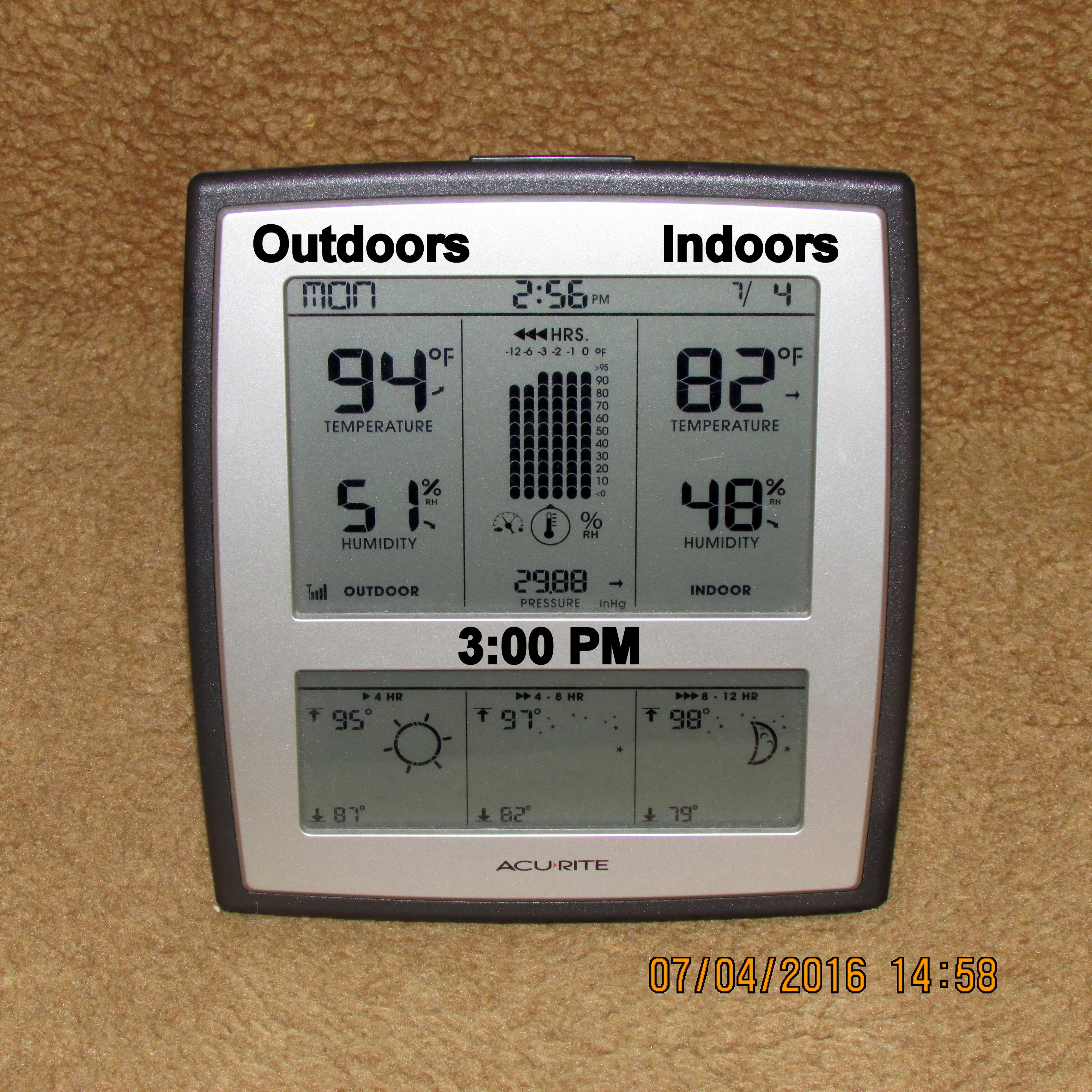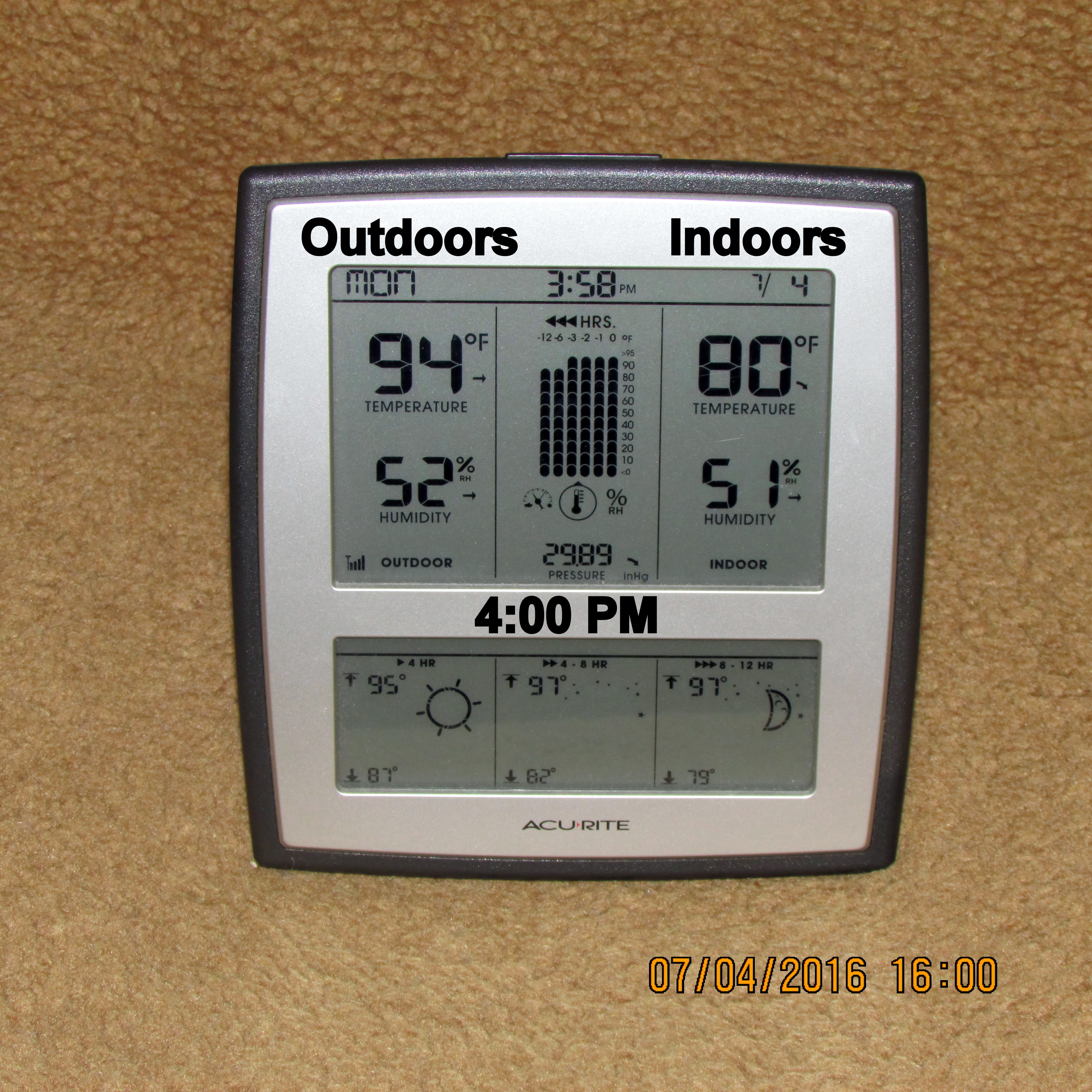 With the exception of thermometer in sunshine, I believe my experiment documents the temperature on the patio, under the “mister,” is six to seven degrees cooler.![]()