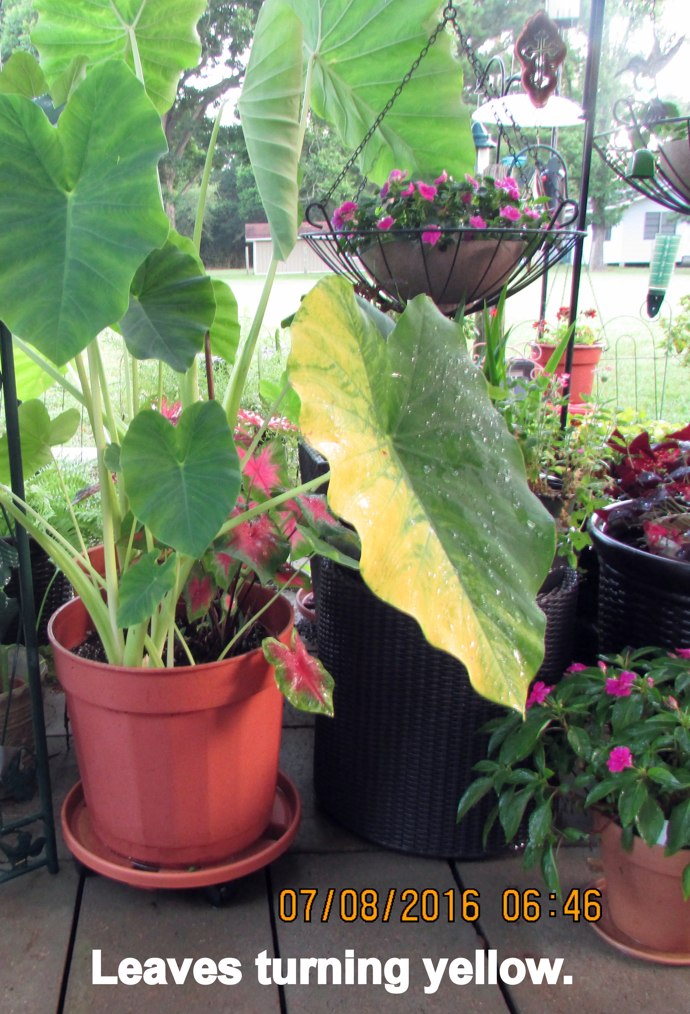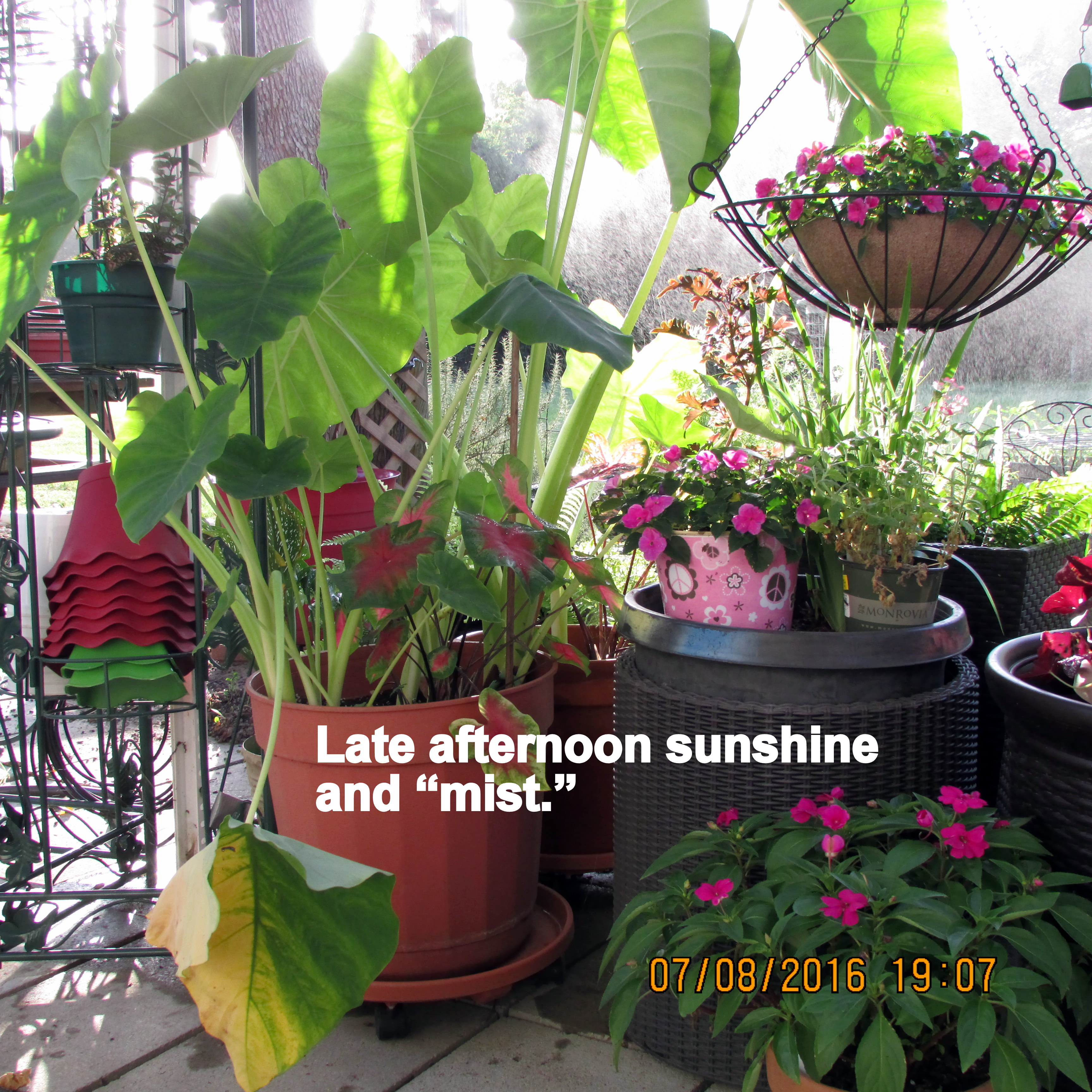 The Elephant Ear plants were not in the pictures but setting up a “mister” was primarily for their benefit. Leaves were turning yellow and I speculated the plants were suffering in the extreme heat and humidity. ~~ Situation rectified: Pictures taken.