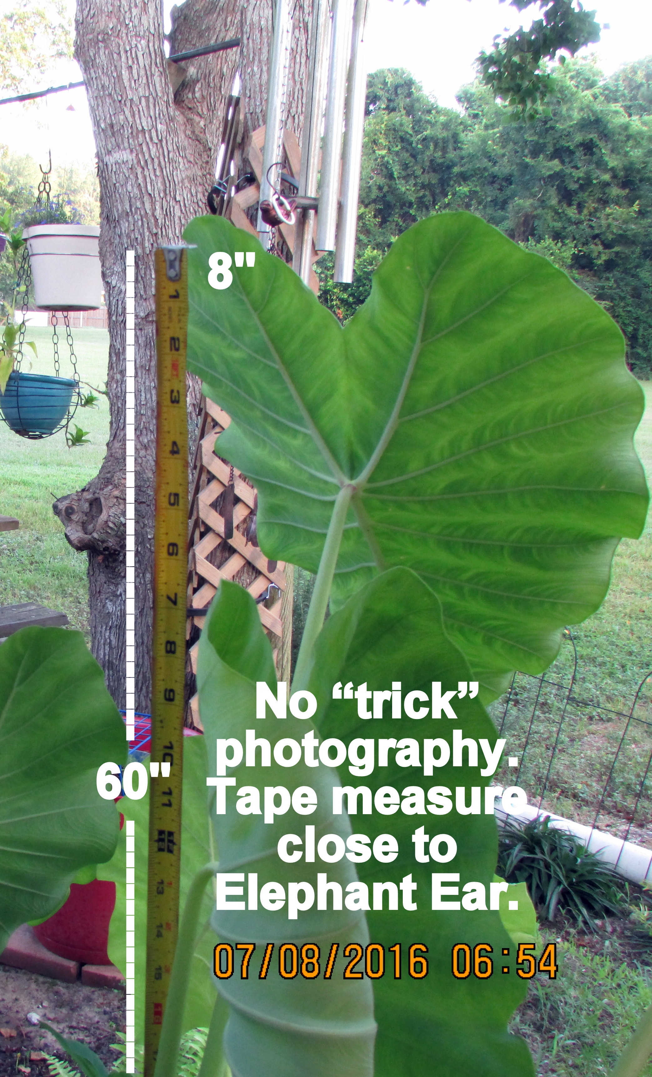 Plant Person Pestered Persistently is the title I used for the blog introducing half-a-dozen new plants to my yard. At that time, I didn’t know the name of the plant and labeled it “unknown.” Less than thirty inches tall when I started nurturing it. Note the remarkable growths in less than three months. In the interim, I published messages titled Elephant Ear and Elephant Ear is growing so fast.