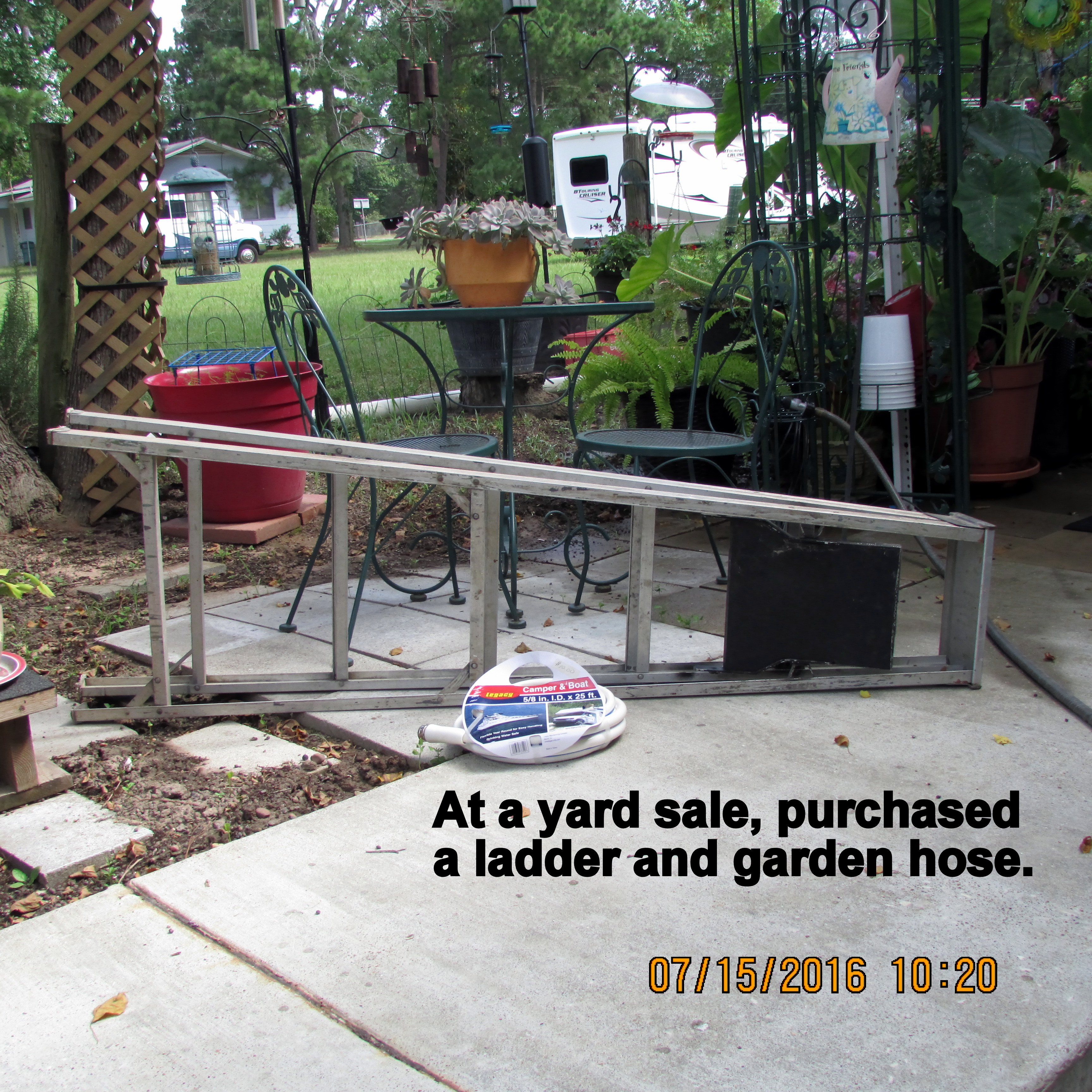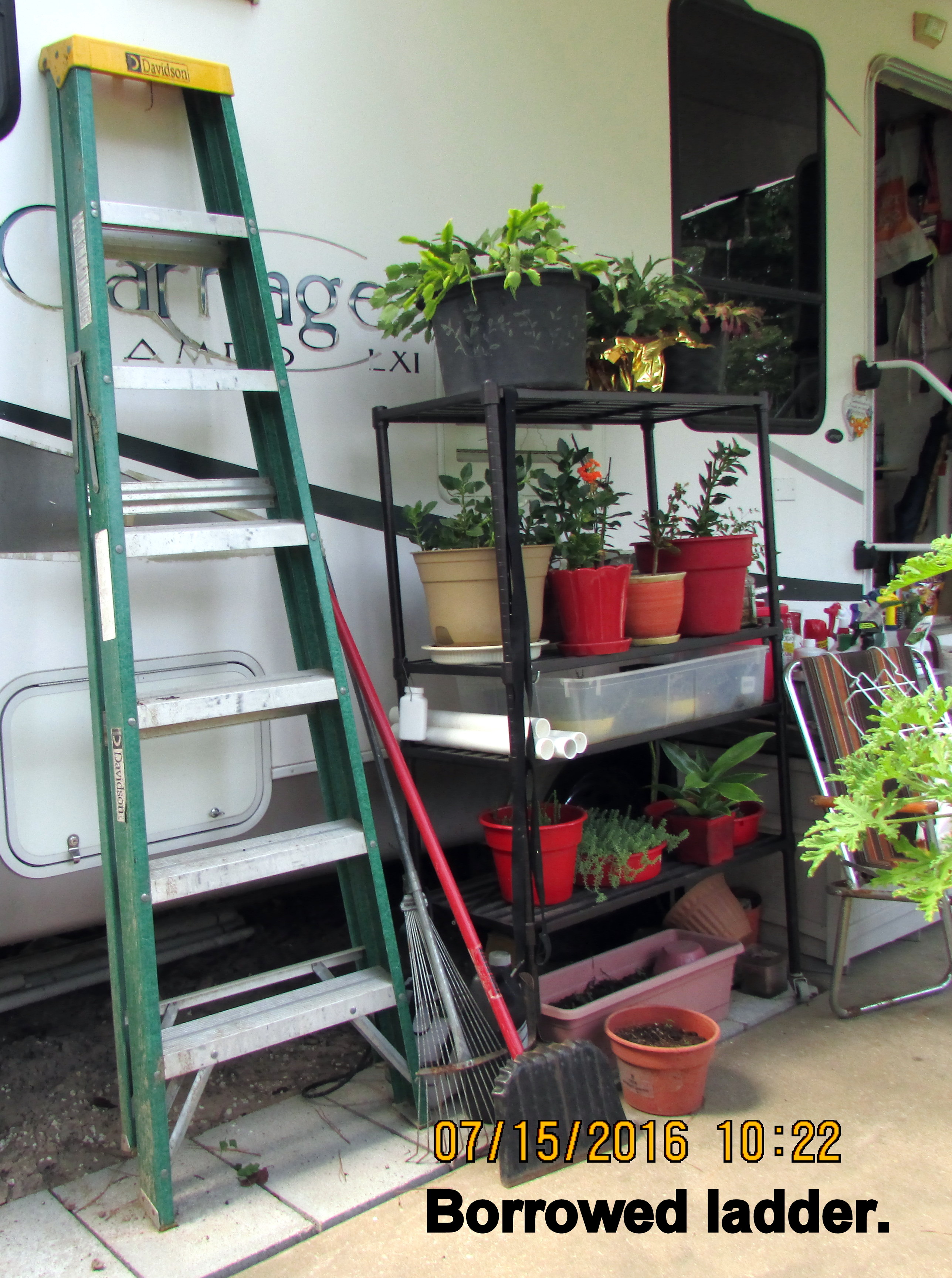 Quite unusual for me, this morning I visited a “garage sale” in the adjacent Escapees Rainbow’s End RV Park. I have more “things” than I need or will ever use. However, this sale advertised tools and yard items. Oh my, what a valuable collection of tools–but I have an adequate variety (and nothing there I needed). I purchased the new RV/Marine hose (although my “need” was one month ago). Now I have a spare. The ladder is a valuable acquisition because I’ve had a borrowed ladder for over a year. Time to return–but “they” don’t use…?!