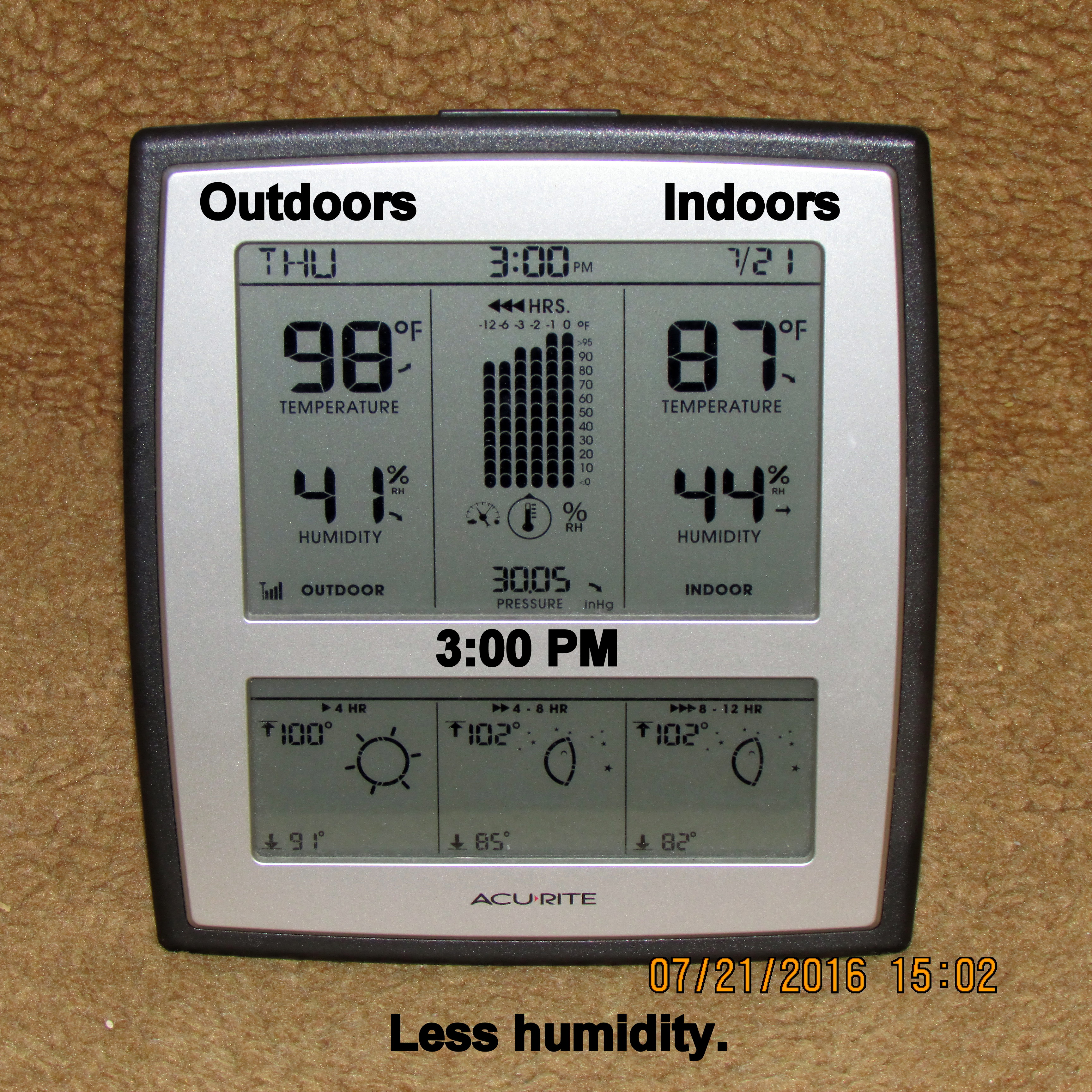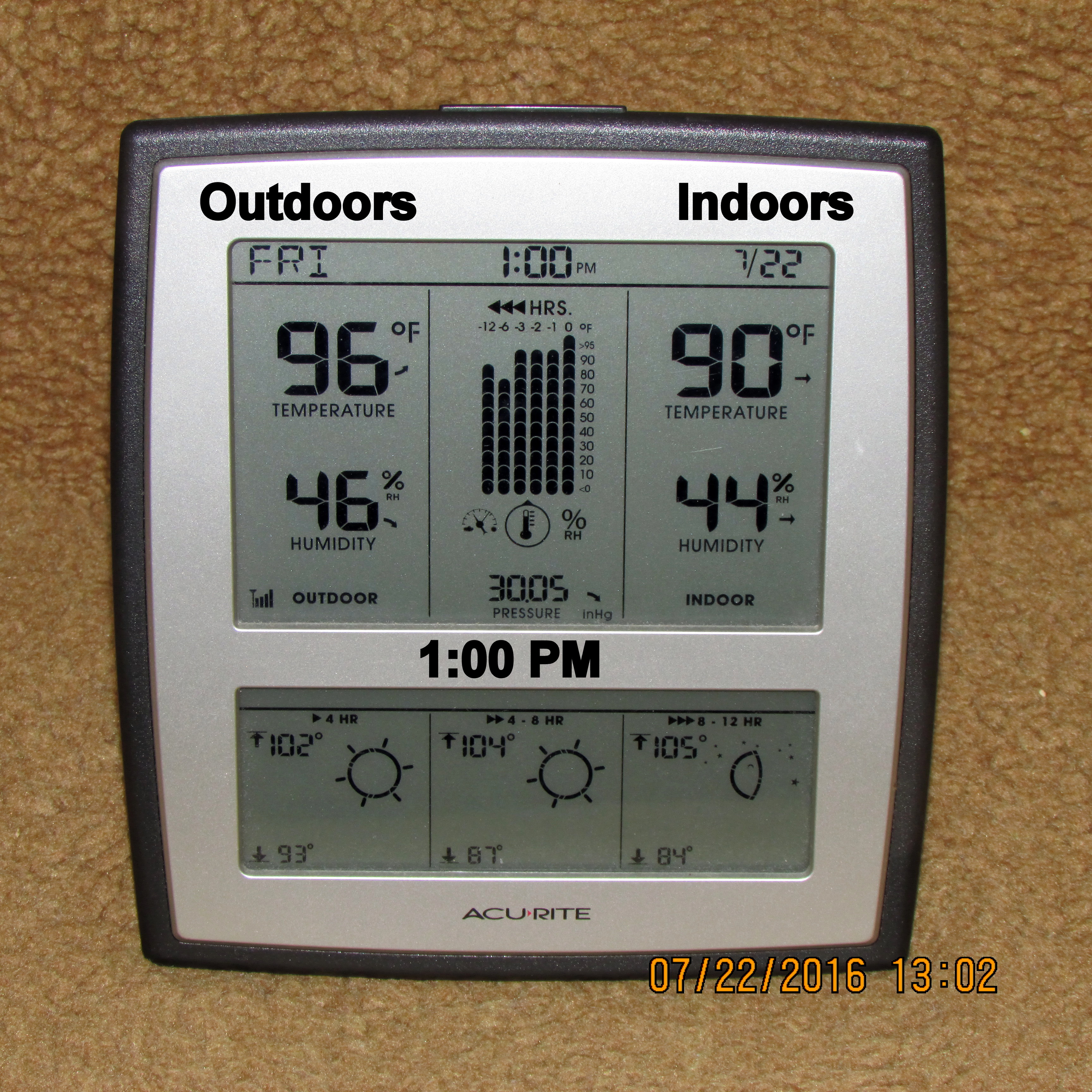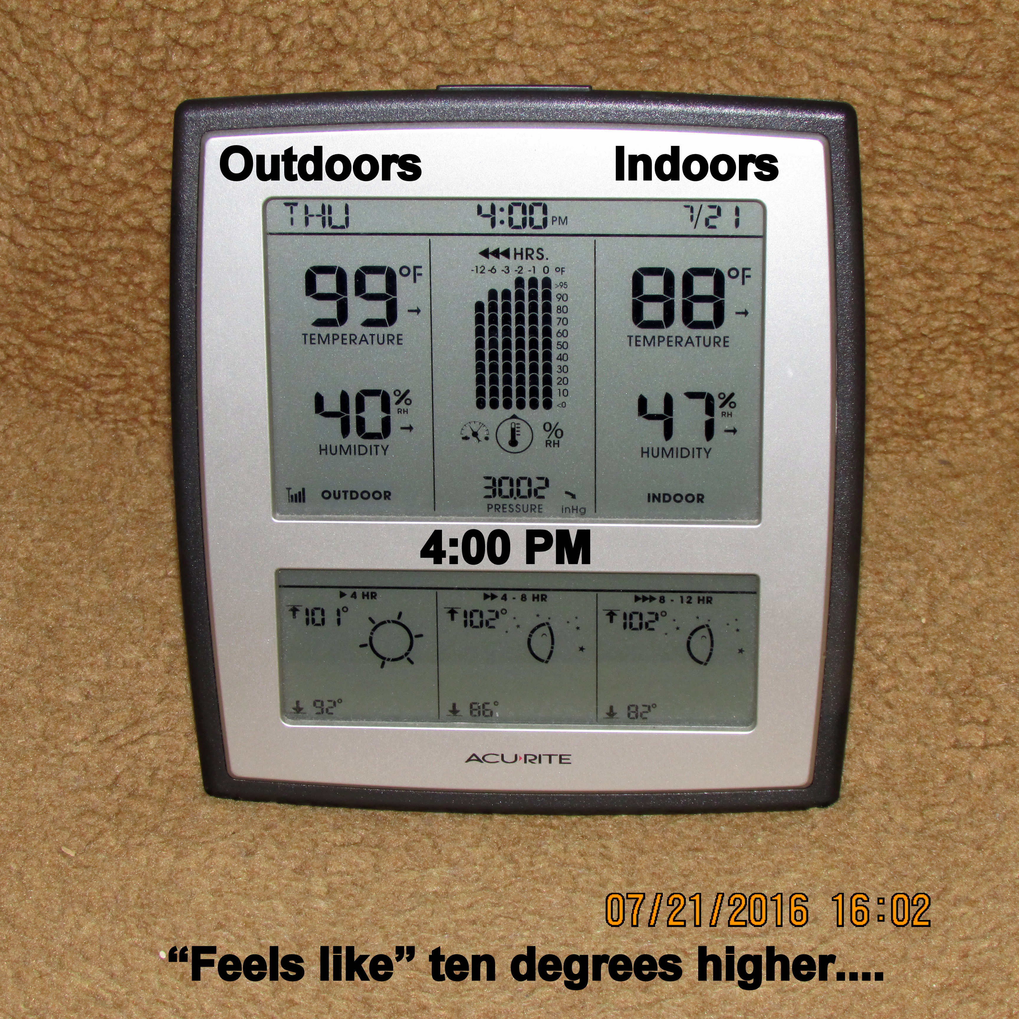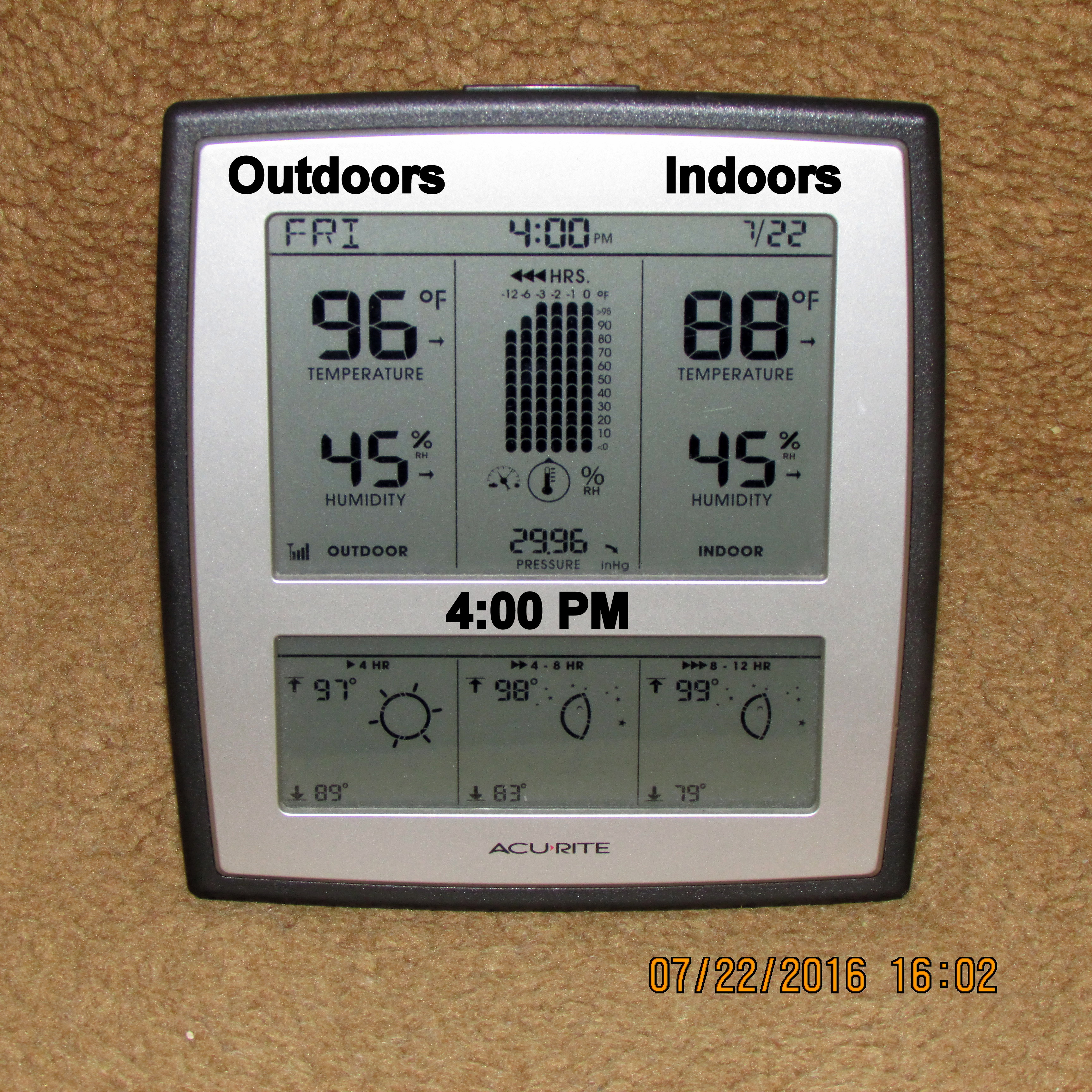 Temperature at fourHouston TV meteorologist started the late afternoon news with the statement “Add ten degrees to the recorded temperature” (for “feels like”).Weather map at four-eighteen
