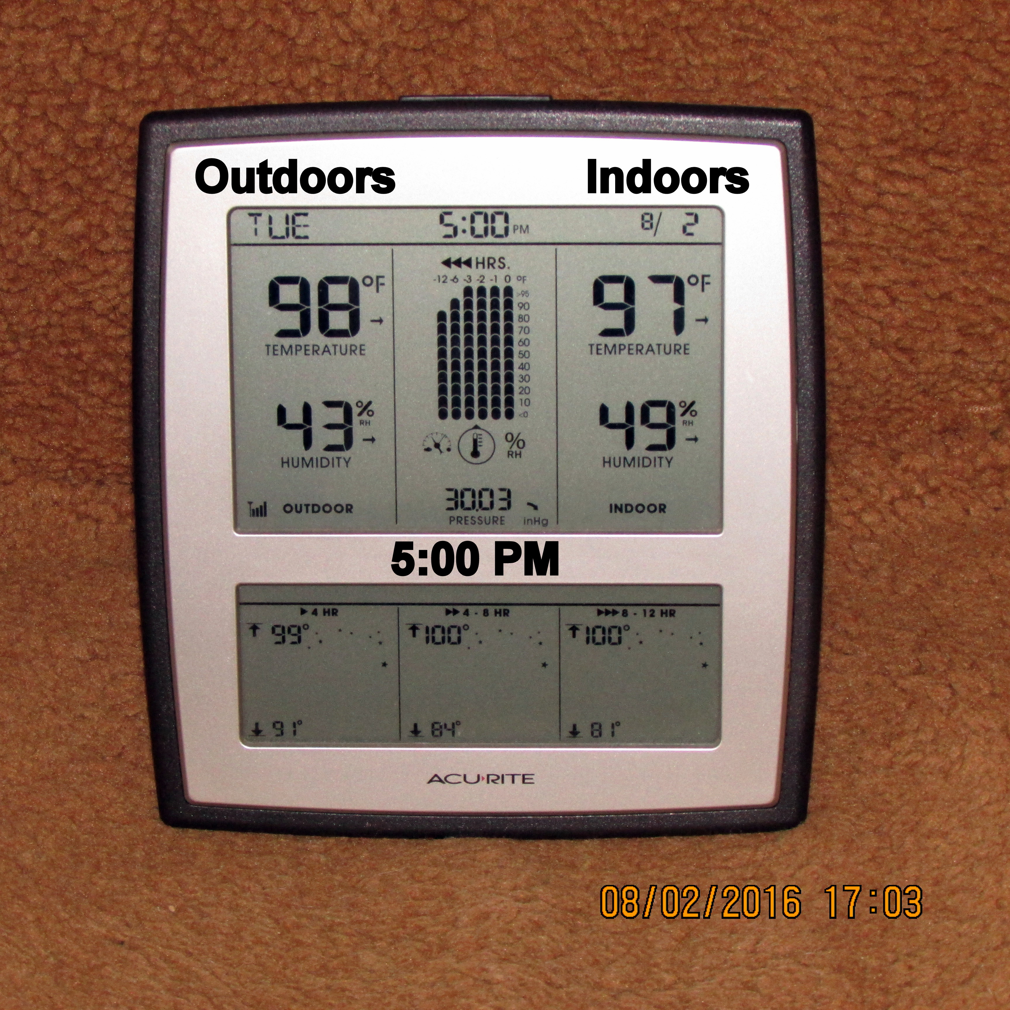 3:00 PM: The “overnight” package has not arrived. Even if it were on-site, obviously, far too hot for David to be working on top of my trailer home!!