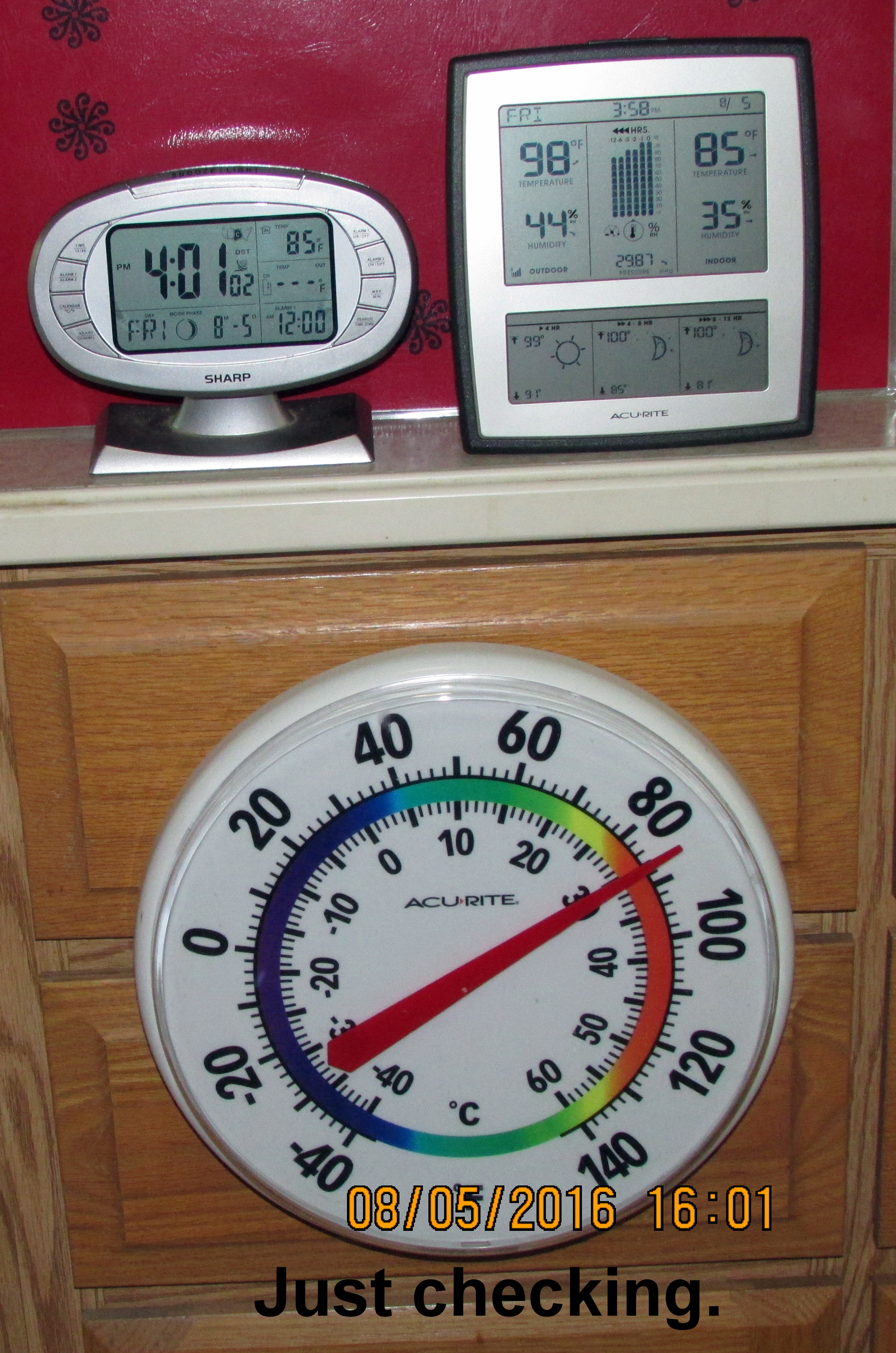Forgive me?! I intended to refrain from pictures of the thermometers. This afternoon I wanted to check temperature against the thermostat setting. Wow, big discrepancy!!