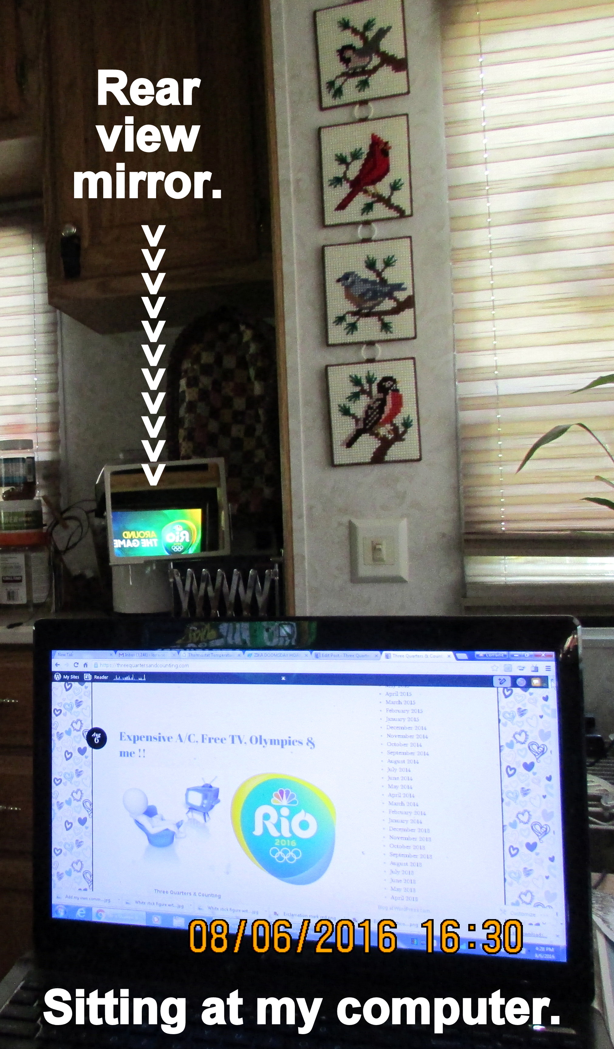 Multitasking?? No, multi-pleasure!! I have free WiFi from the CARE Center (to create these blog messages). I have free TV via a through-the-air antenna. My trailer home is cool and comfortable via the recently installed air-conditioner. Earlier today, I shopped for groceries and have enough food for the duration of the Olympics!!