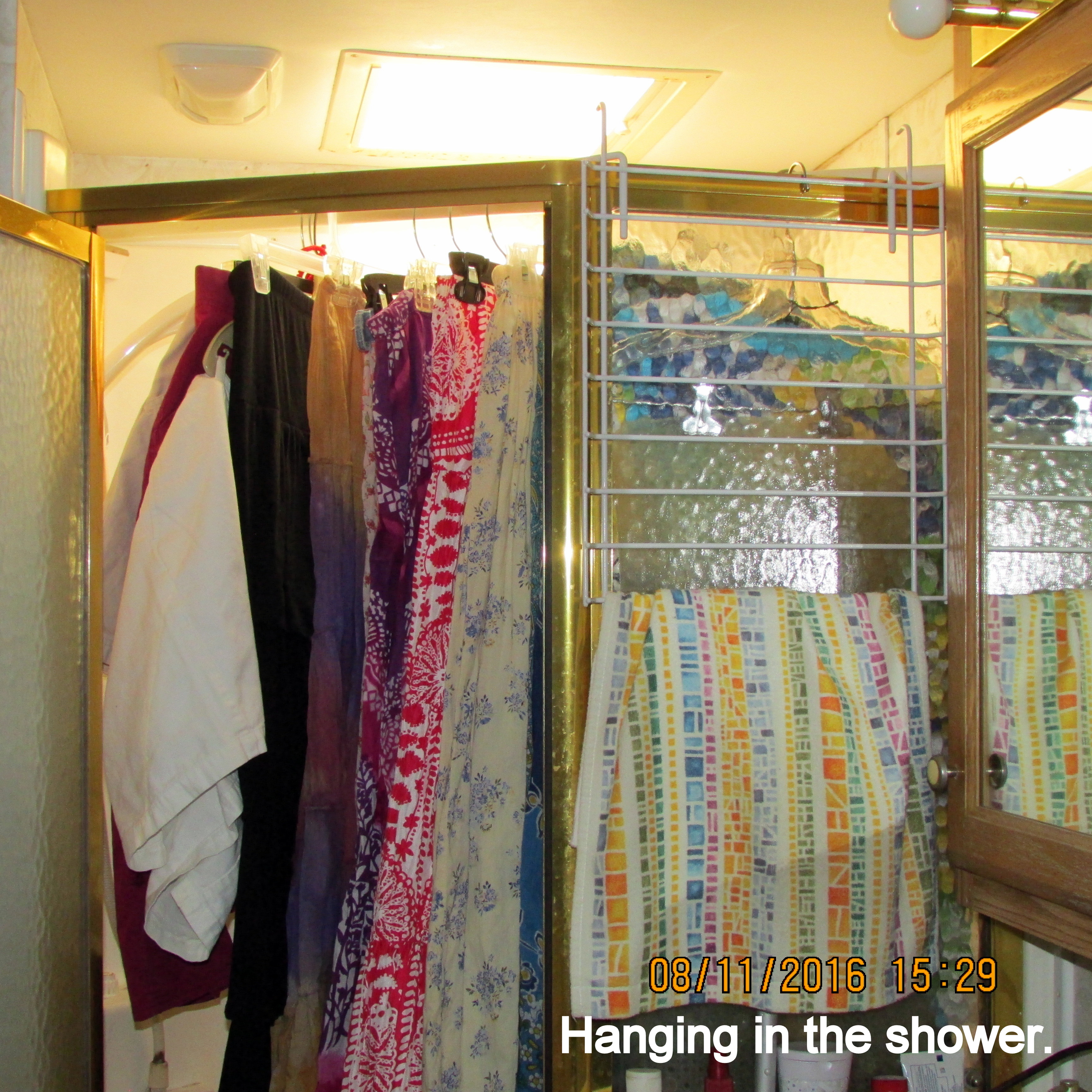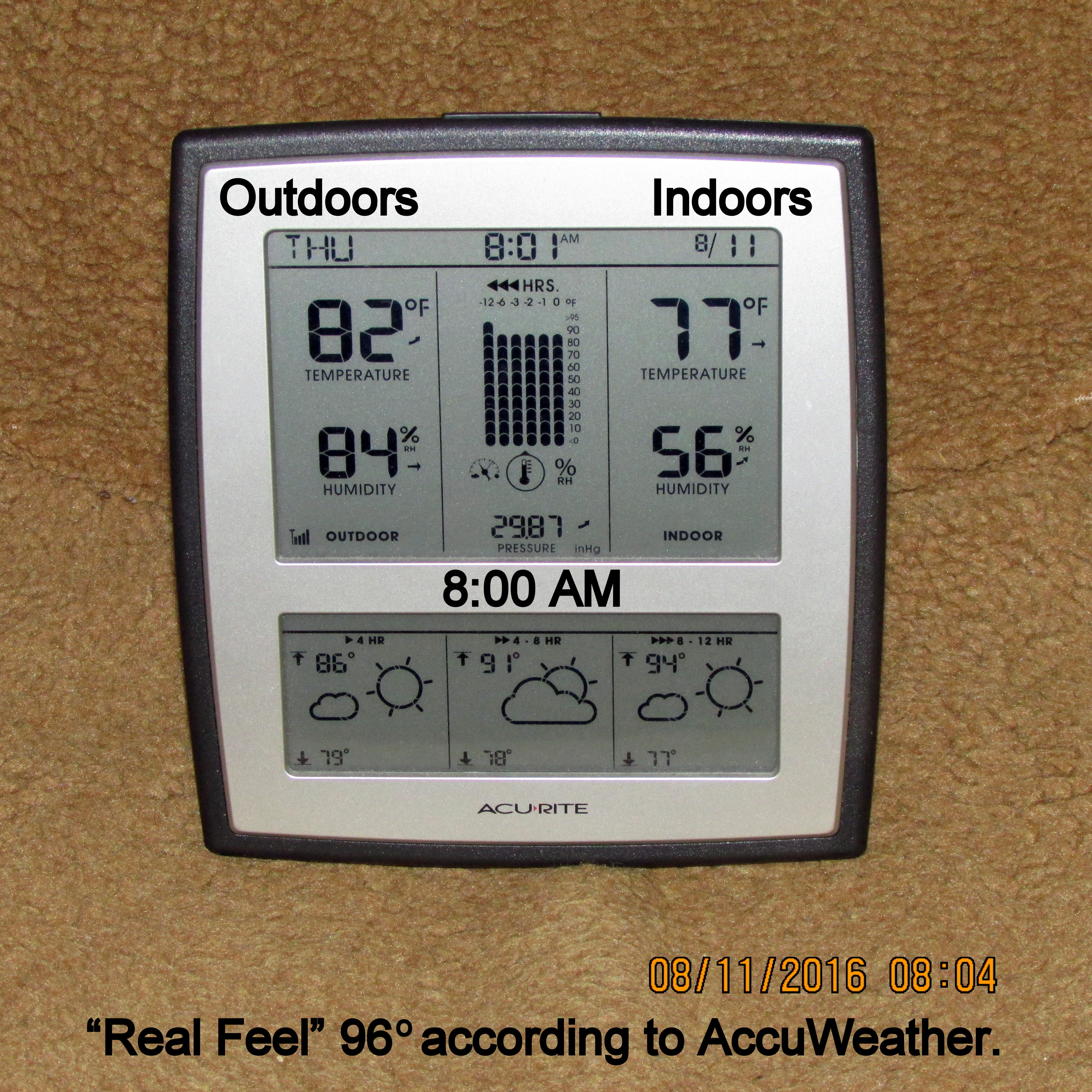 All my summer wardrobe was dirty!! I couldn’t procrastinate any longer!! At 5:30 AM, I was in the laundry room of the adjacent RV Park. Even with an air-conditioner running (and I was the only customer), the laundry room felt like a sauna (at 5:30, 6:00, 6:30, etc.). If I’d been a Hershey’s bar, I would have melted; likewise, a stick of butter…. No relief whatsoever from the heat, outdoors before sunrise!! It was such a joy to return to my cool and comfortable trailer home–at eight o’clock. As I mentioned on a picture, clothes may not “air dry” due to dense humidity (84%).