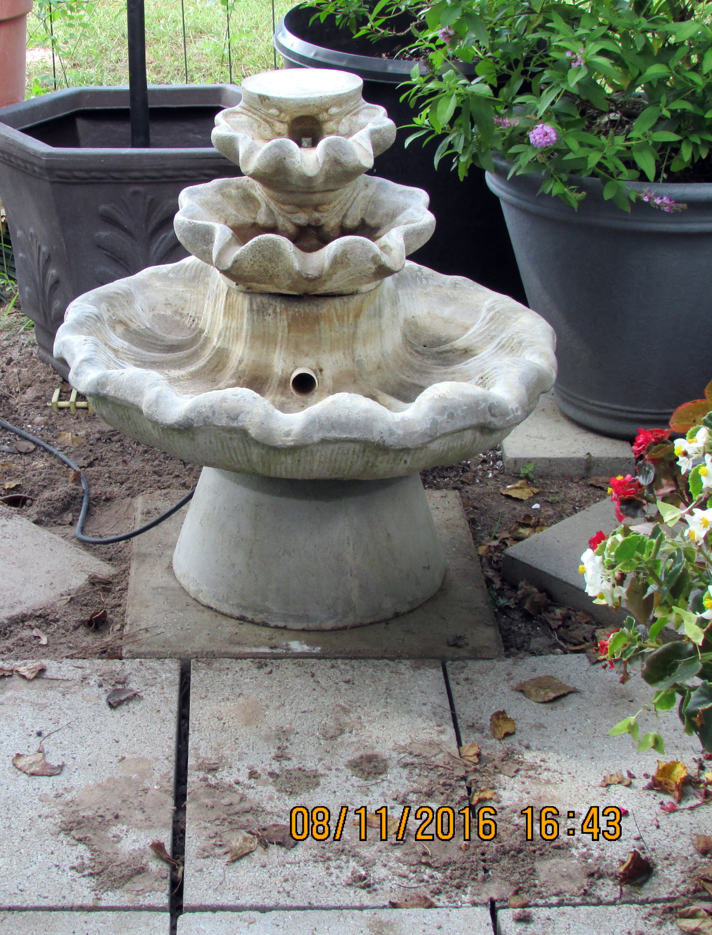 Impulse shopping; I couldn’t resist!! I have a very satisfactory fountain/bird-bath but succumbed to the temptation to purchase the cement fountain. The several pieces weigh a lot; I needed to recruit a strong man to help me get it into the desired position. Our CARE Thrift ‘n Gift Shop benefited from the sale; my yard gained a sculpture.