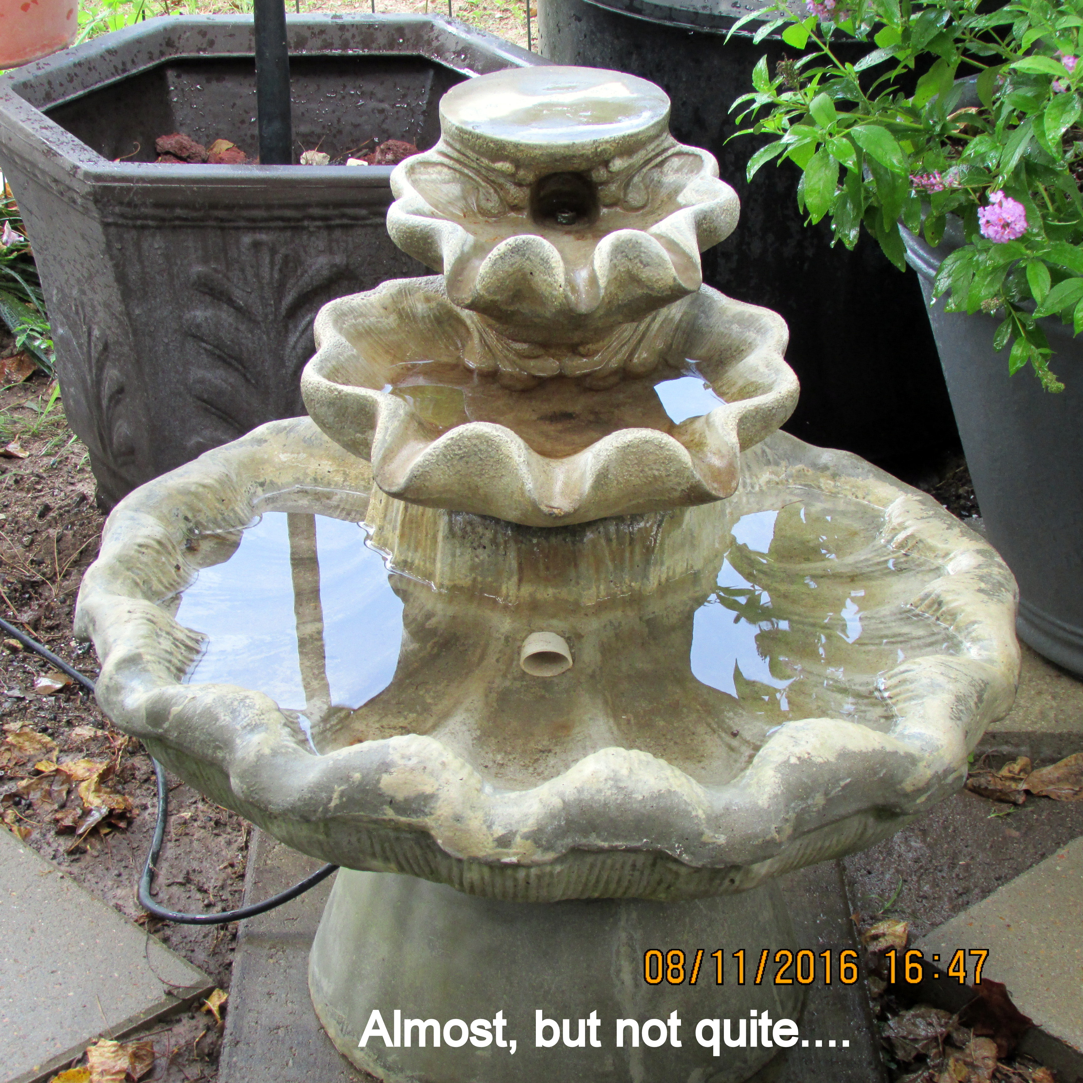 A length of plastic tubing needs to be purchased before the pump cascades water from top to center, to lower. I’ll watch for something large and decorative for the top. This bird would be appropriate, and the angel is adorable.