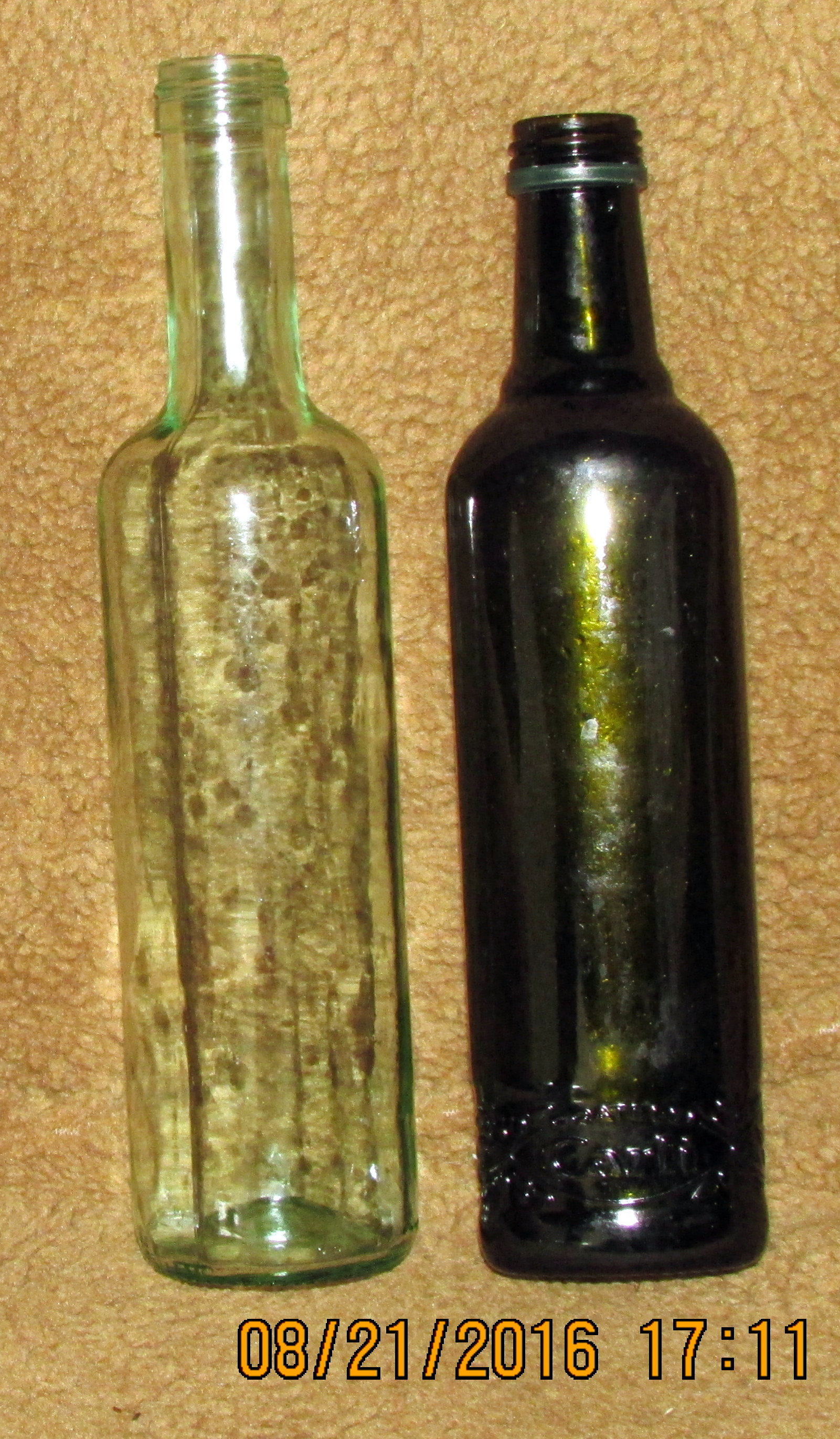 Recently, I found several in a local Thrift Shop. Today, I rescued a vinegar bottle and a virgin olive oil bottle from trash in the CARE Dining Room. I’ve soaked the labels off and they are sparkling clean and eventually ready for display.