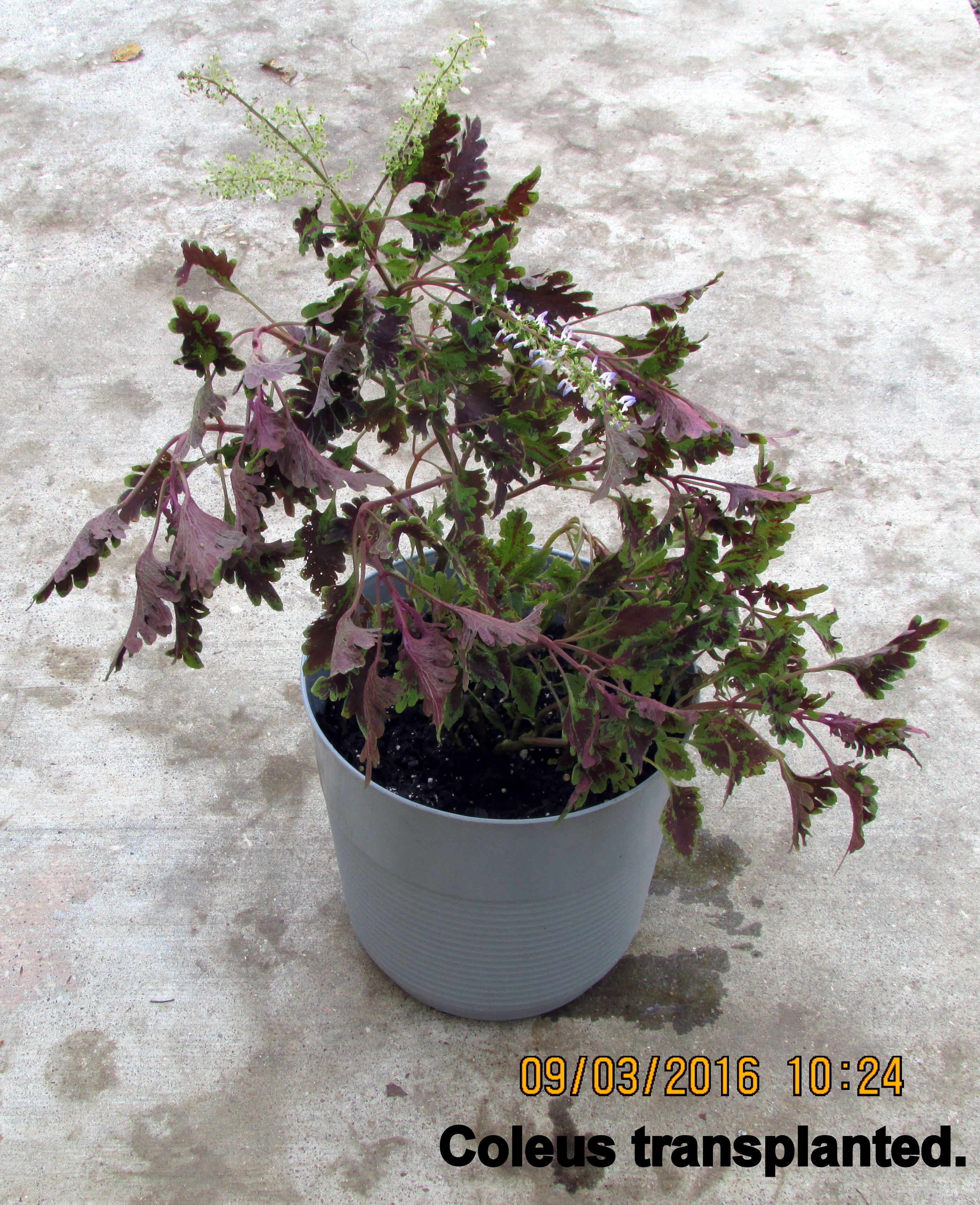Every time I shop at Lowe’s, I check the mark-down plants in the garden department. Even though I don’t “need” any more plants, I succumb to the purchase of items for one dollar (or three dollars). The Coleus is ten times larger than when I brought it home–and overdue for a larger planter. Likewise the Lantana has thrived, and bloomed, and overdue for a larger planter.