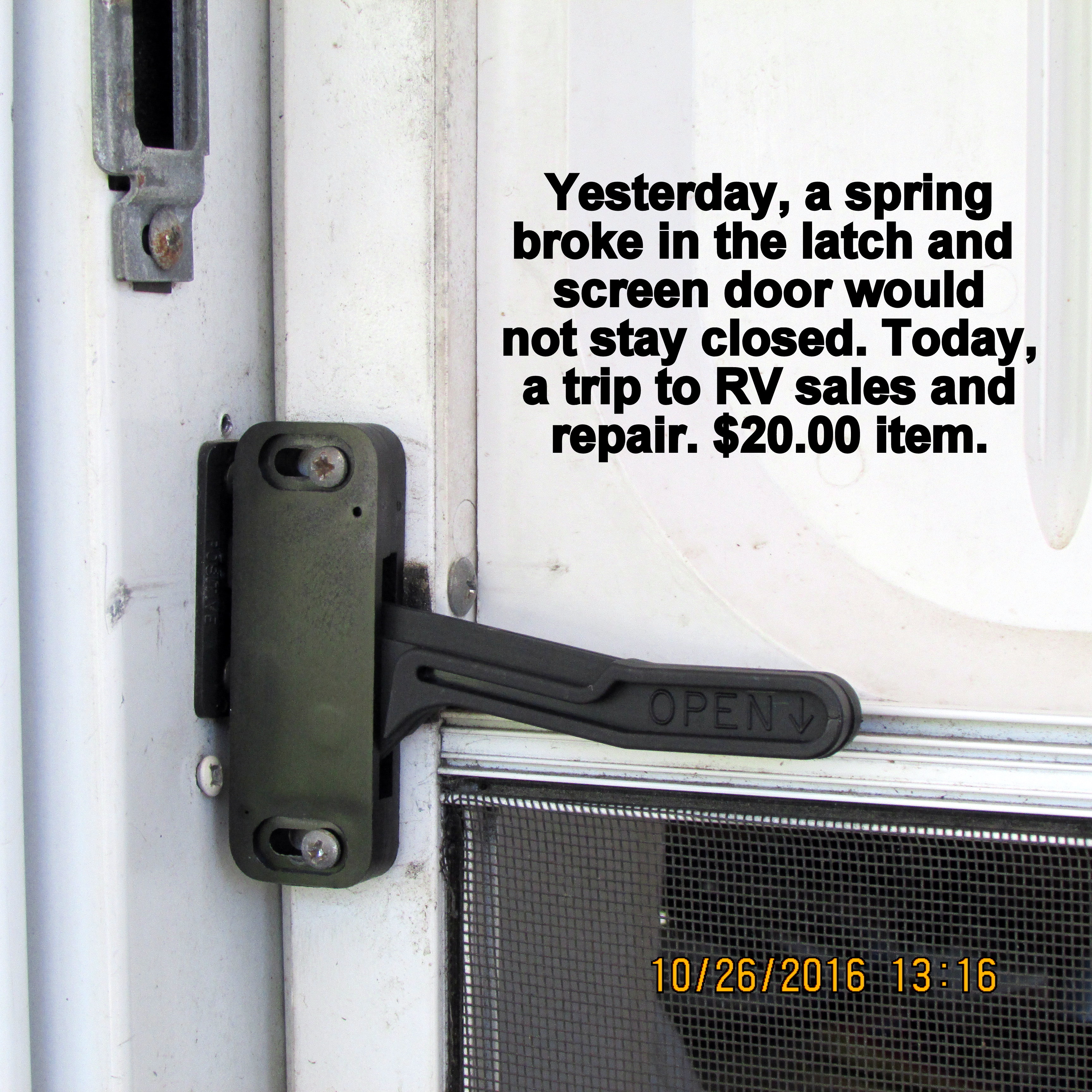 This morning, a trip into Livingston for the screen door latch. It took about two minutes to remove old (for a sample), and five minutes to get the new one out of the box and installed. Twenty bucks!!