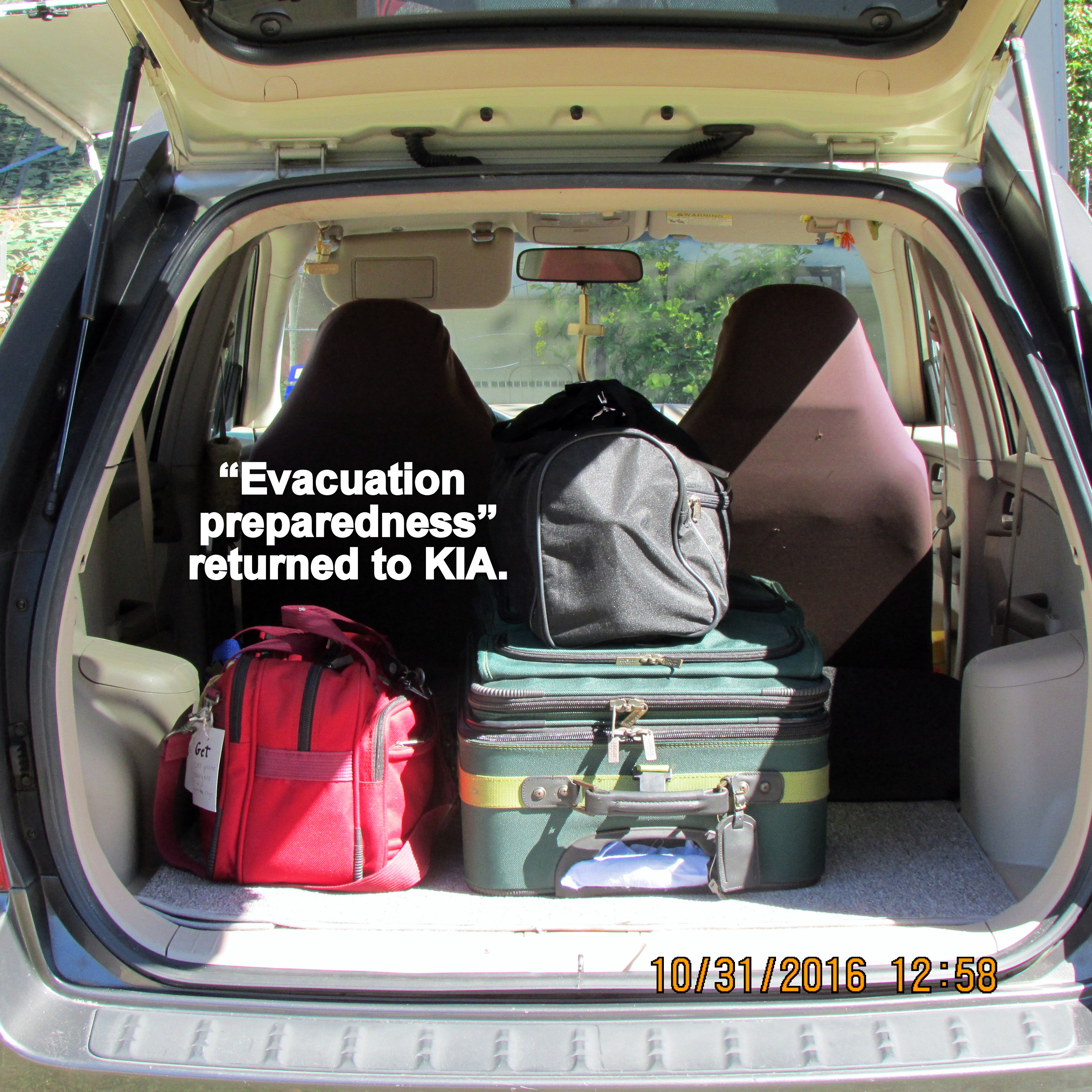 The back of my SUV has served as a pickup truck!! I’d lost track of all the stuff stored behind the front seat. Furthermore, those several “emergency evacuation“ bags. Everything came out and I’ll evaluate what goes back into the KIA.