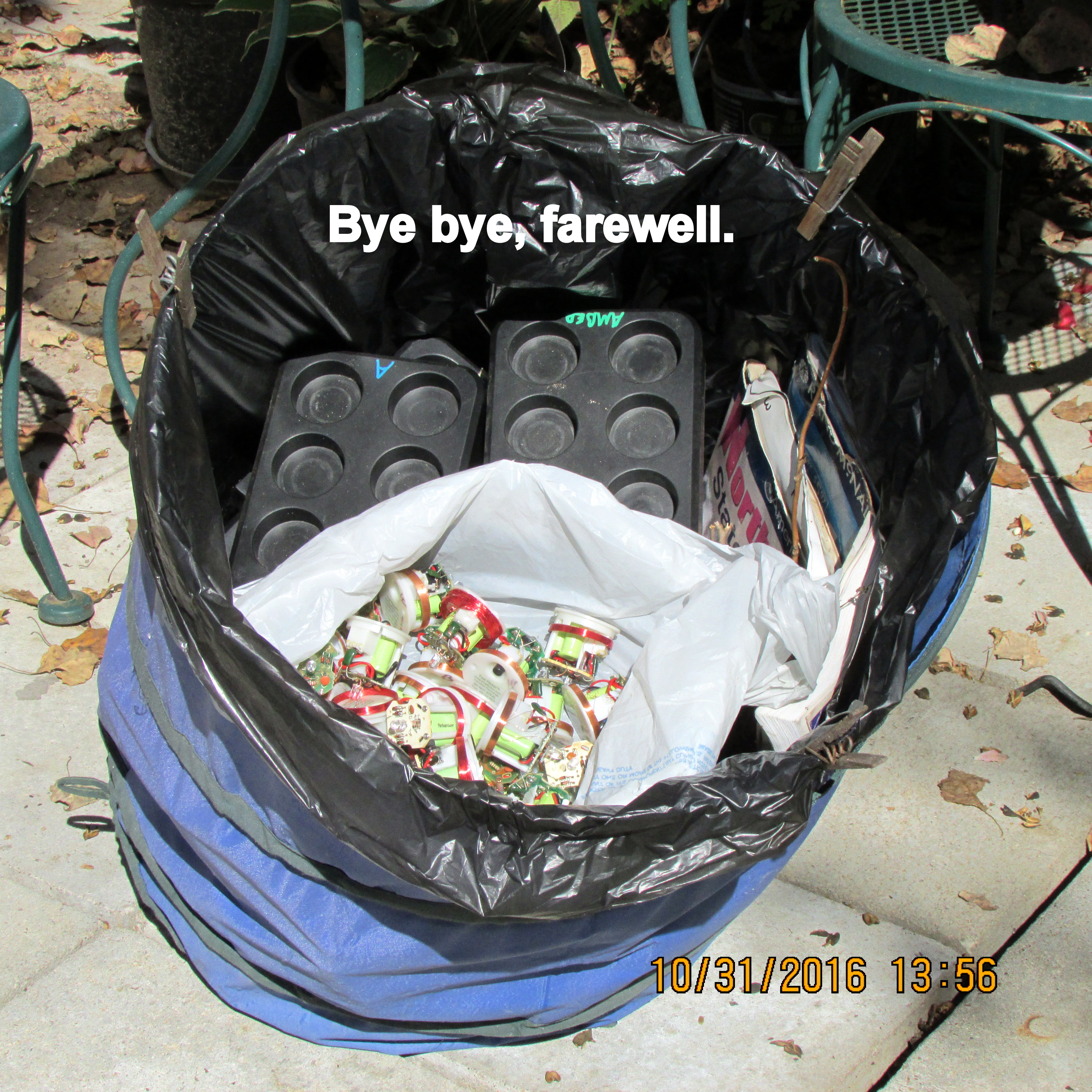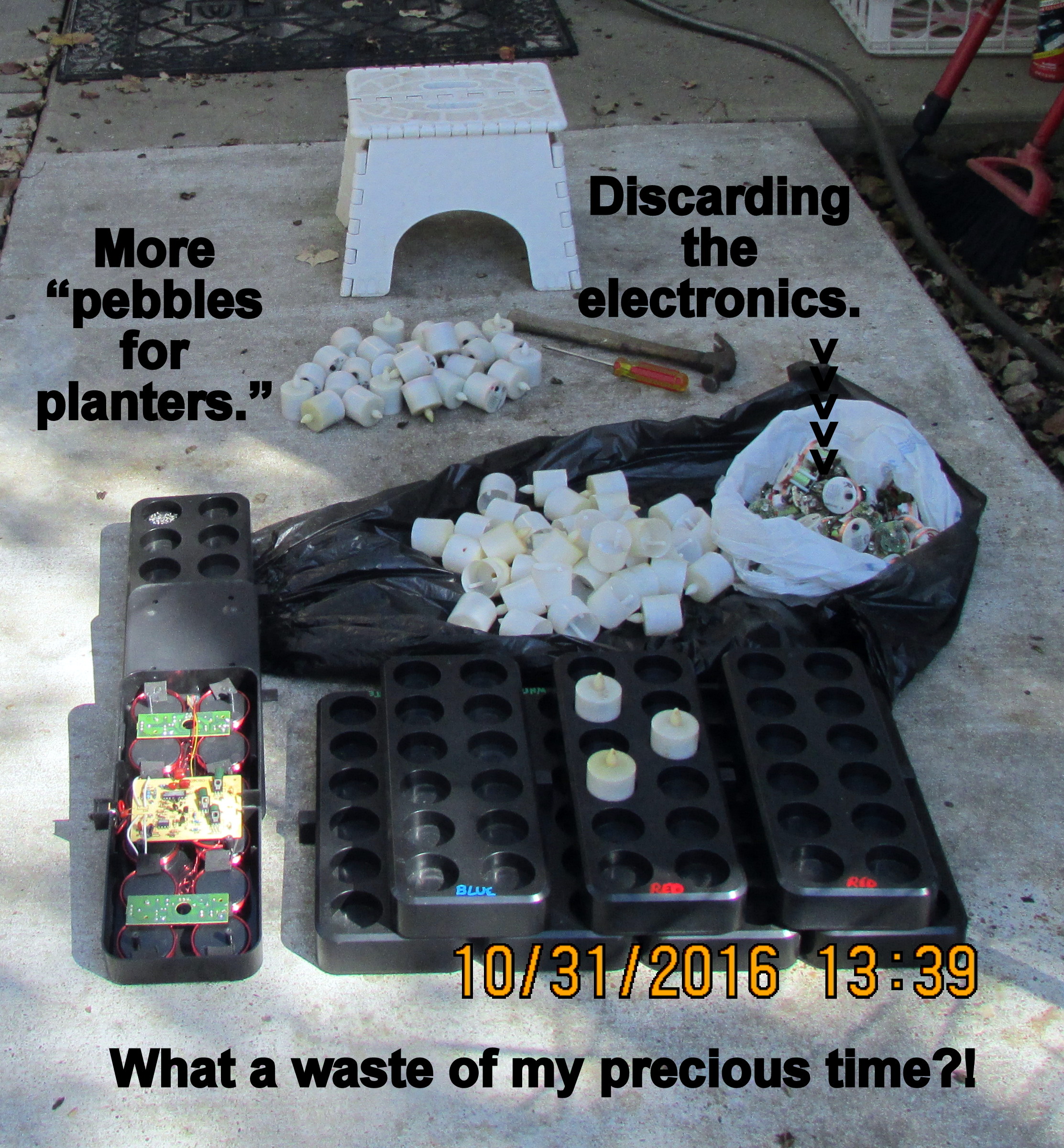 “Yours truly” had no desire to attend the CARE Halloween party at 2:00 PM. Instead, the old lady sat on the white step stool and systematically removed the electronics from the candle. The candles were destined for “the dump” after the CARE Thrift ‘n Gift yard sale a week ago. I rescued them, and boxed them neatly. Surely they would be appreciated by a local craftsman? Coincidentally, providentially, the man (craftsman) was at the CARE Center early this morning and I told him I had a treasure for him. Come to find out, he donated them because they don’t work. So-o-o-o, in the interest of salvaging them, I took them apart, discarded the electronics, and will add the small plastic pieces to my “pebbles for planters.” Such a waste of my precious time?!