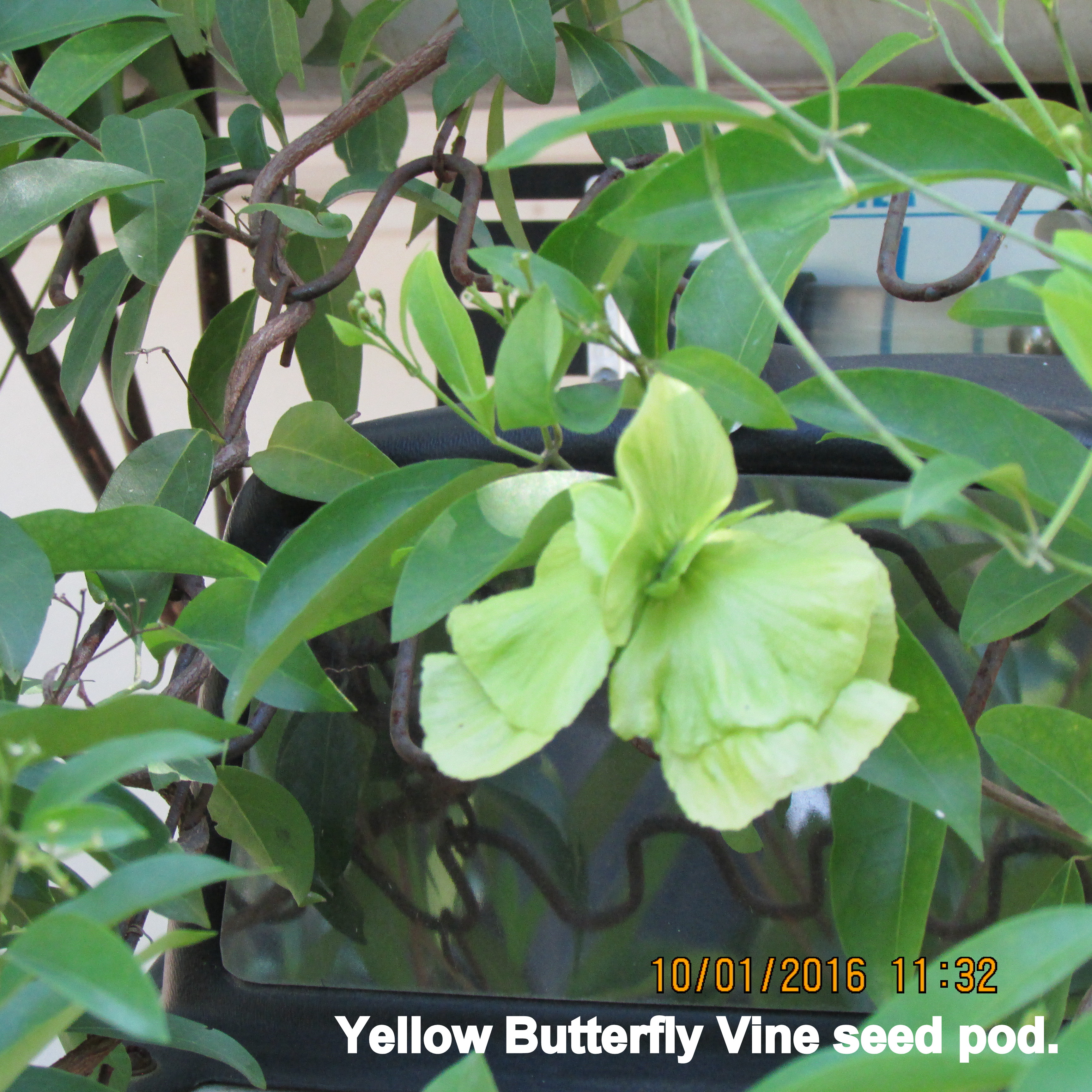 My garden has a story to tell–and I’m eager to listen. I was very surprised to see that strange green growth on my Yellow Butterfly Vine. I went to the Internet for an answer and discovered this Yellow Butterfly Vine information: “The clusters of dainty flowers on Butterfly Vine shine as brilliant as the summer sun. But it’s the seed pods that give the plant its name. During summer, chartreuse ‘wings’ unfold on the seed pods that look like butterflies. The papery pods will turn tan to brown as they mature, and they can be harvested and planted….”