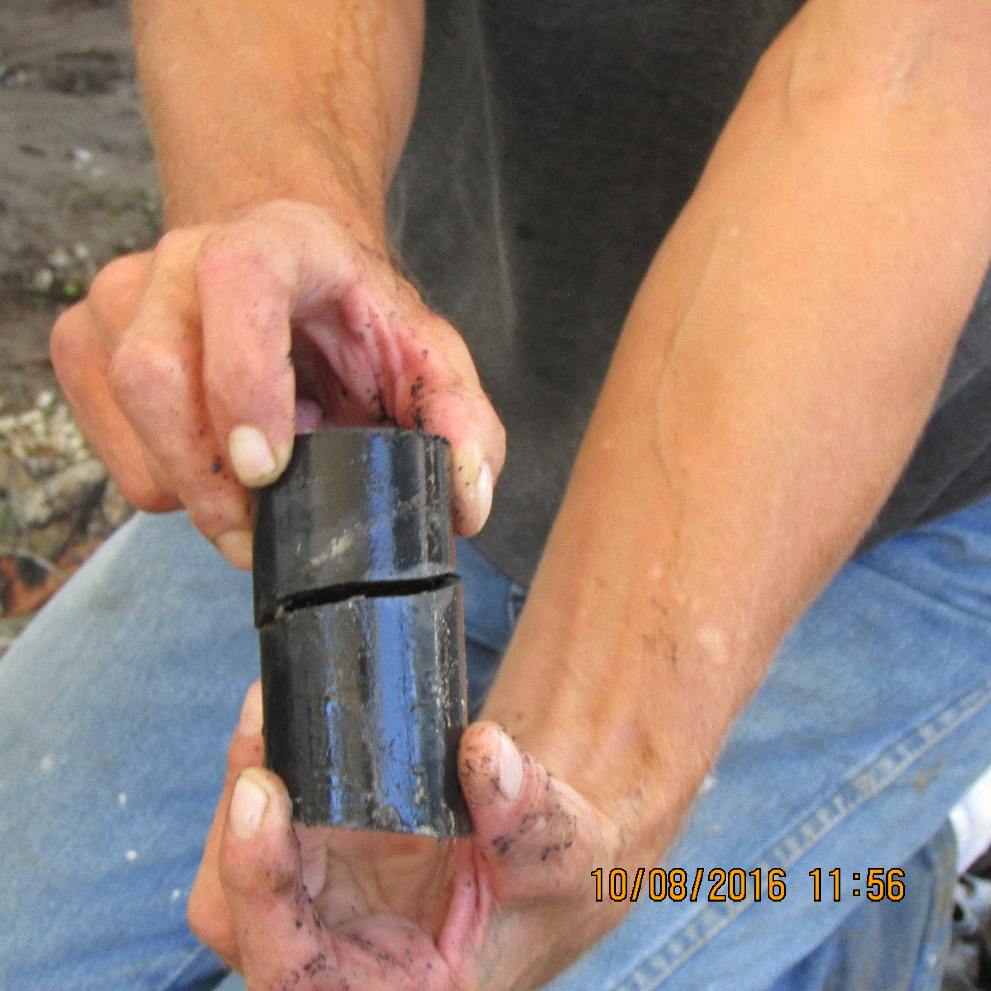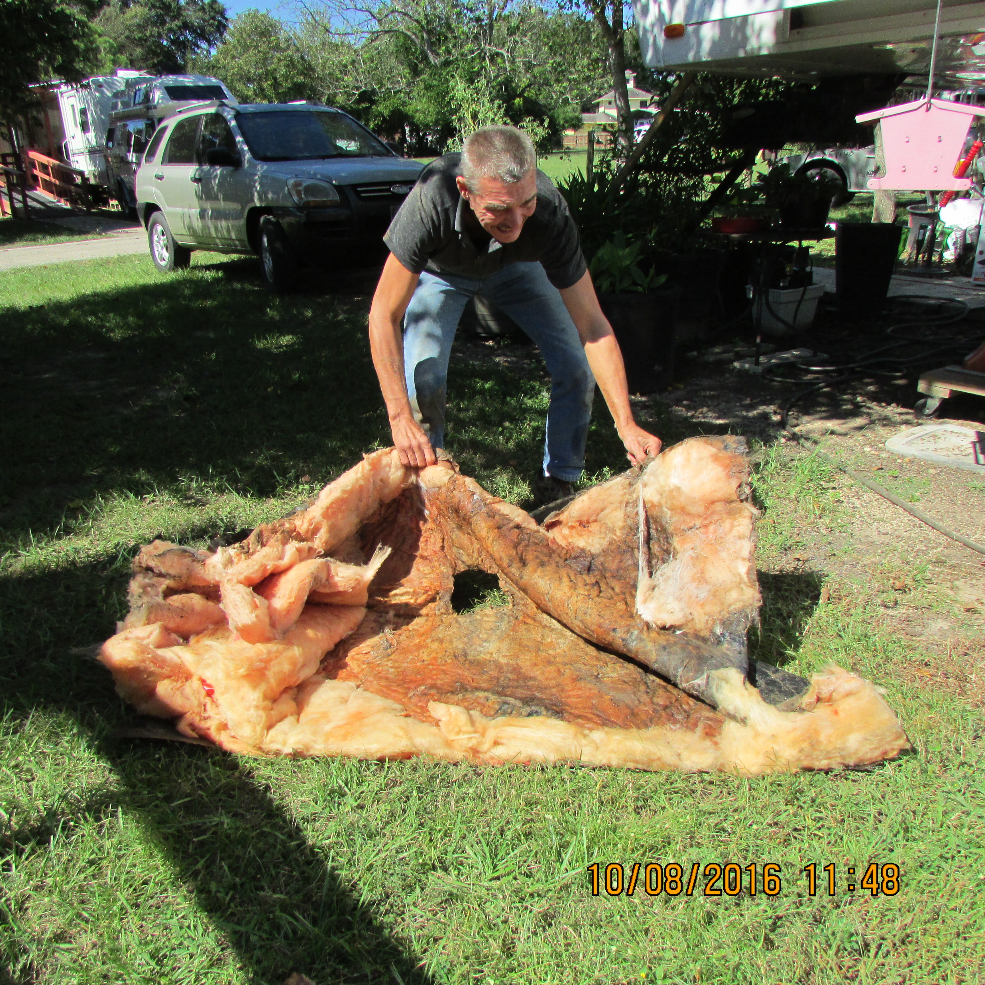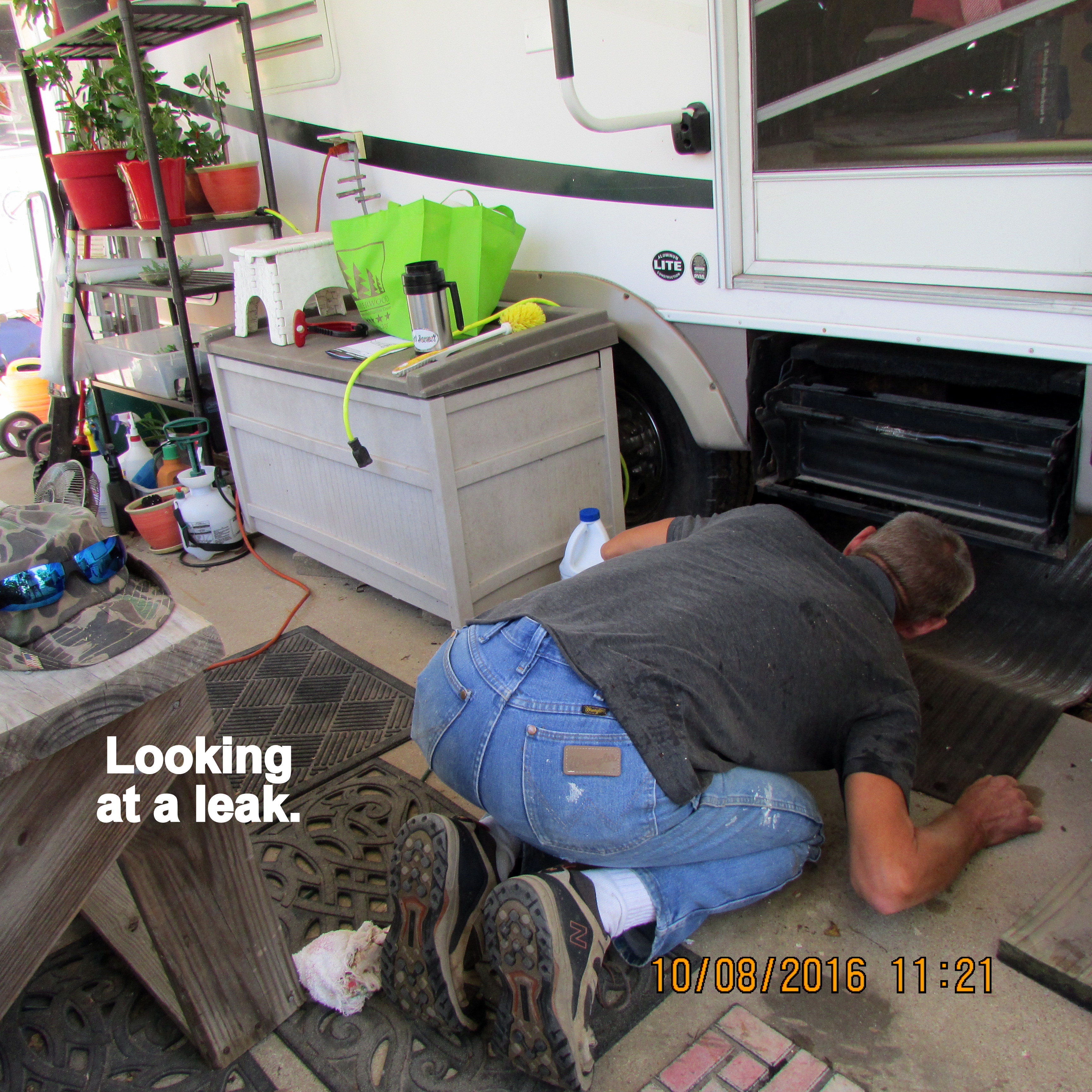 “Yes, both tarps were used under the trailer” (to lay on). Nasty job!! Honestly, I’ve noticed what I believed to be “a little leak.” However, Jim and Roger were concerned enough to crawl under the trailer looking for the source. OMG!! There was a big crack in a pipe and water had been collecting in the insulation for a long time. After a trip to Lowe’s, the broken pipe was spliced. Now we wait for everything to dry out. Later, they will install new insulation under the trailer.