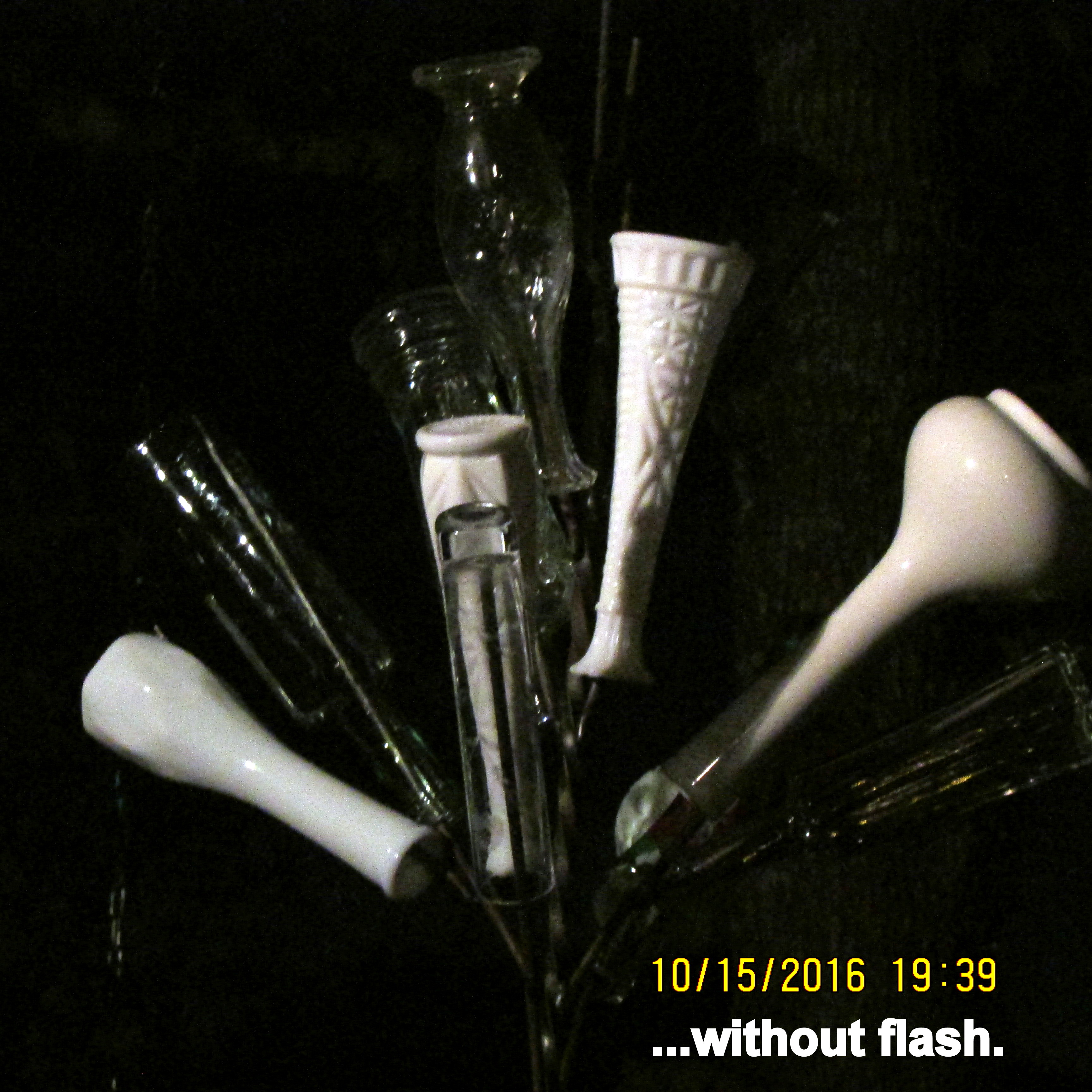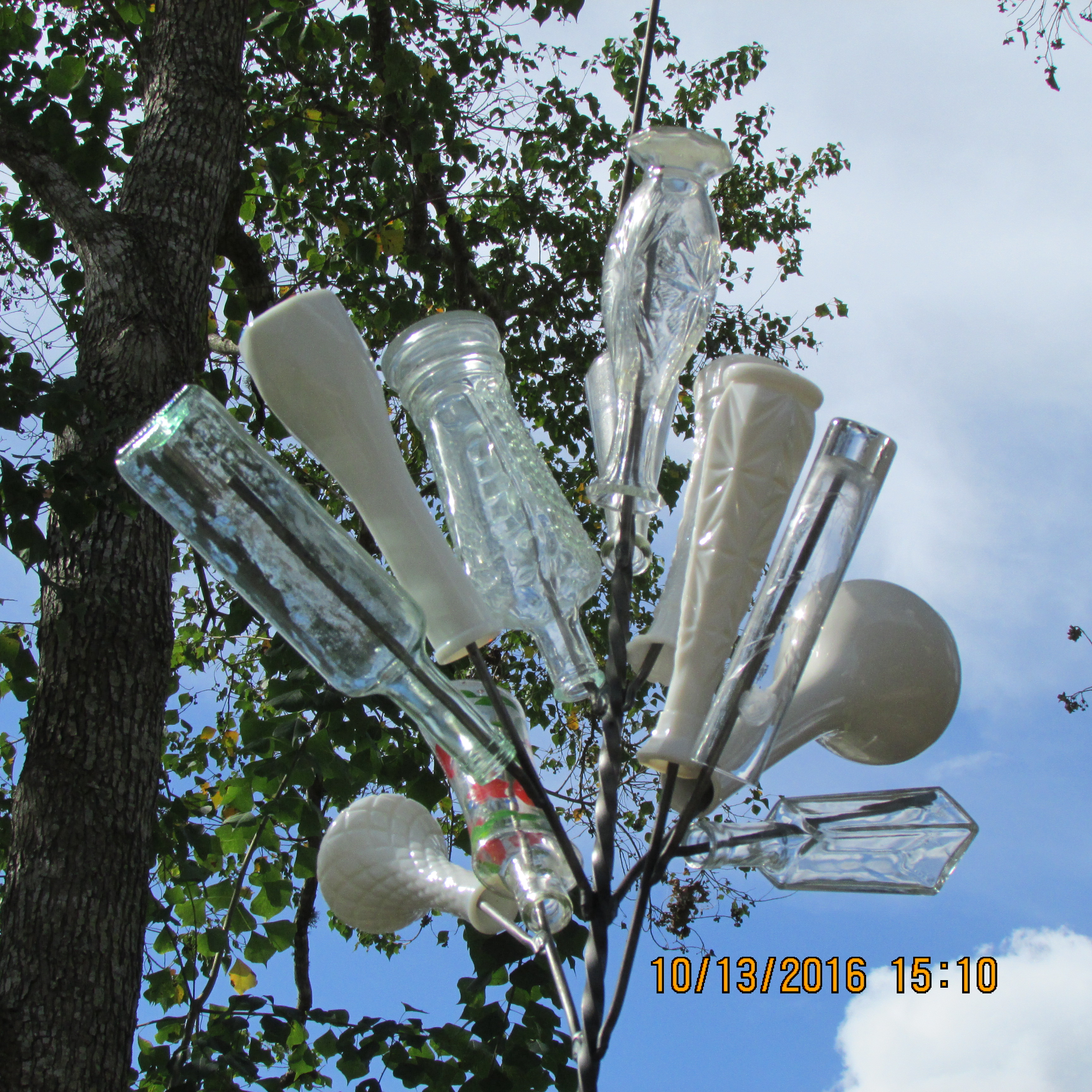 Postscript, Friday morning, ten o’clock. I confess: I love to sit on my patio, with a cup of coffee, and admire my “yarden.” I couldn’t resist another picture of the hanging vases. I’m contemplating red, and green, bottles and/or vases for Christmas. They would be attractive when the trees have shed all their leaves?!