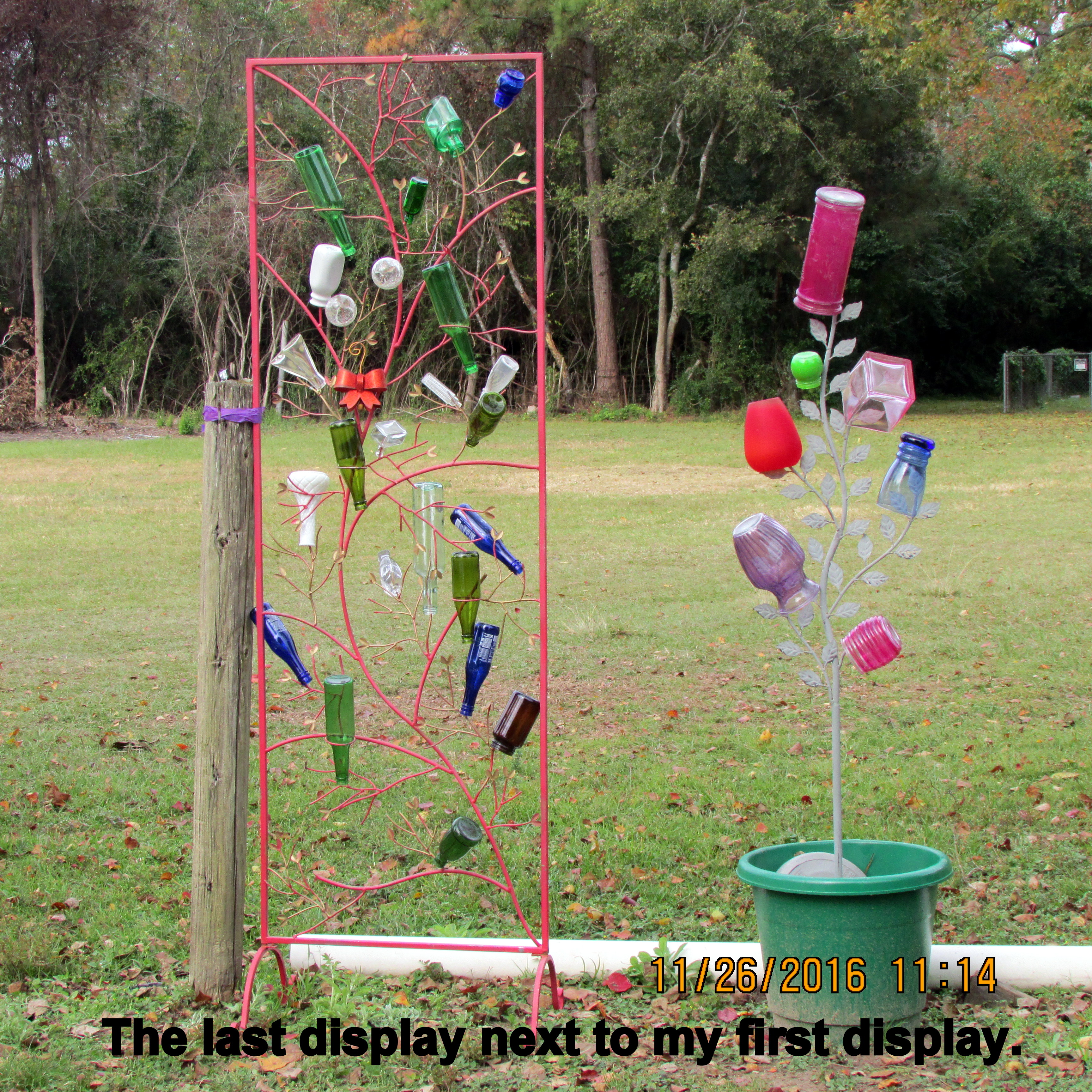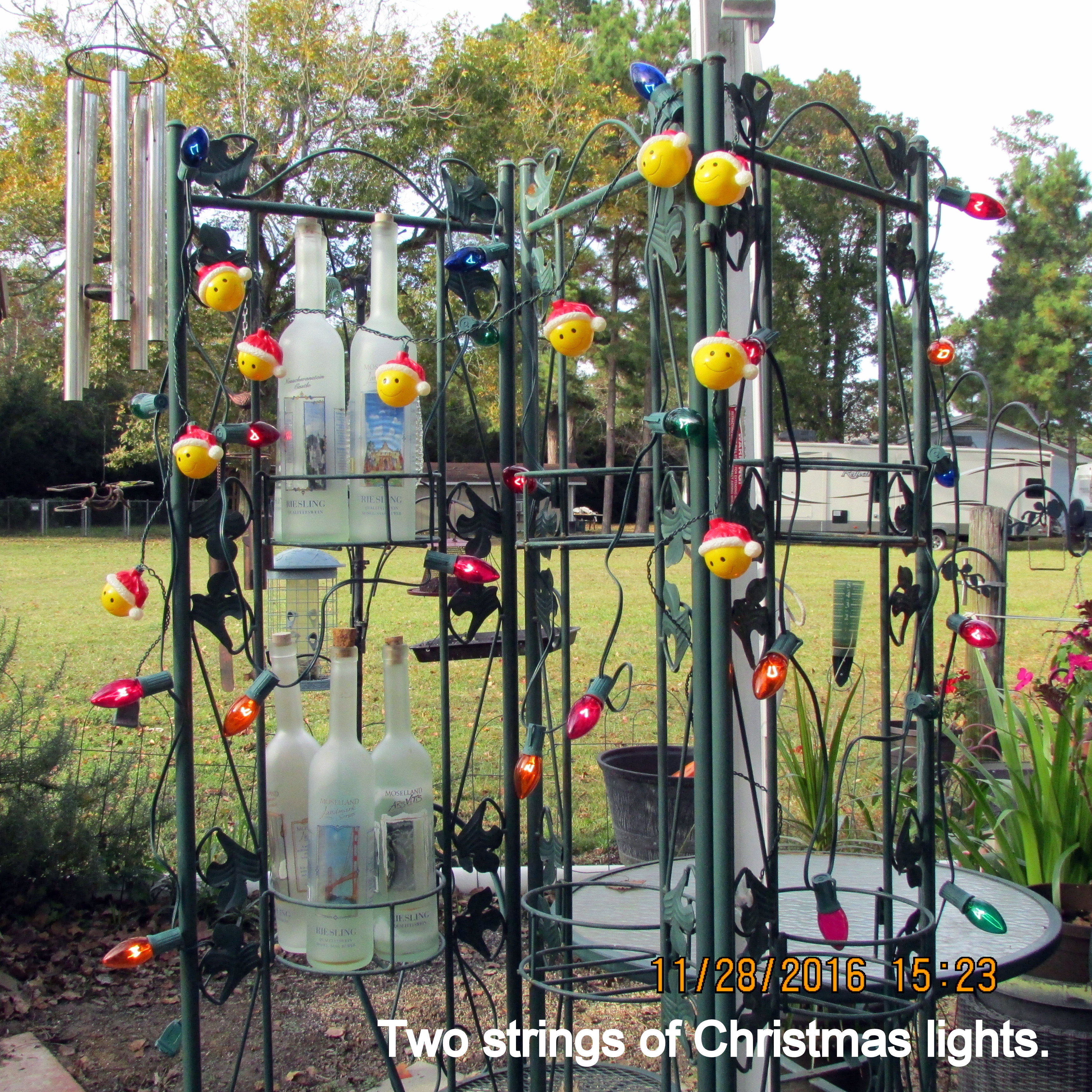 Postscript: Unplanned, I draped Christmas lights on the plant stand on my patio. I was organizing things for the Christmas Bottle Tree and do not want to mix miniature lights with strings with larger bulbs. The Smiley Faces were a gift, and date back to 2010 and were on display in my T@B teardrop trailer. I was volunteering at Wycliffe Associates (Wycliffe Bible Translators) in Orlando, Florida. ~~ Click on this link to read blog messages for this time frame in 2010.