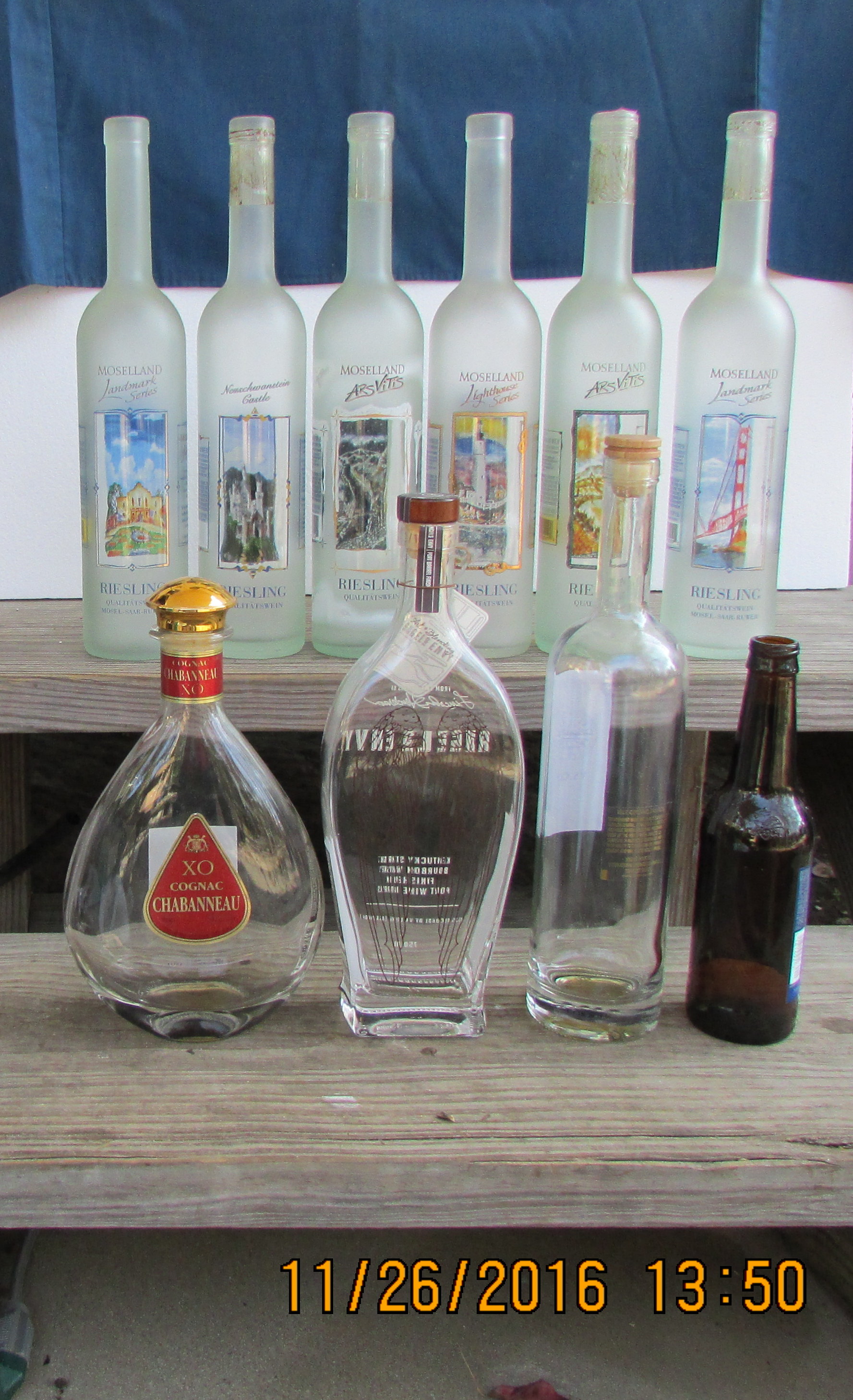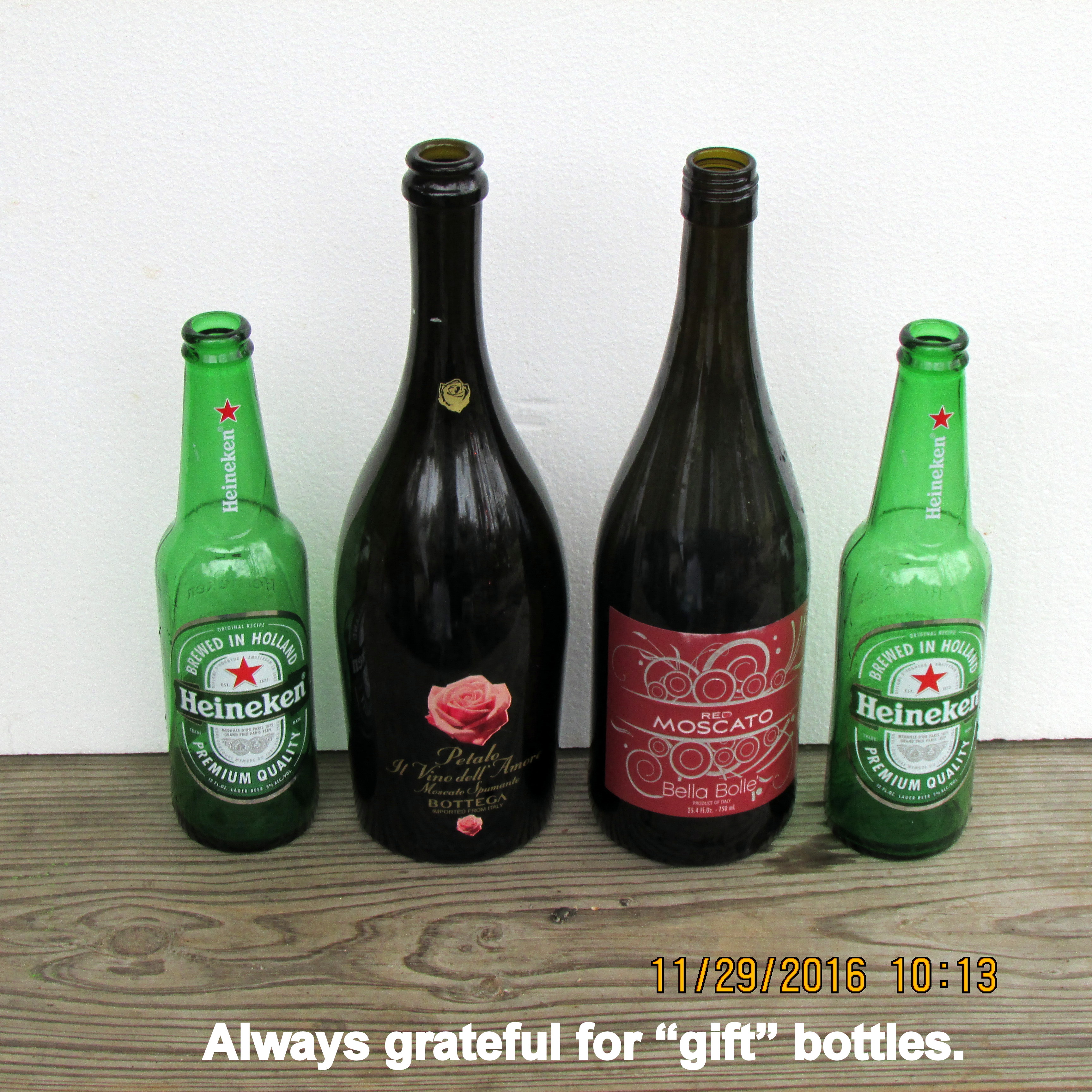Thick fog blankets the area so I do not have through-the-air television reception. No TV news “fix” first thing in the morning. So-o-o-o I sorted papers piled on the table (next to the computer) and discarded most. Out of curiosity, I gathered the store receipts and figured the totals spent (at each store) for beer, wine, Martinelli’s Sparking Cider, Welch’s Sparking Grape, Perrier, Dollar Tree red vases, etc. Then I added the expense of the several Bottle Bush, Hanging Bottle display, and two Thrift Shop display racks (modified as a “tree”). I’m too embarrassed to post the total!!