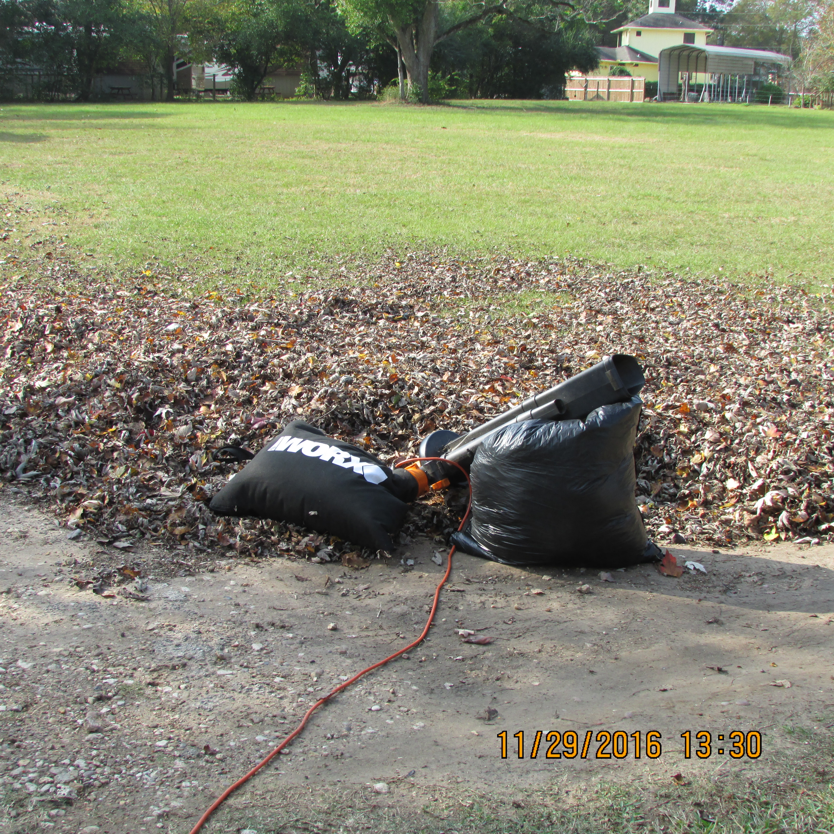 James was blowing leaves into a pile so the riding lawn mower could annihilate. I grasped the opportunity to easily suck leaves into my Worx blower/vacuum/mulcher. I have one-and-one-half trash bags full of minced leaves. One day soon, I’ll “mulch” around plants in my large planters.