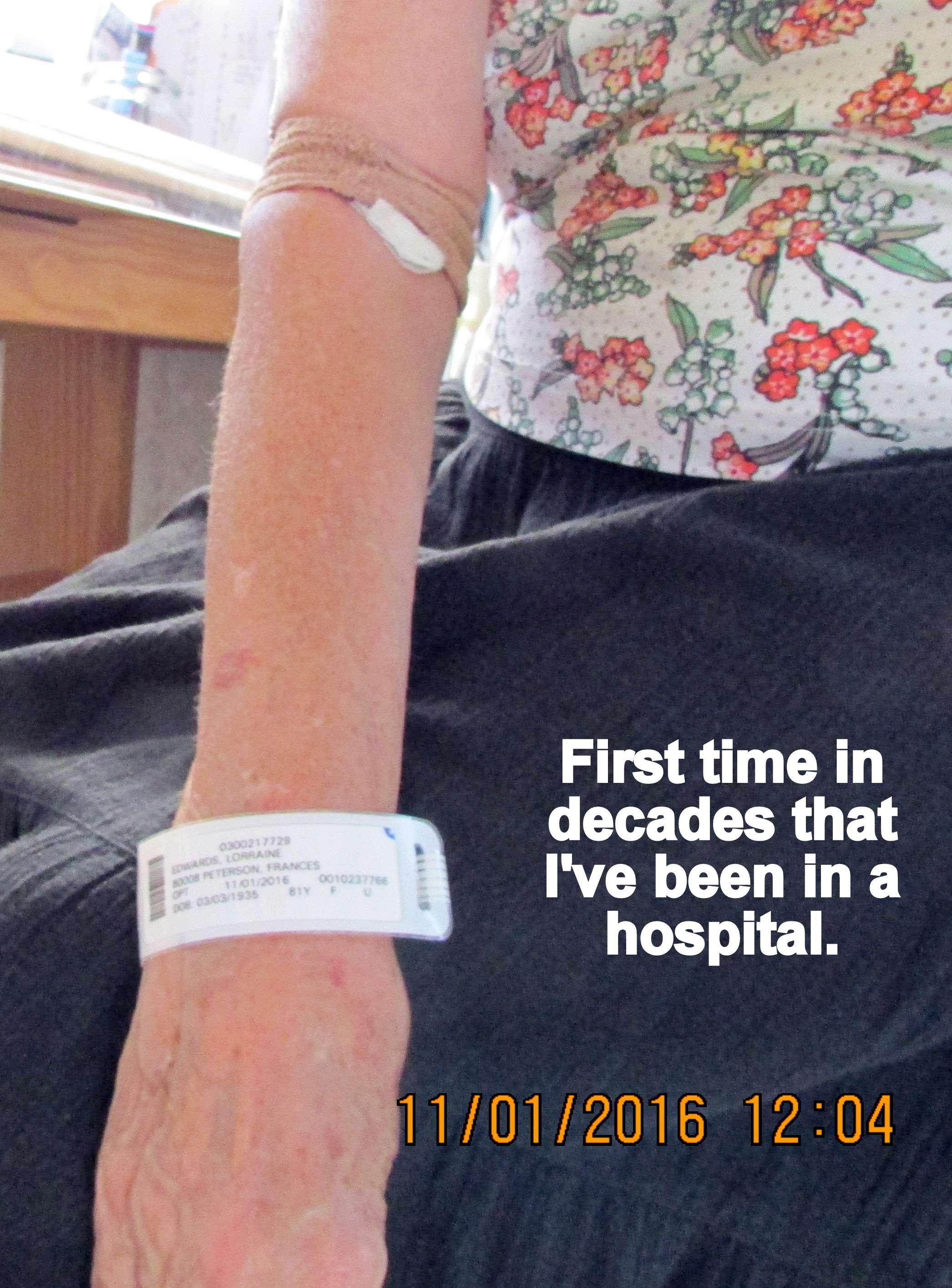 Hospital IDYou’ve heard me speak of years devoted to health and nutrition?! Yes, half my lifetime. I believe a “holistic” lifestyle has served me well. However, for almost two years I’ve had a persistent problem that I hoped, and prayed, would go away. It hasn’t!! Six days ago, I saw the Nurse practitioner at the clinic here at the CARE Center. Blood was drawn… and I’m anxious to hear the results. An appointment was scheduled at the local Livingston hospital. I had a restless night; I was showered, and dressed, before six and at the hospital before seven (appointment time). I’m doubly anxious for the results. You could care less **BUT** I have tiny veins that are difficult to locate. I resent being a “pin cushion” in the lab!! Both arms are bruised from last week and this week!!