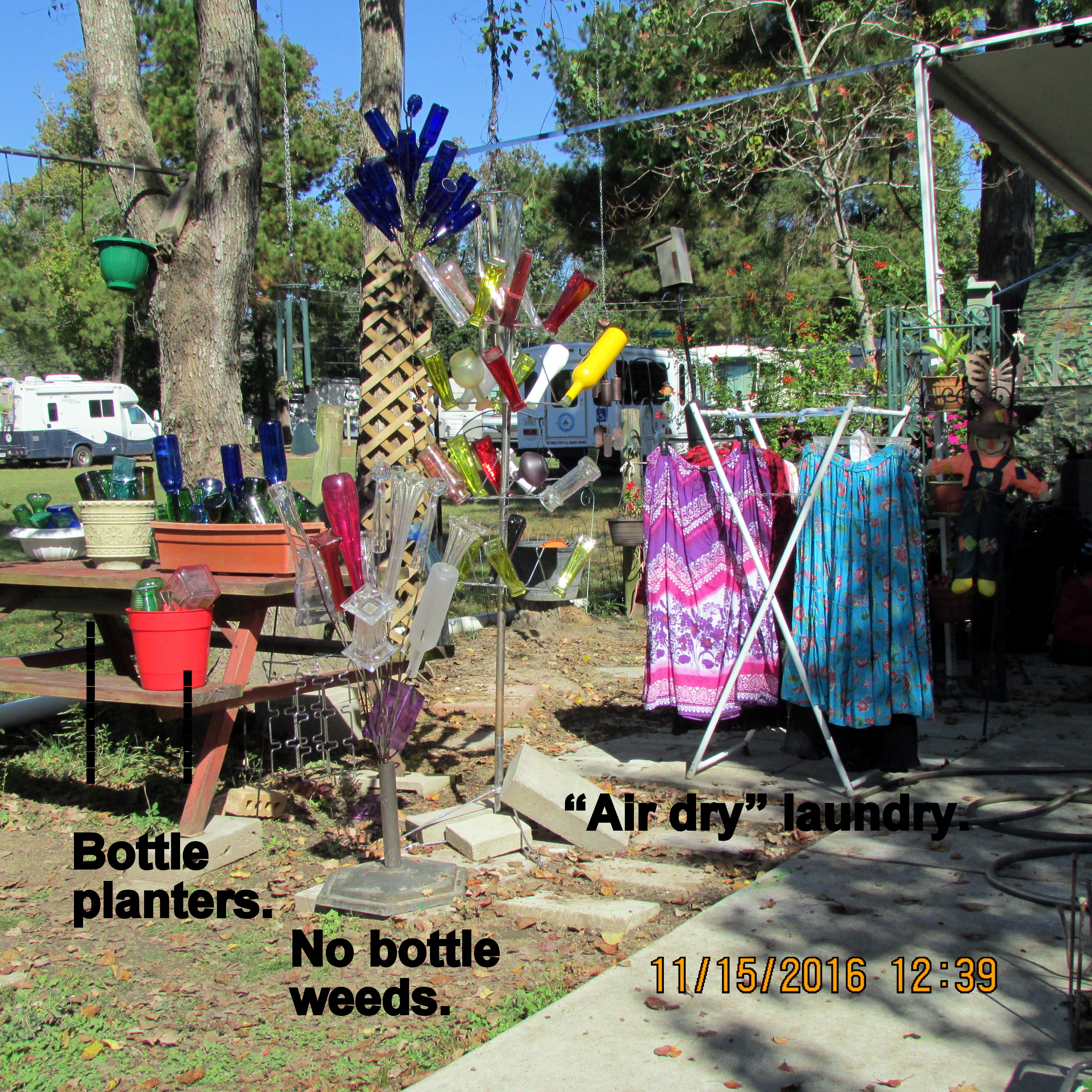 Today, I removed the wire “spiky” things that supported my “bottle weeds.” Hey, it was a novel idea but **not** my most creative project!! Now I’m adding green bottles to planters to simulate plant growth. More attractive (imho)?!