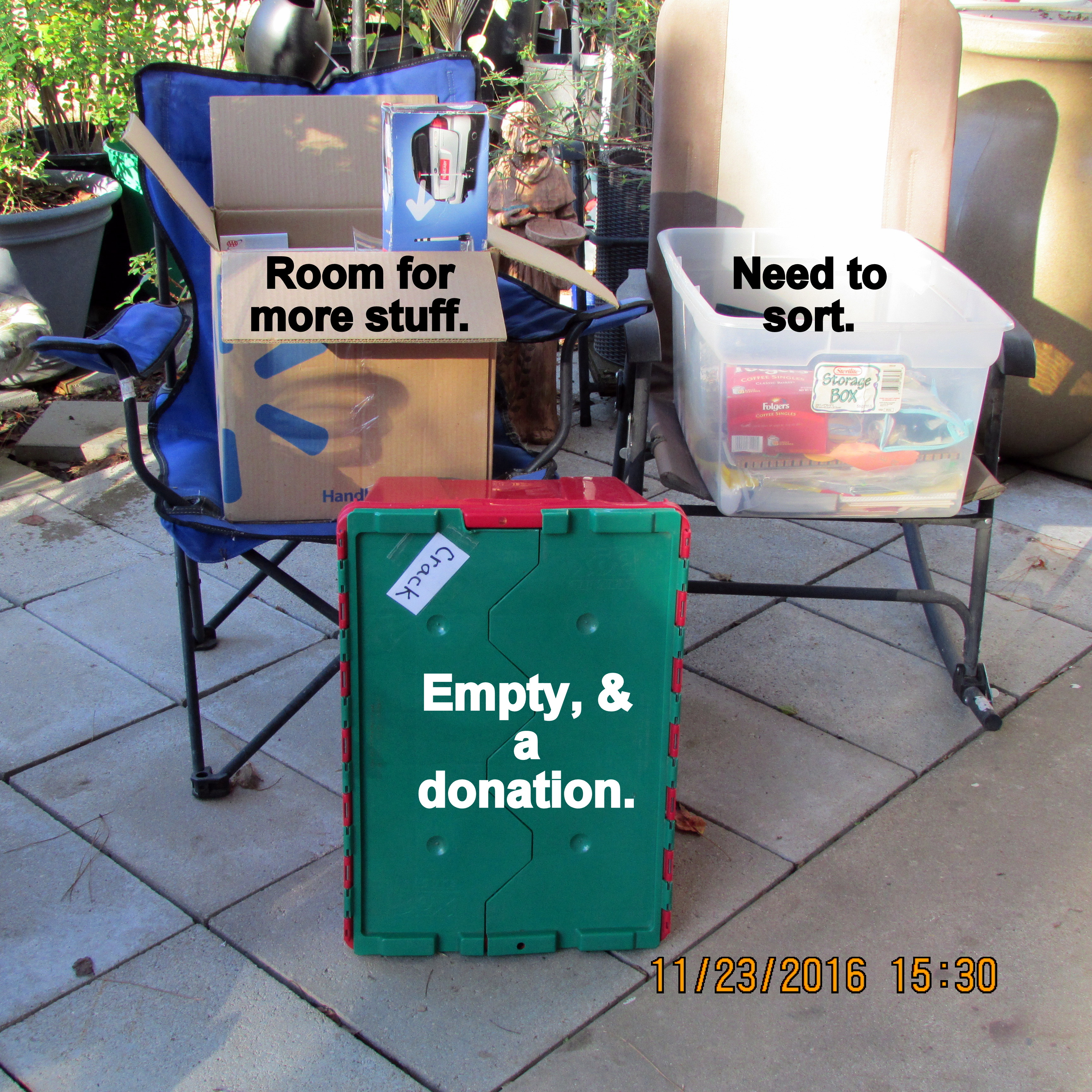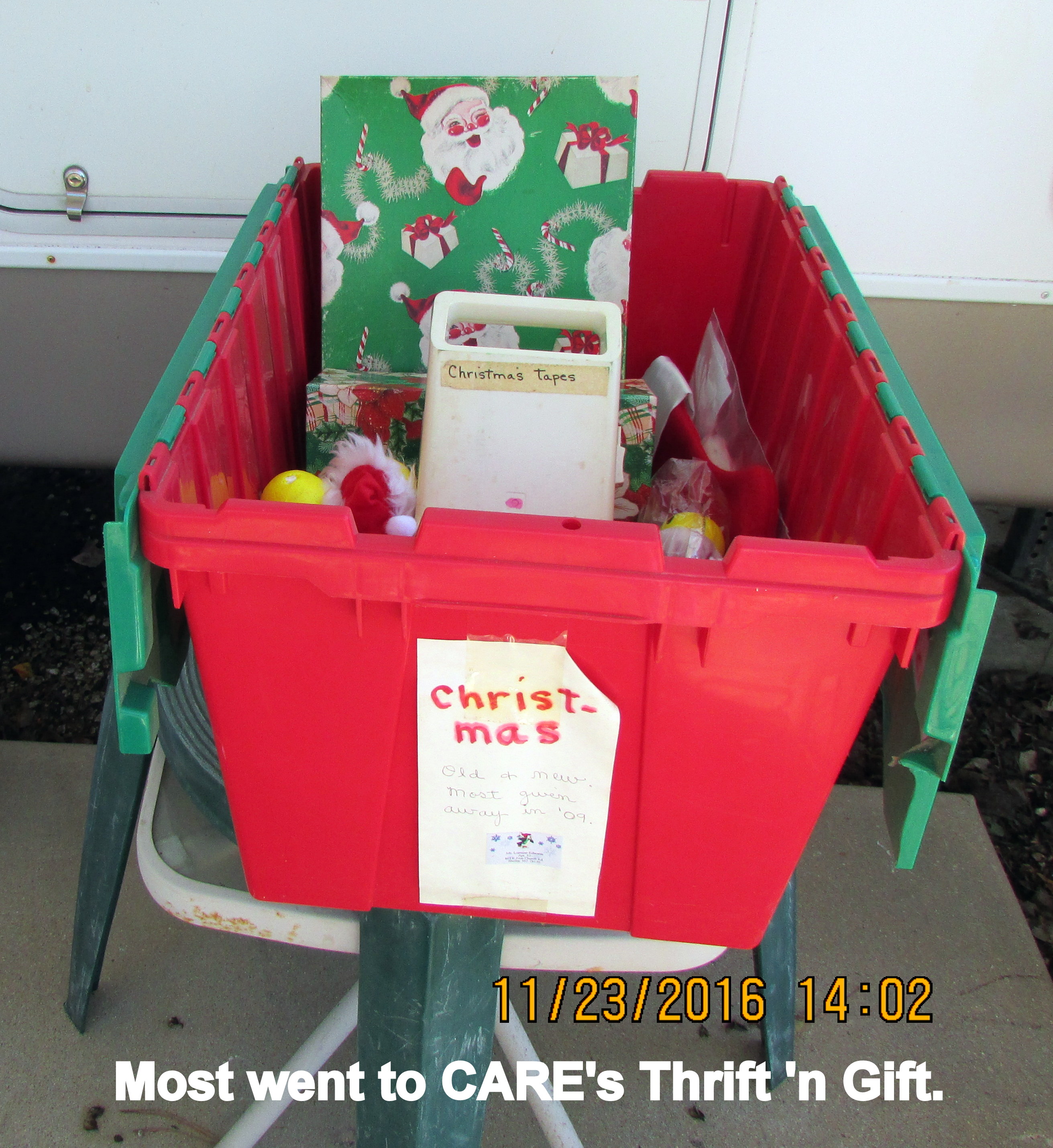 More than one-half inch of rain during the night but weather quickly warmed up. “Procrastinate no more” was the message uppermost in my thinking. I can’t use “too hot” or “too cold” as an excuse for not tackling the things stored in a mini-storage (down the highway). I failed to take a picture of the load in the back of the KIA. “Tis the season” so I focused on boxes containing Christmas items.