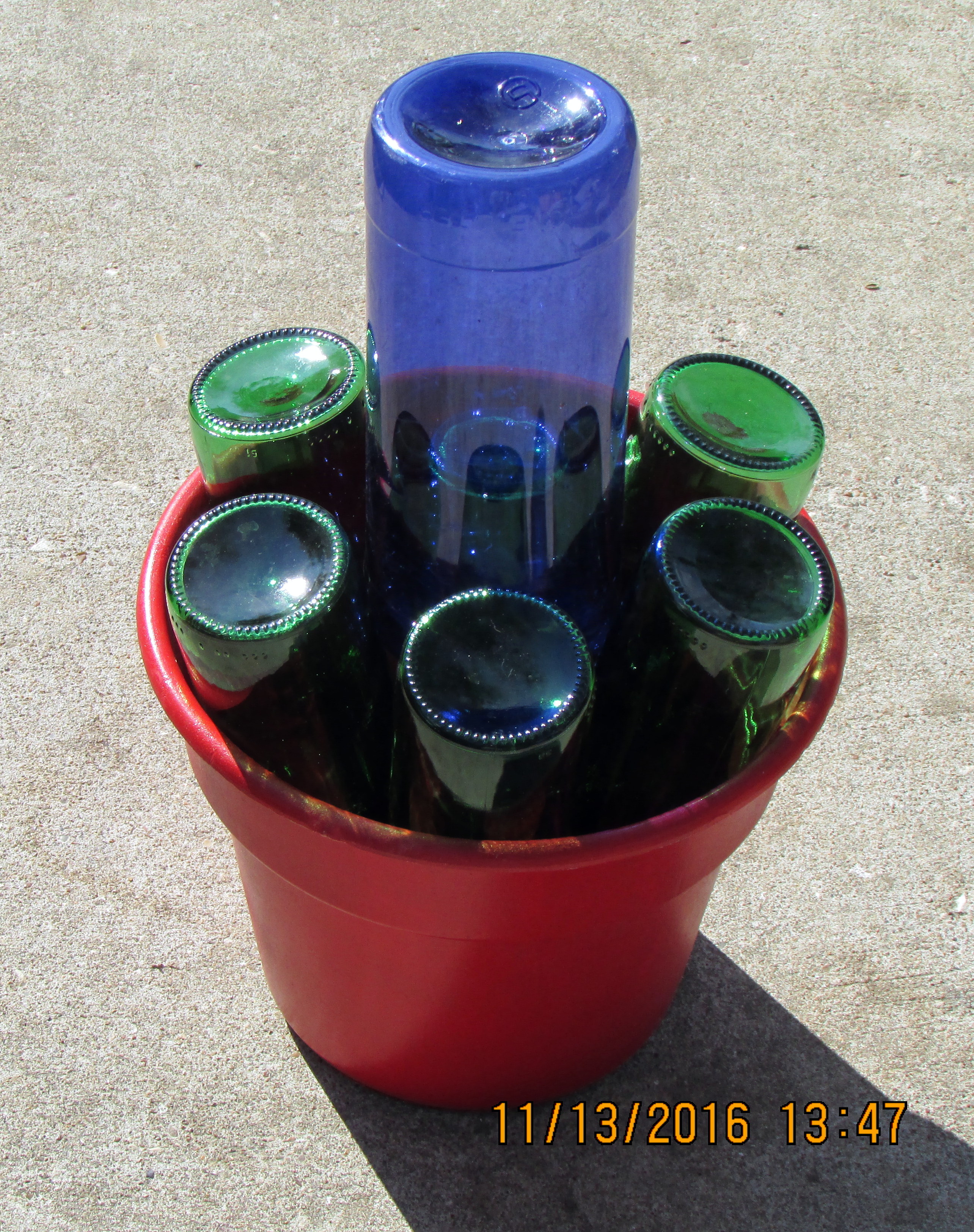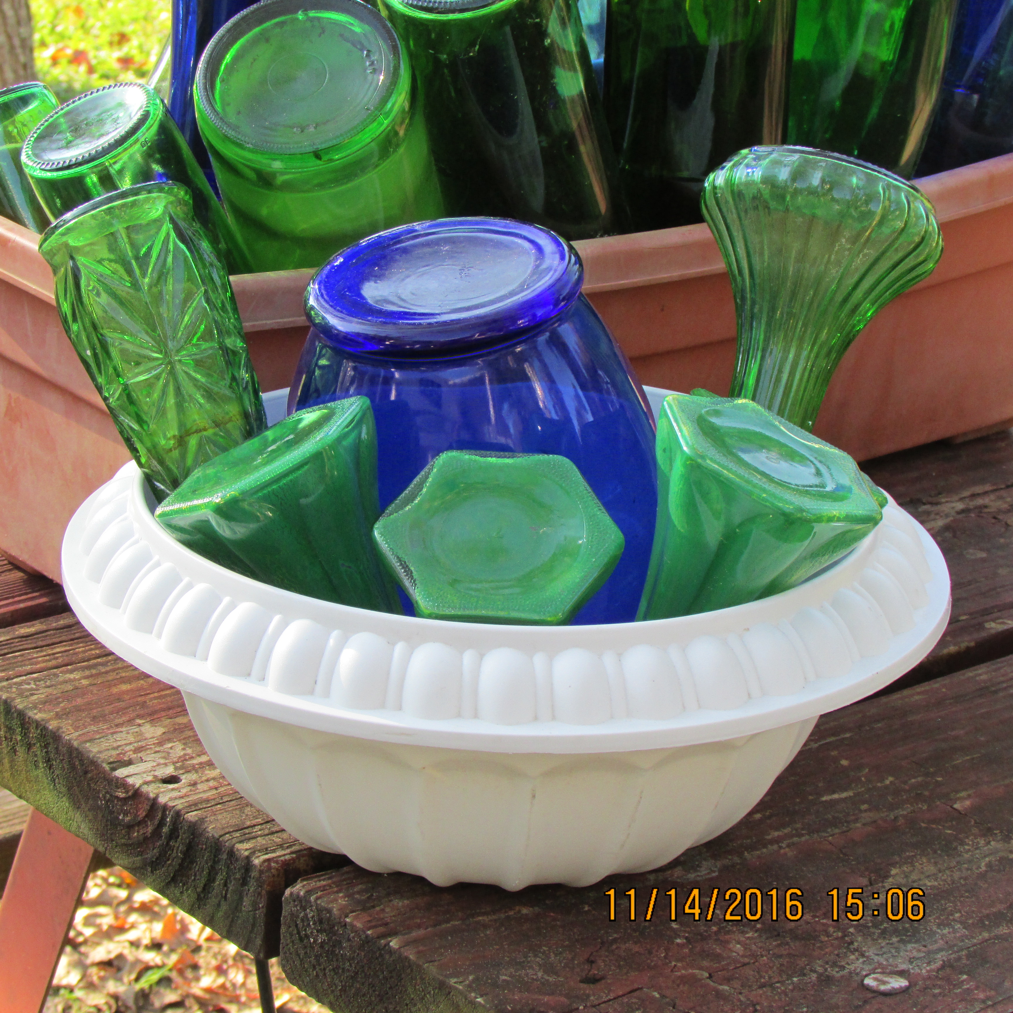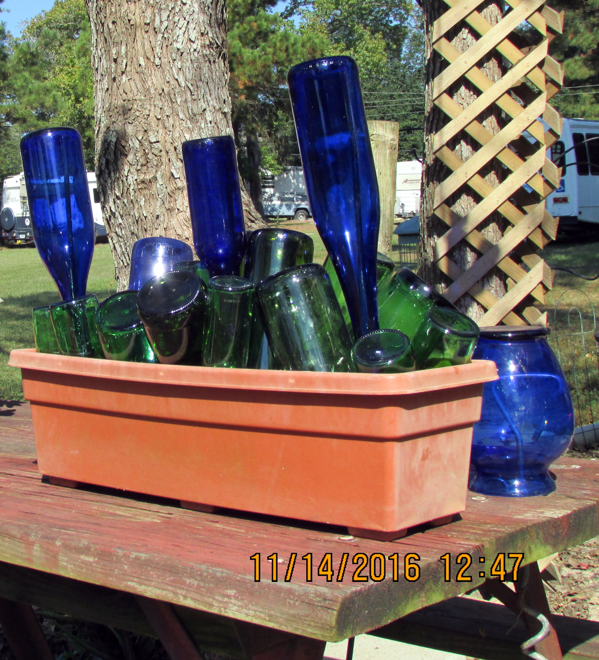 By necessity, I was in Livingston to have the KIA inspected before paying my annual vehicle renewal fee. Waiting, waiting, waiting…. Today’s only redeeming factor: A brief stop at the Habitat for Humanity thrift shop. Sadly, I never find colored bottles in thrift shops and very few colored vases. ~~ The new (used) bottles are sparking clean and the labels removed.