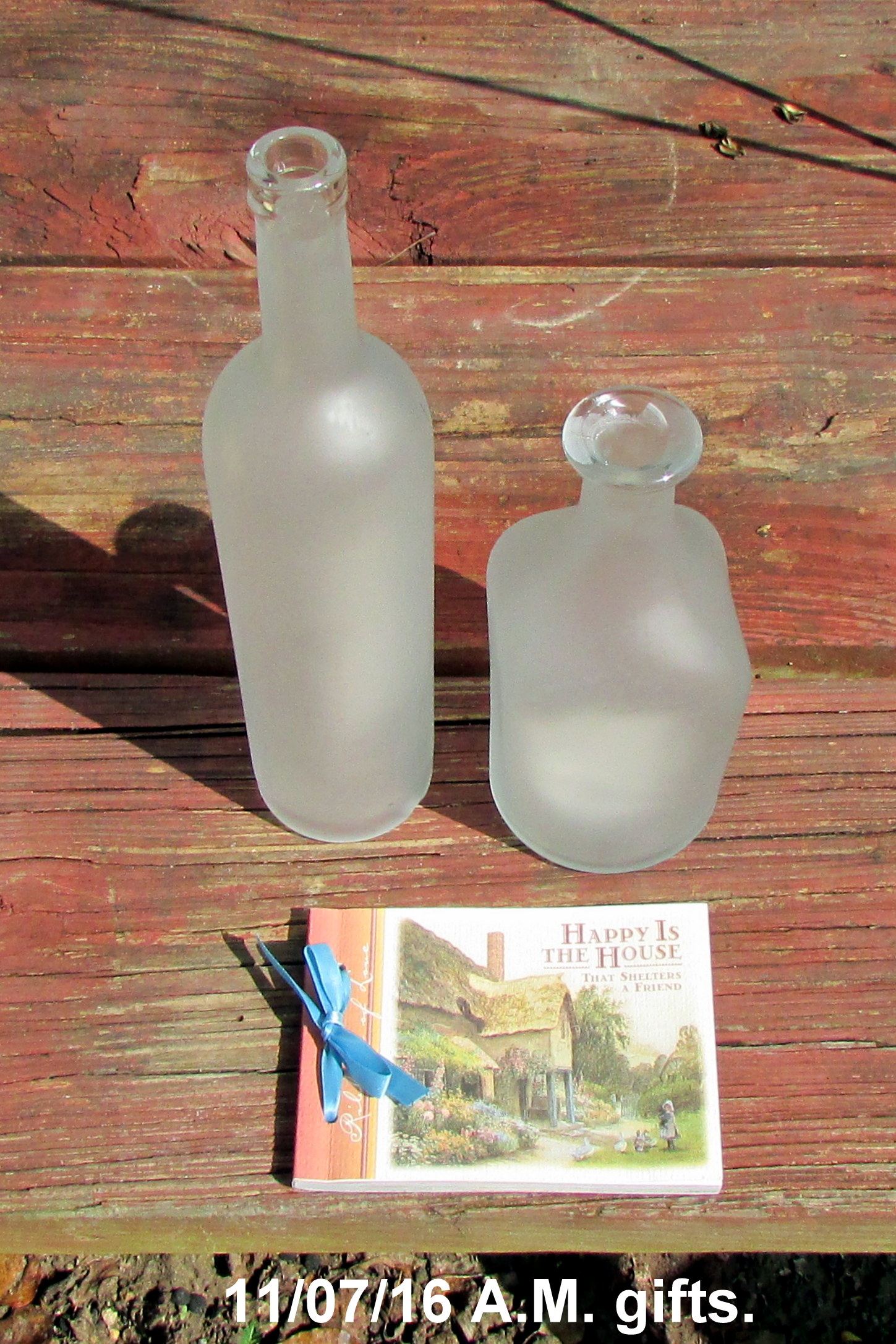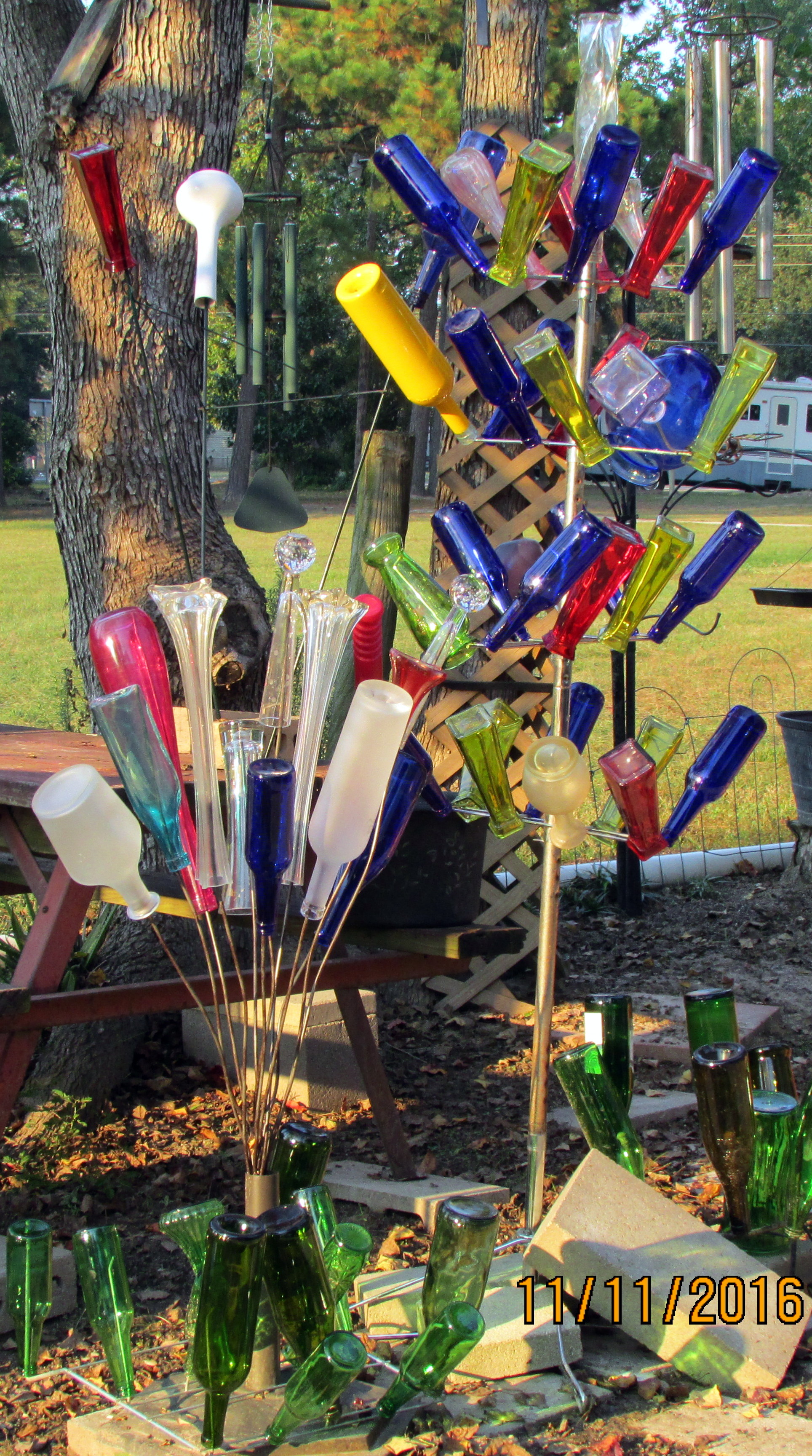 Late afternoon sunshine on my bottle tree and bottle bush. Aren’t they pretty? Roger drank the beer and returned the bottles. Blue and green glass replaced clear, and green, vases. I have more-than-enough; I can stop shopping the thrift stores!! (More-than-enough because, in due time, I’ll have eighteen more blue, and green bottles!!) ~~ Check this website for interesting Bottle Tree History. I like the narrative about colored bottles being the “poor man’s stained glass.” I ignore the superstitious stuff; that’s not a problem for me.