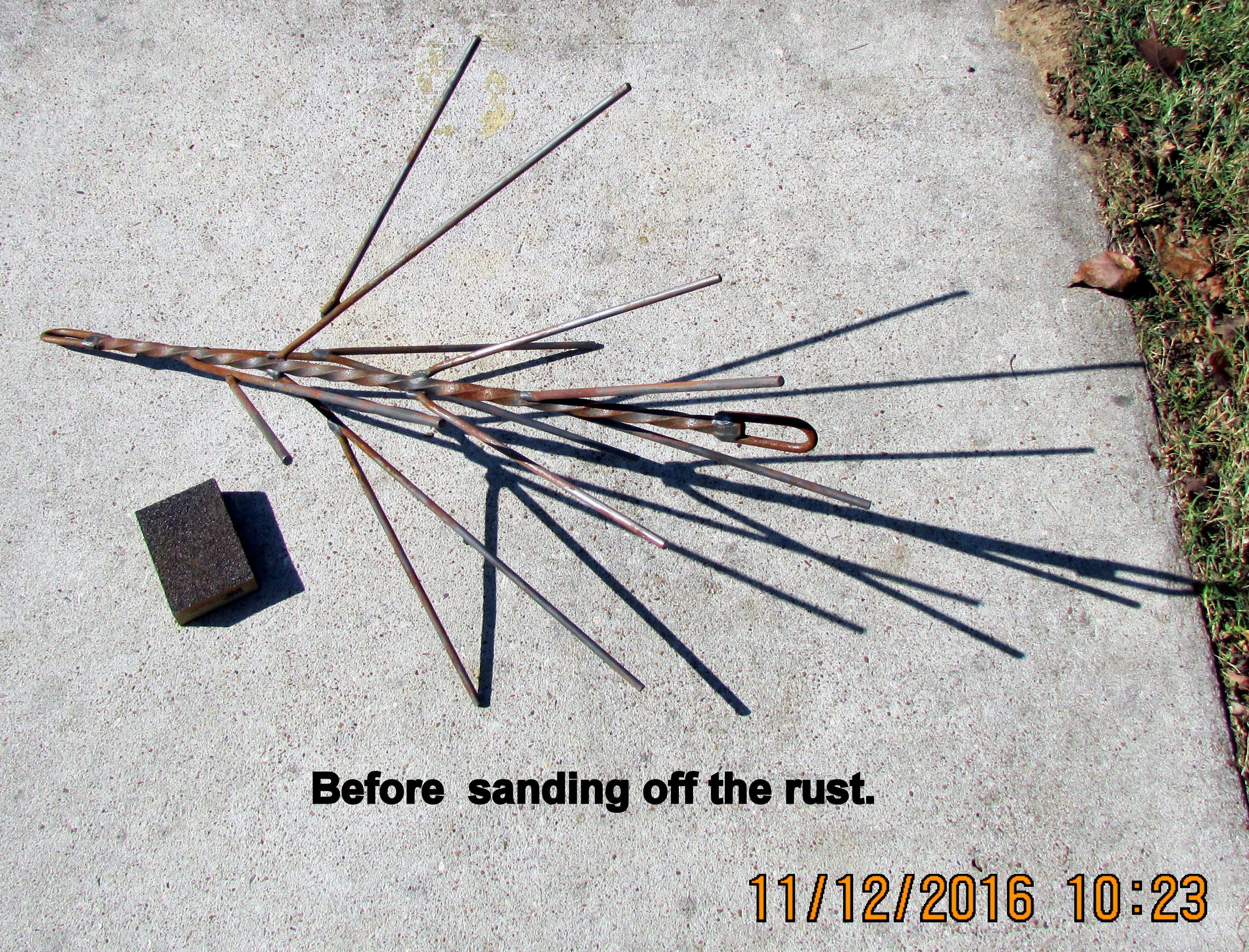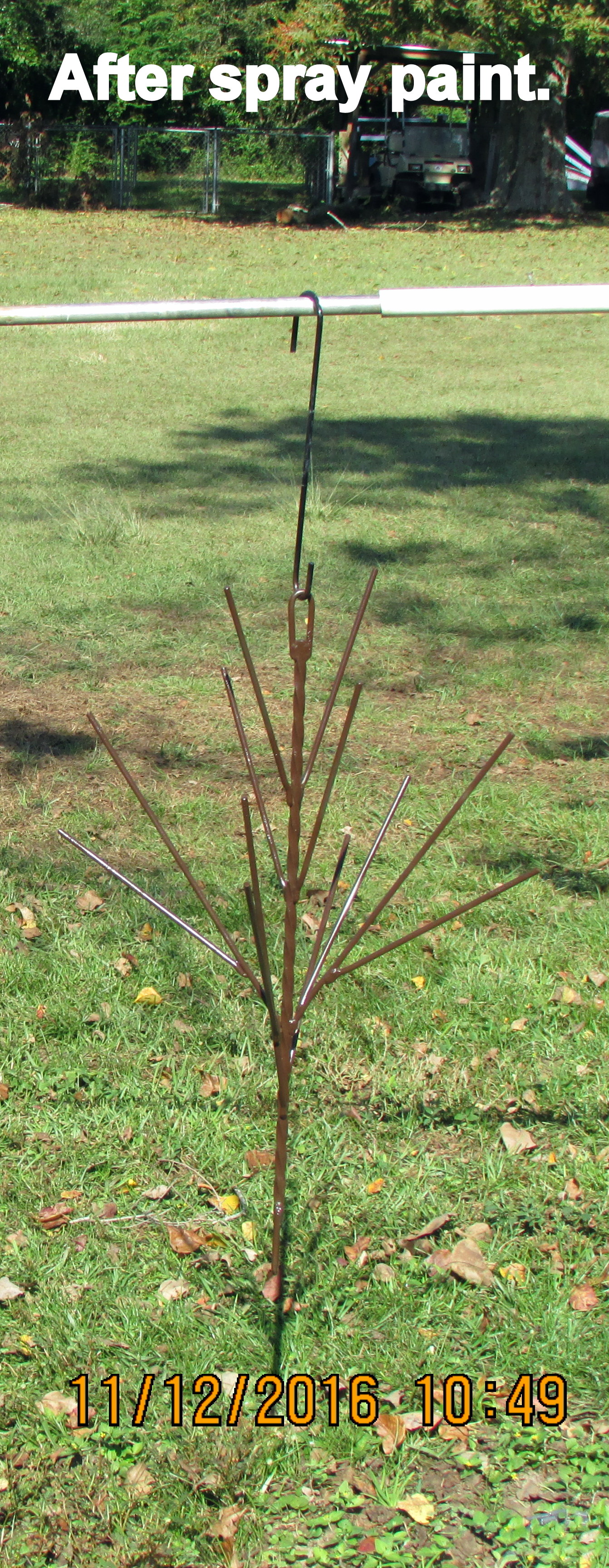 I took down the red, white and blue display (in the neighbor”s yard). Before hanging it in my “yarden,” I sanded off the rust and sprayed a protective coat of Rust-Oleum. (With 20/20 hindsight, I should have spray painted before I hung it the first time!! “Too soon old, too late smart!”)