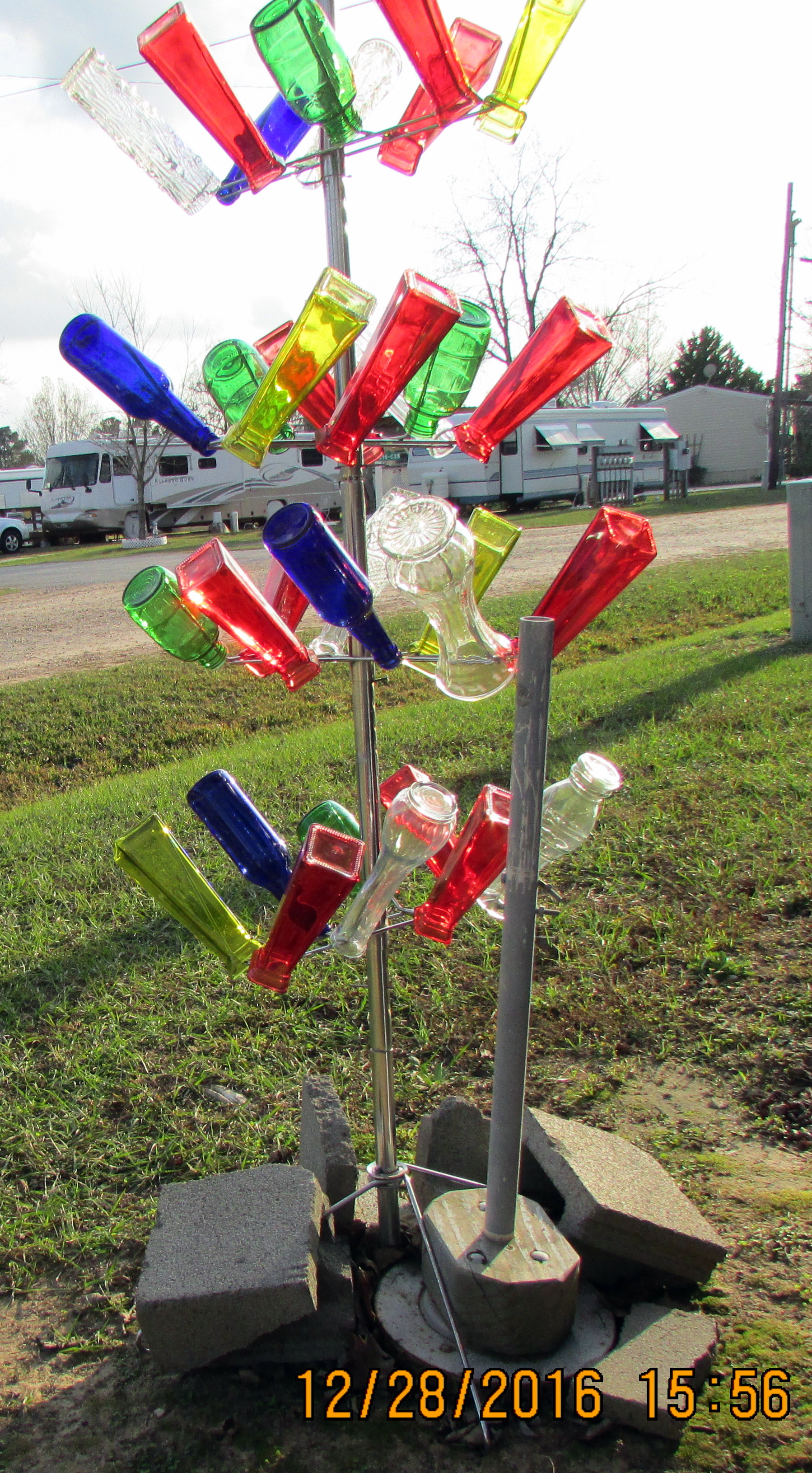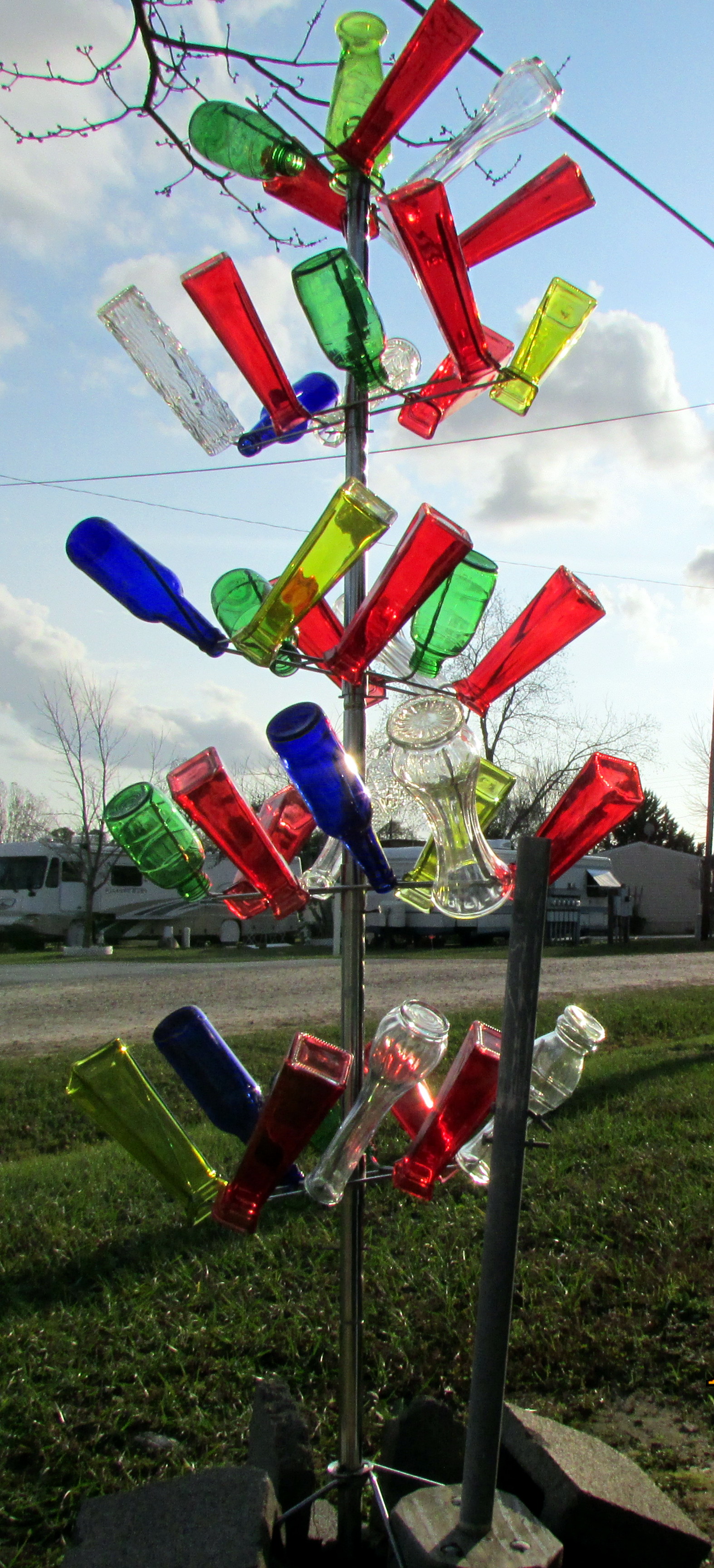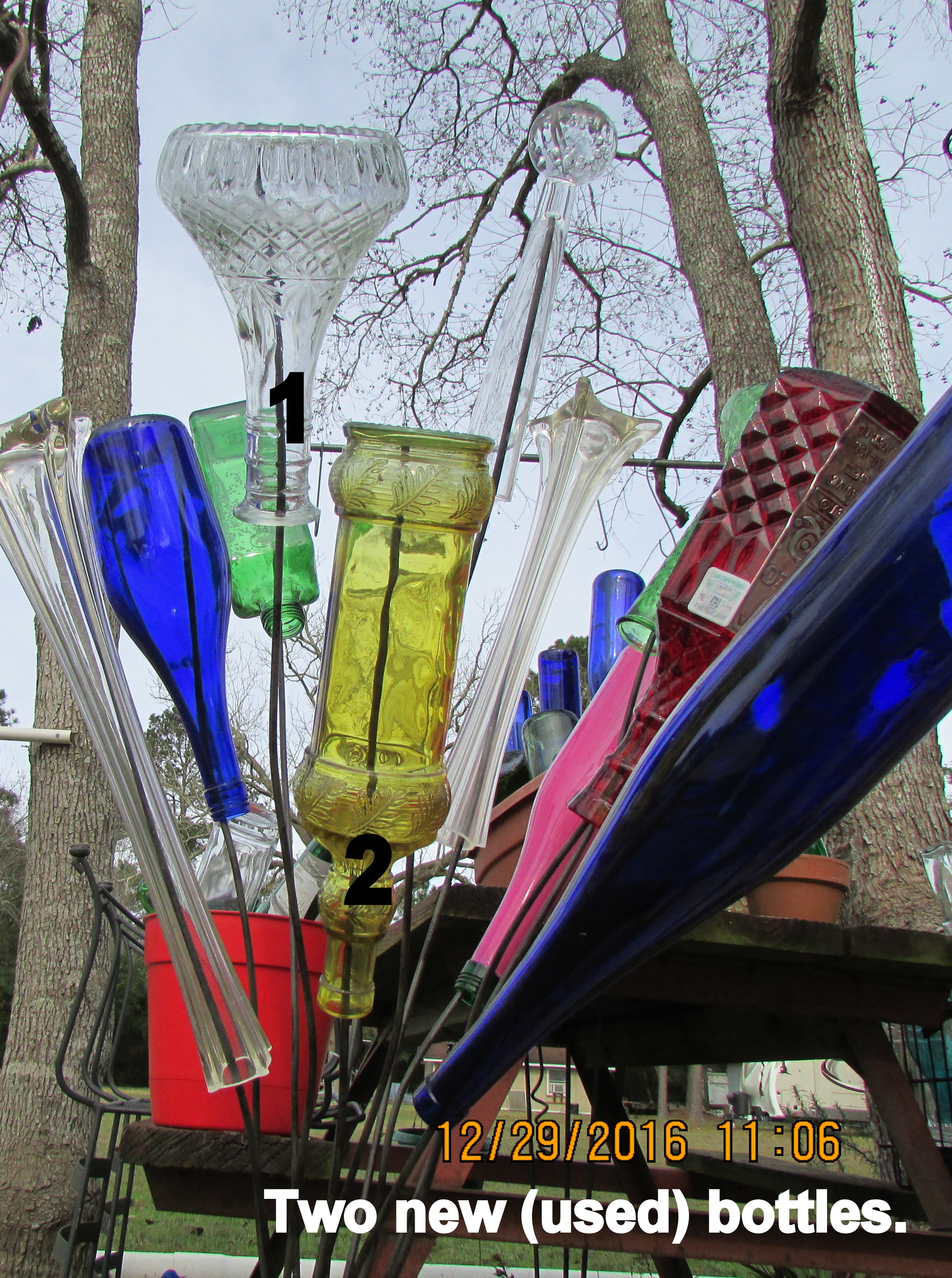 Postscript, 10:00 AM: I regret getting out of bed this morning!! I went to the dining room for coffee and “a couple of good deeds.” Conversations took a negative turn and I was in a very hostile environment!! Unnamed (unknown) someone (or several someones) think my bottle trees and bottle bushes are “trashy” and should not be allowed. The topic will come up in our next resident’s meeting. Someone (or several someones) tore my labels off several glass bottles of olive oil and vinegar. I had attached a label saying “please save bottle for Lorraine.” (Too bad I don’t have some of the wine I purchased [and gave away] because I’m tempted to drown my sorrows!! Wine recipients returned the pretty bottles.)