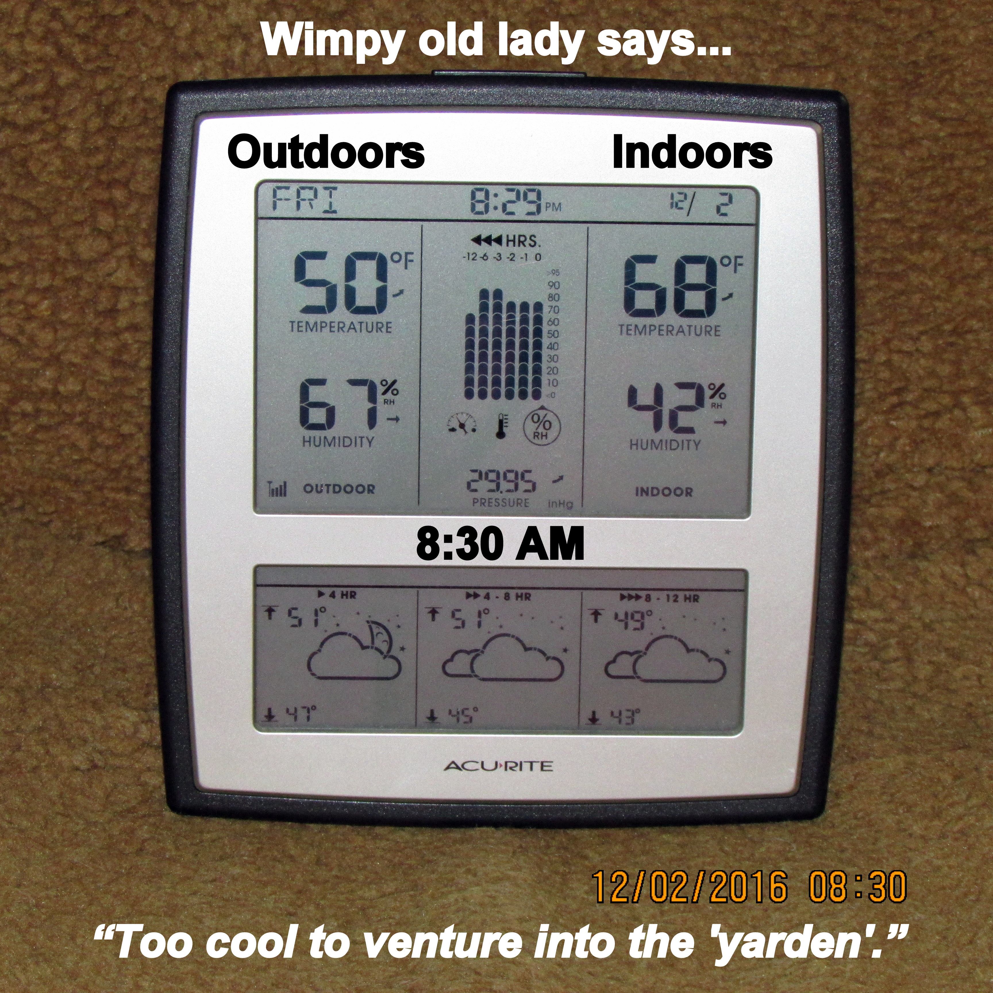 Shiver, shiver… Dec2 by Lorraine Frantz Edwards Wimpy old lady ventured out–wearing a coat–but quickly returned to the warm trailer. She wanted to “check” the Christmas Bottle Tree. (Warm trailer and the computer.) Share this: Click to share on X (Opens in new window) X Click to share on Facebook (Opens in new window) Facebook Like Loading...