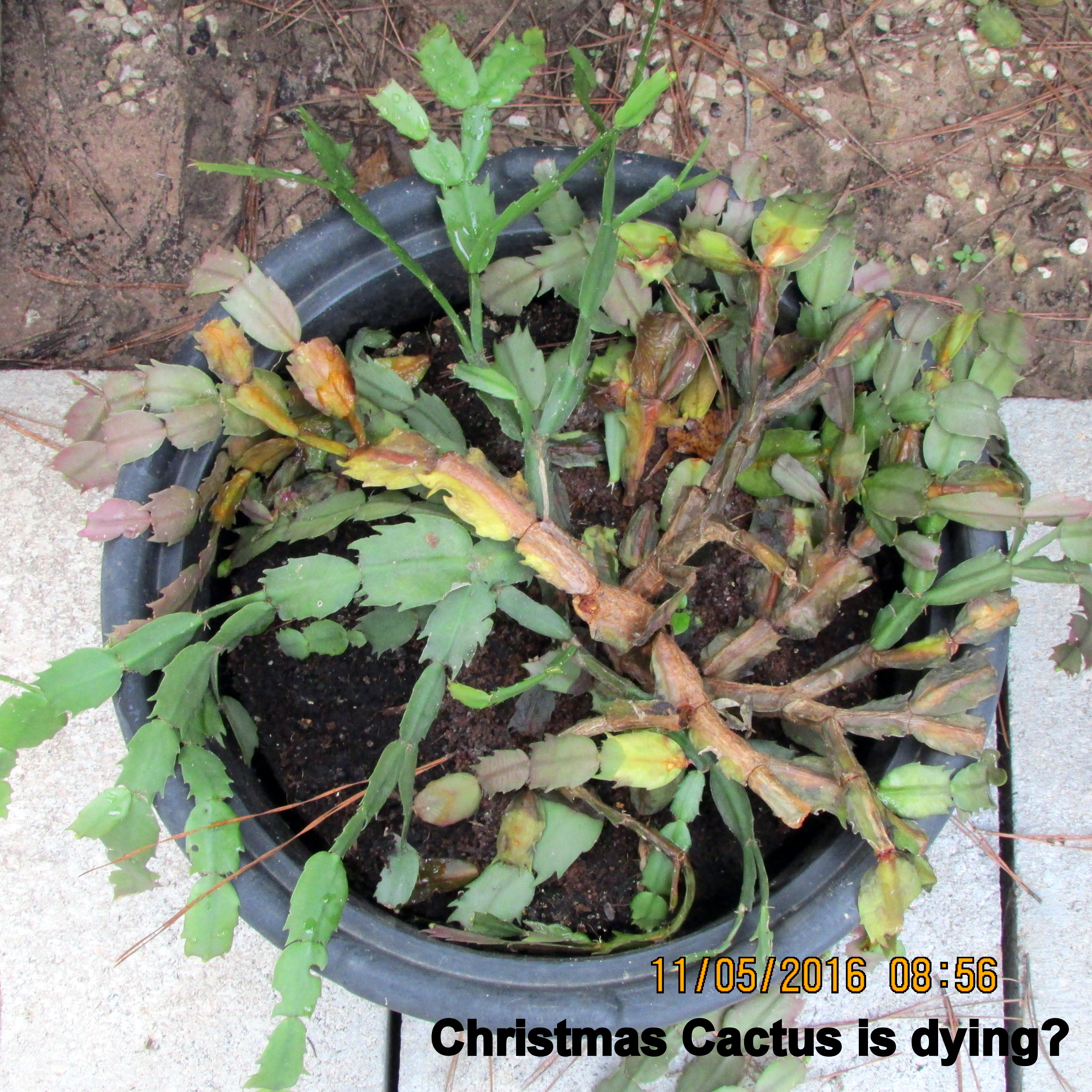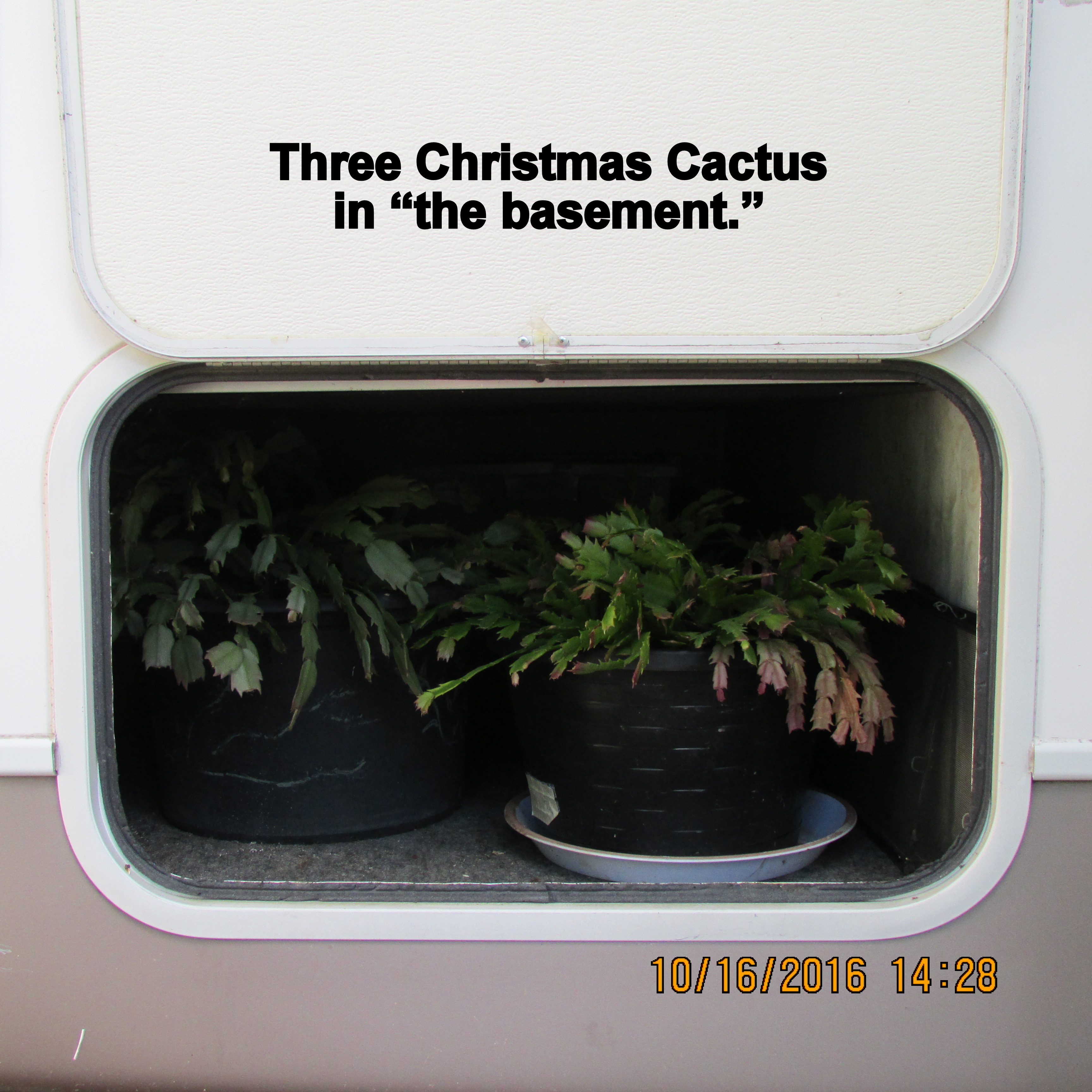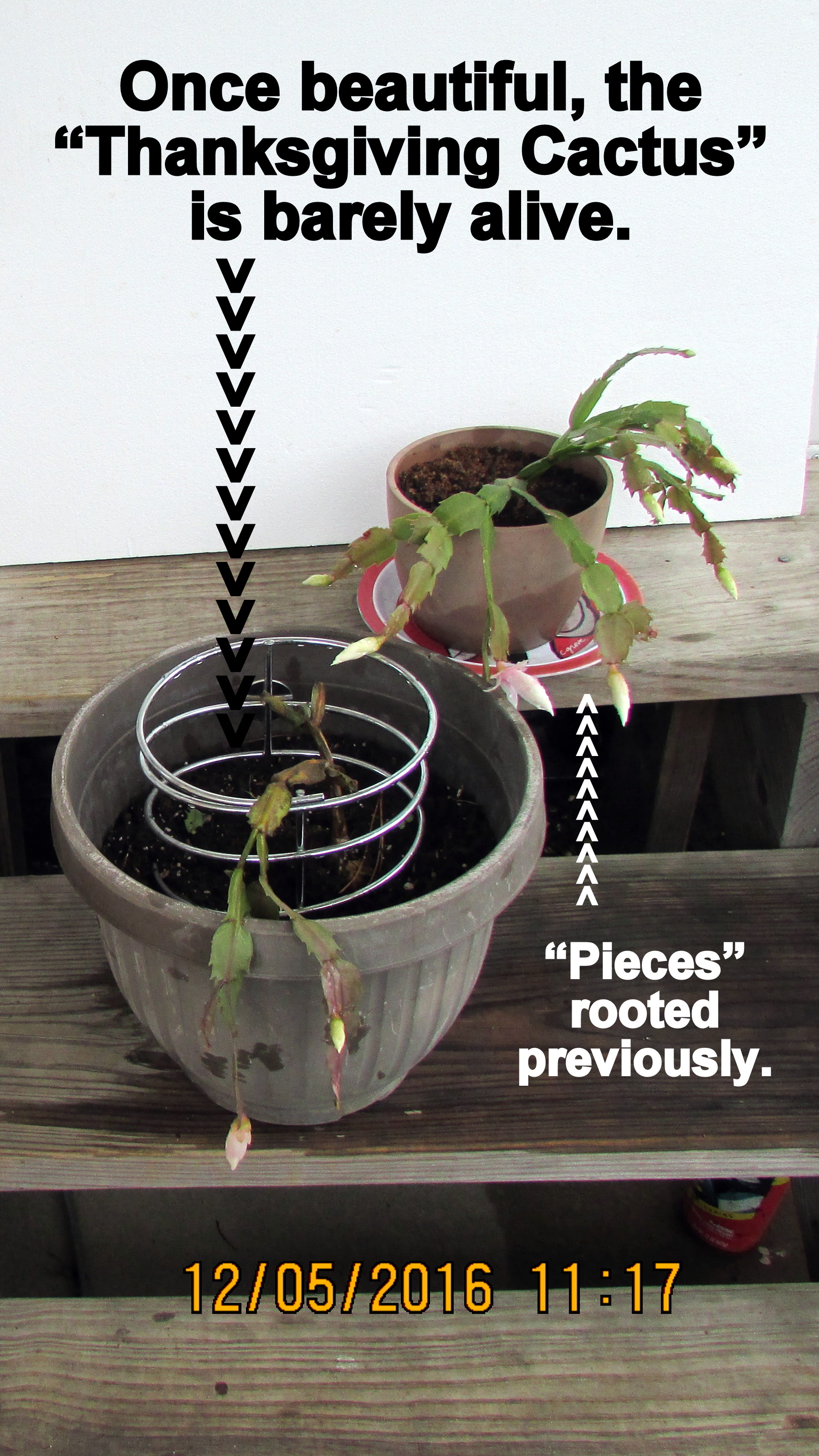 Early afternoon, October 16th, I moved three Christmas Cactus into “the basement” of my trailer home. I’d heard of need to put them in the dark so checked the Internet for information. Here is one link. ~~ Actually, the plants were probably already getting enough “dark” but I put in the basement before reading web sites. Less than three weeks later I observed that this cactus appeared to be dying. I planted a number of the broken branches–and hoped to revive the parent plant.